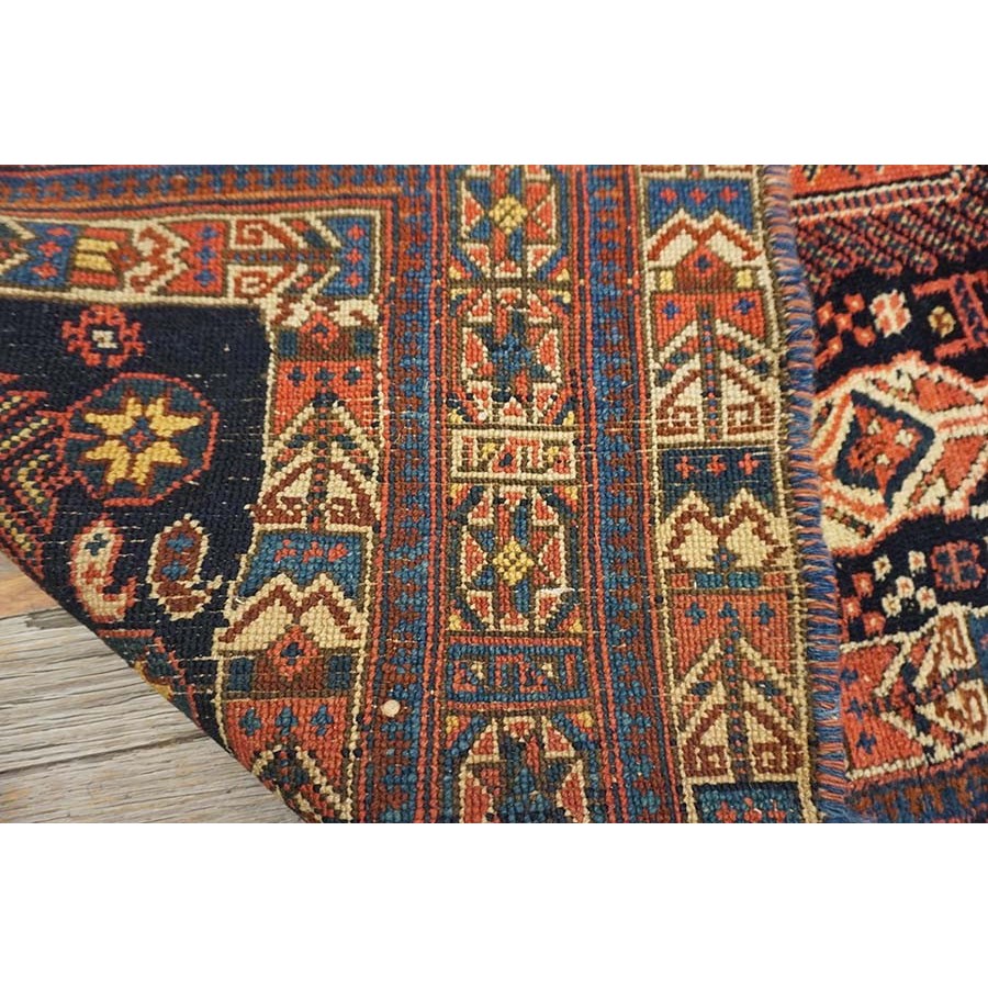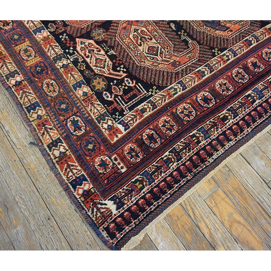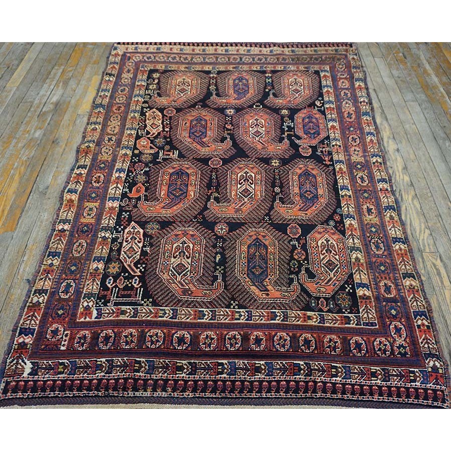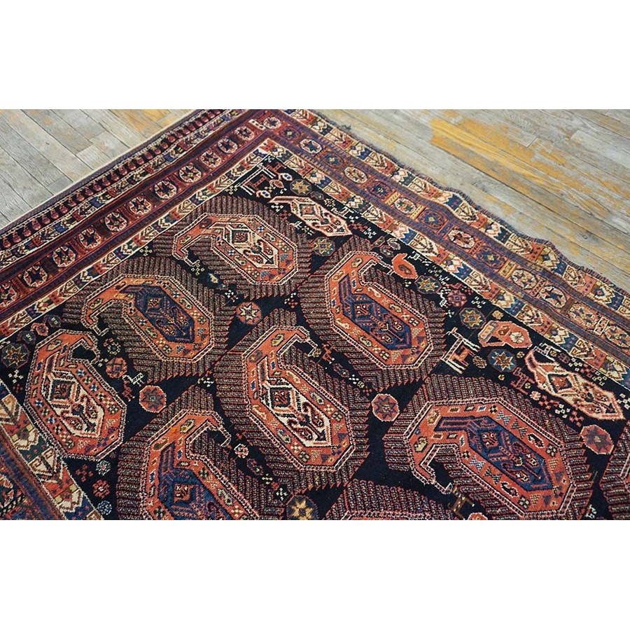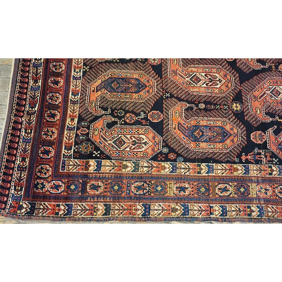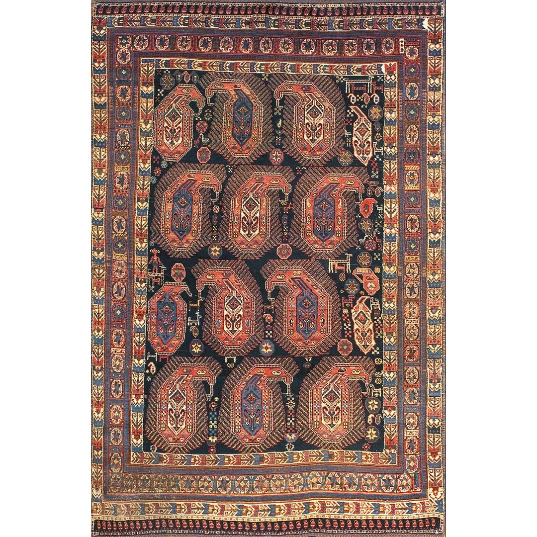 Botehs of all sizes fill the navy blue field of this c.1900 antique rug,. but especially giant fringed cones facing left and right. A few small animals add to the rustic informality of this carpet. The inner and outer ivory borders with geometric flowers are an Afshar touch.