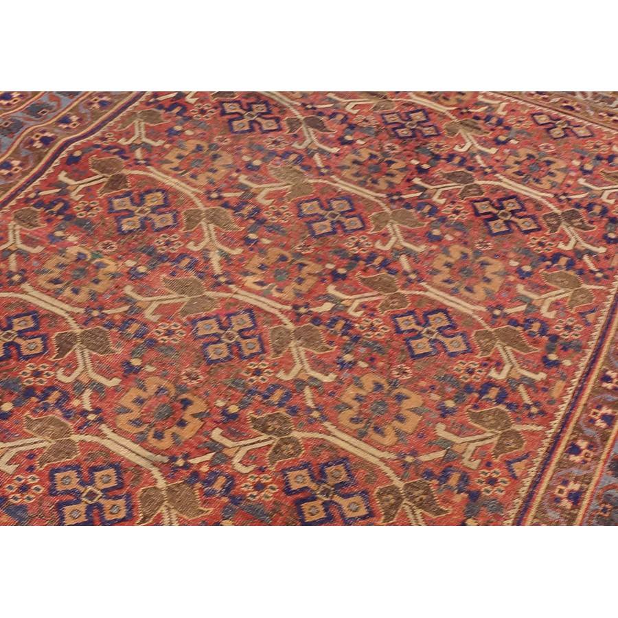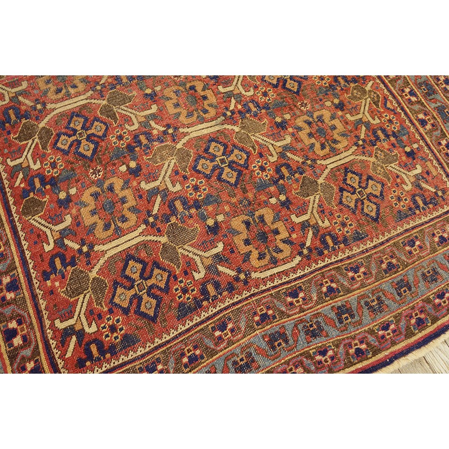 Afshar weavers excel at repurposing textile patterns as rug designs. In this case as rust ground displays cruciforms and rosettes nestled within an ivory arabesque lattice.The light blue major border of stylized palmettes provides a discreet frame to the whole.