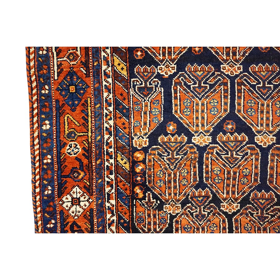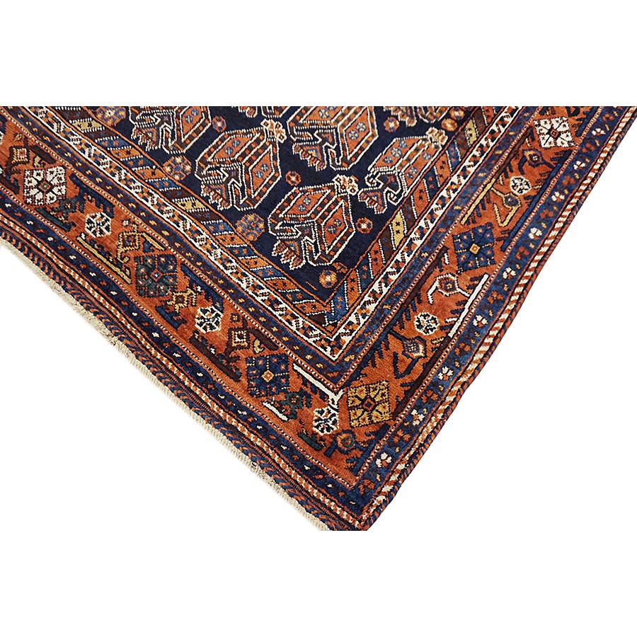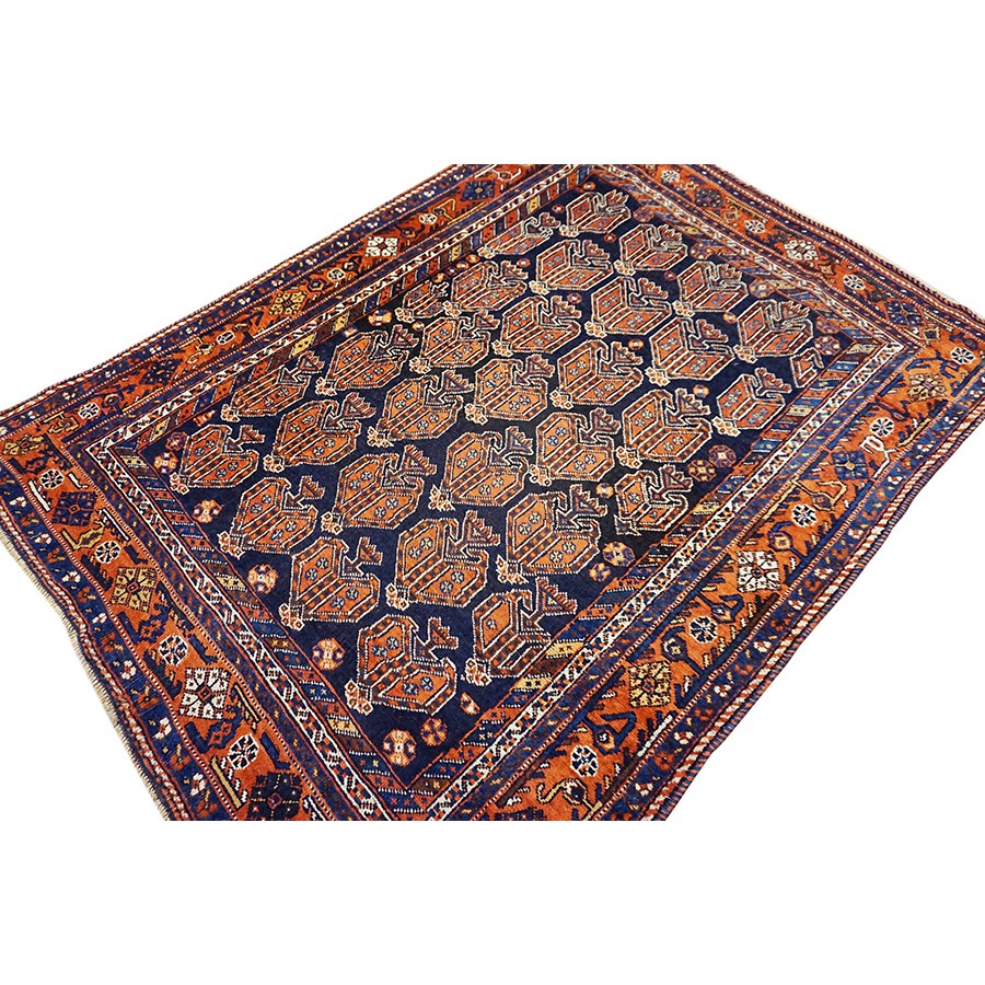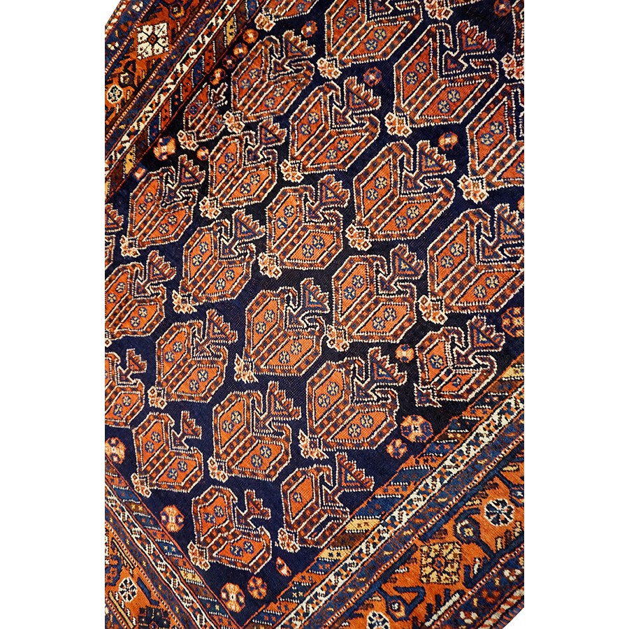 The tribal Afshar weavers of SE Persia love to employ the boteh or cone pattern and here these motives are paired back-to-back making heart shapes on a deep blue ground. The allover pattern is contained within a red floral main border.