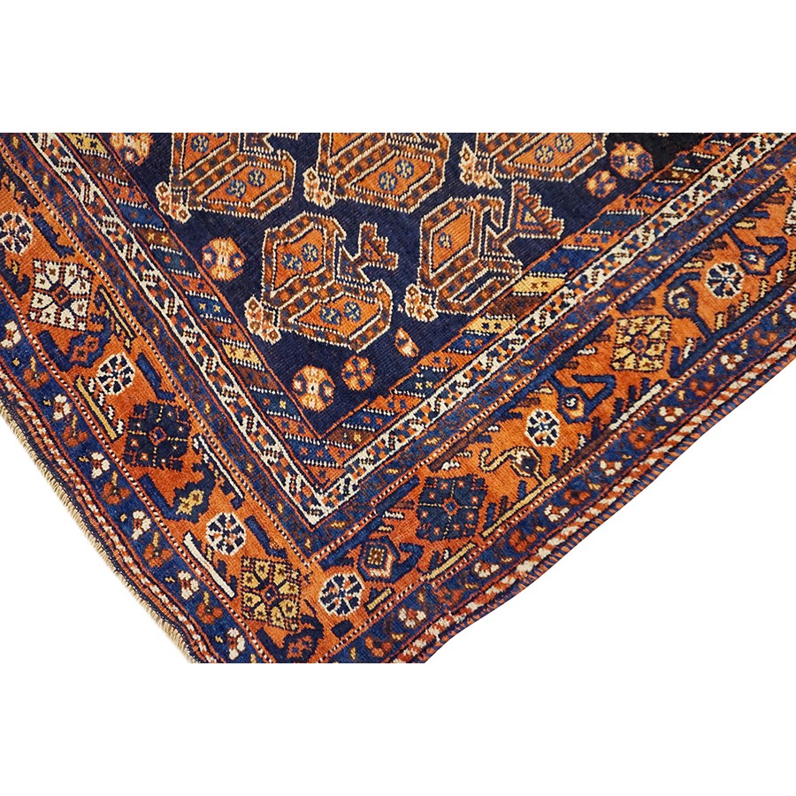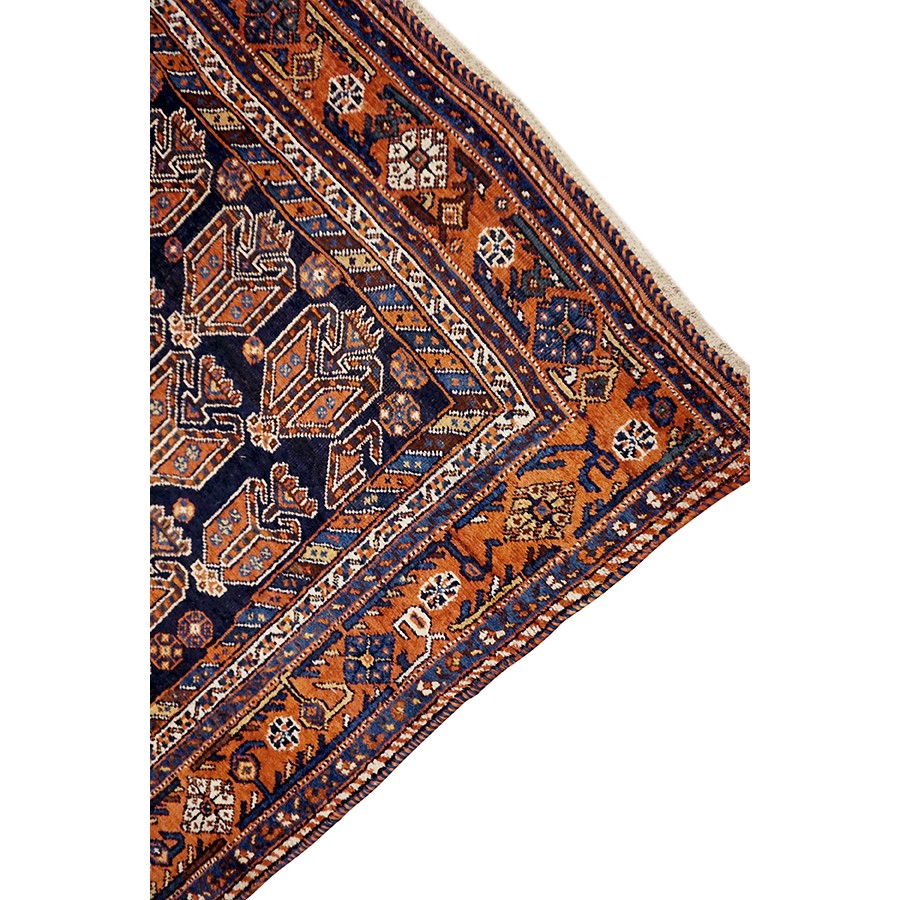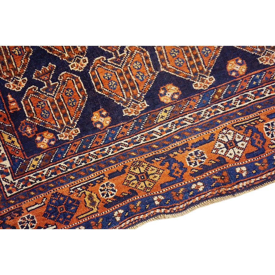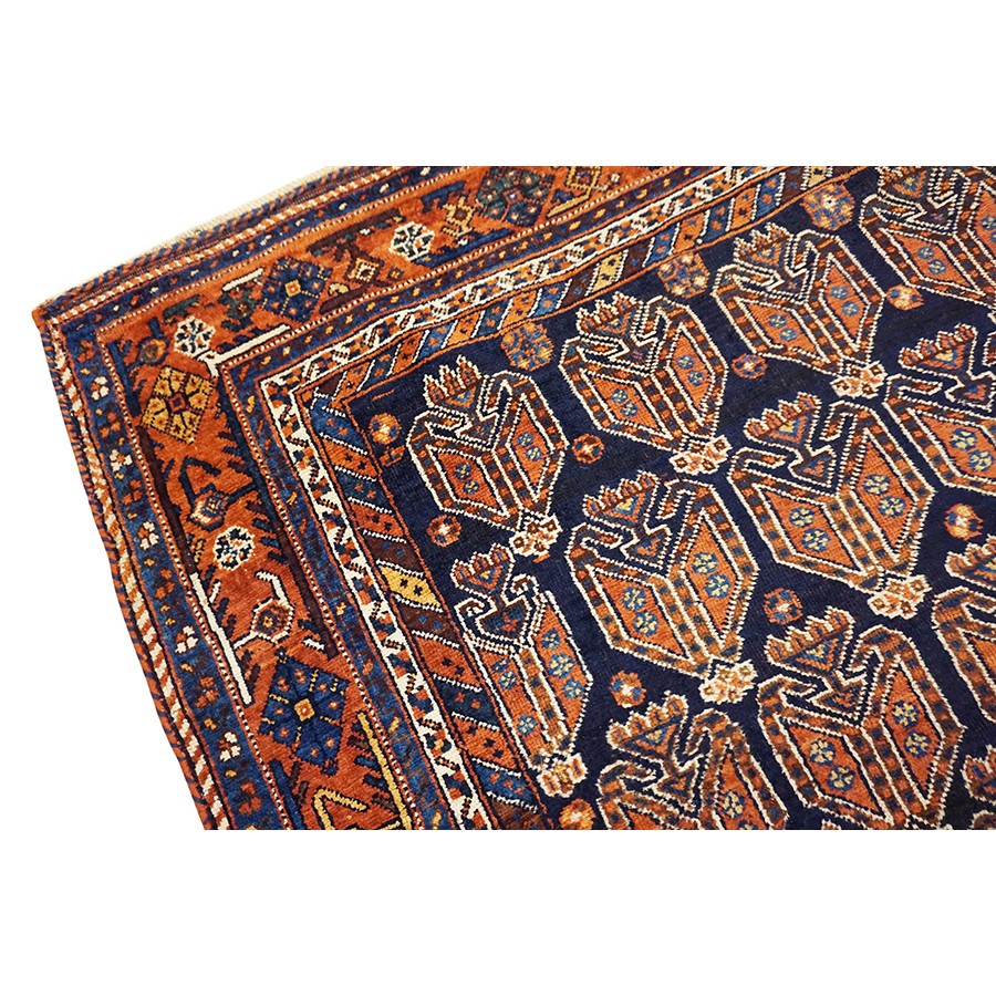The tribal Afshar weavers of SE Persia love to employ the boteh or cone pattern and here these motives are paired back-to-back making heart shapes on a deep blue ground. The allover pattern is contained within a red floral main border.