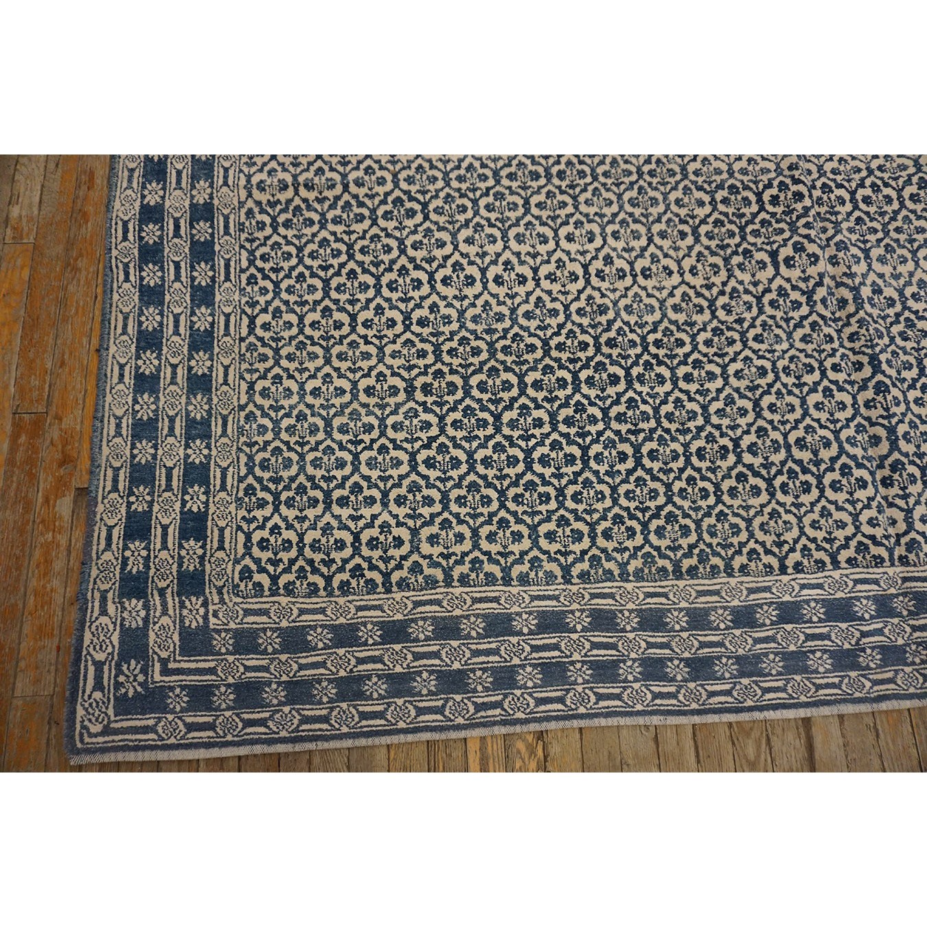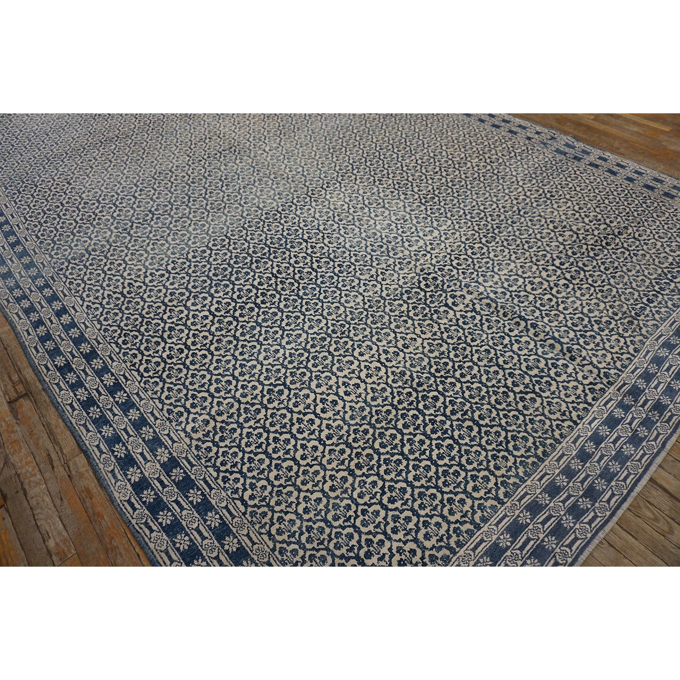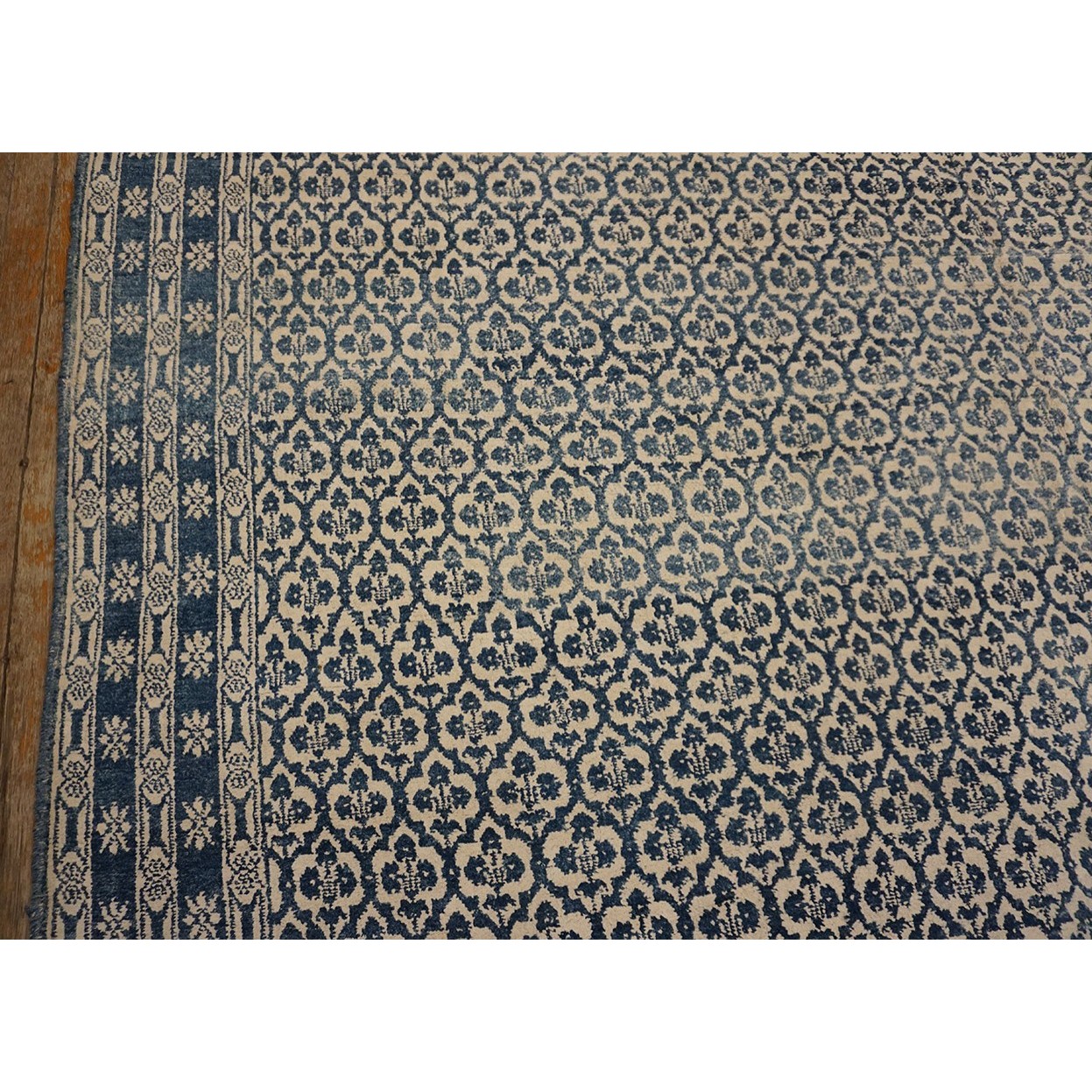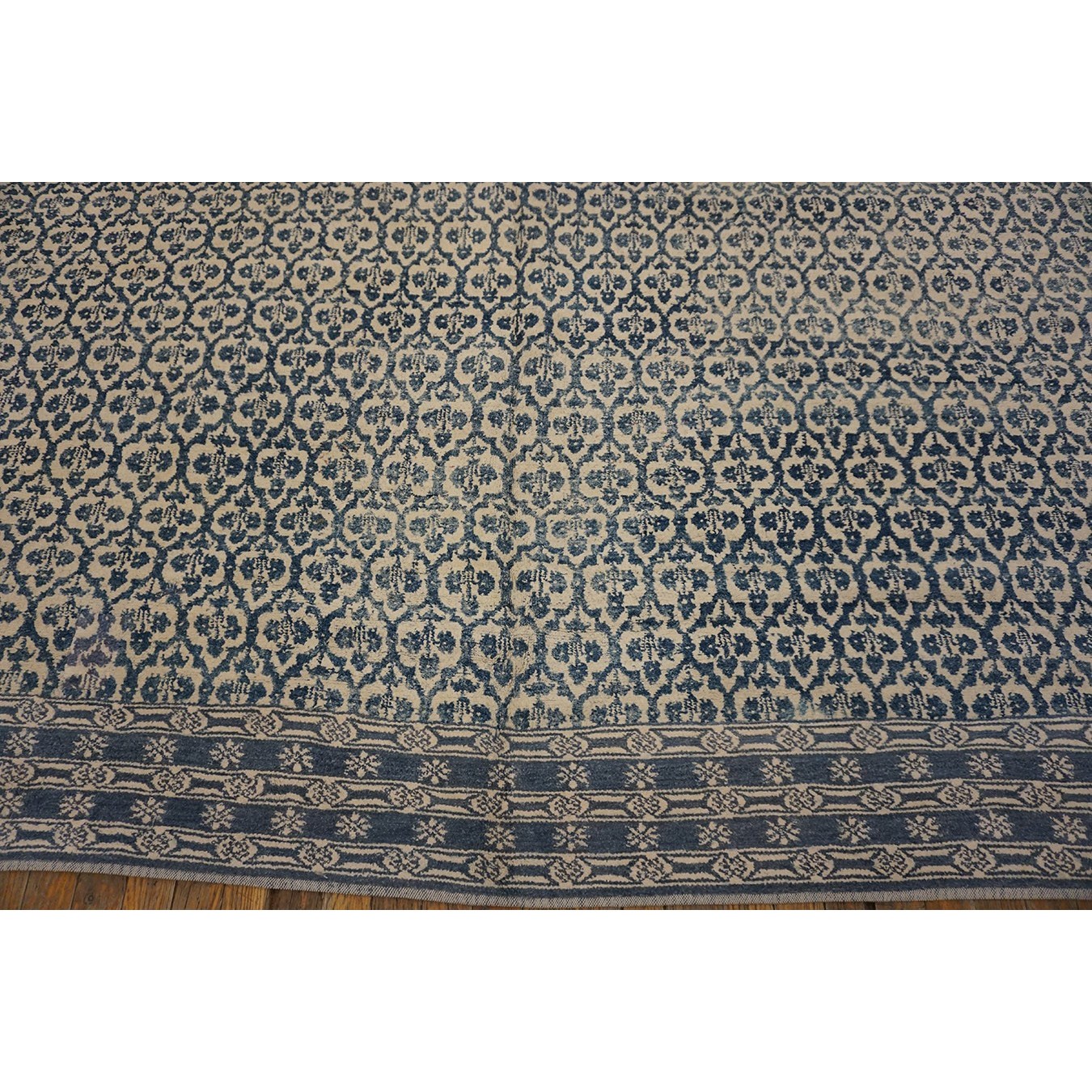 Interwar cotton Agra carpets often employ bi-tonal palettes, especially off white and medium blue, as here, with a very small honeycomb lattice whose cells each enclose a simplified four leaf plant. Five denim blue and ecru borders with star rosettes and oval rosettes. Good condition. Restrained color scheme. M