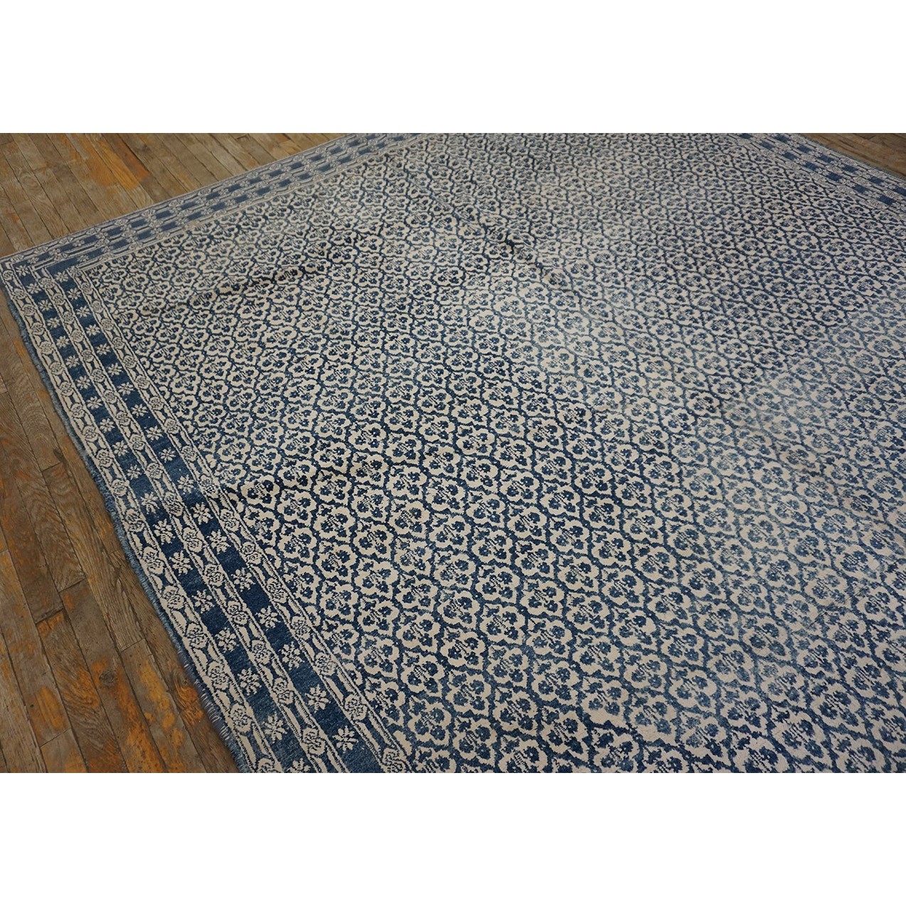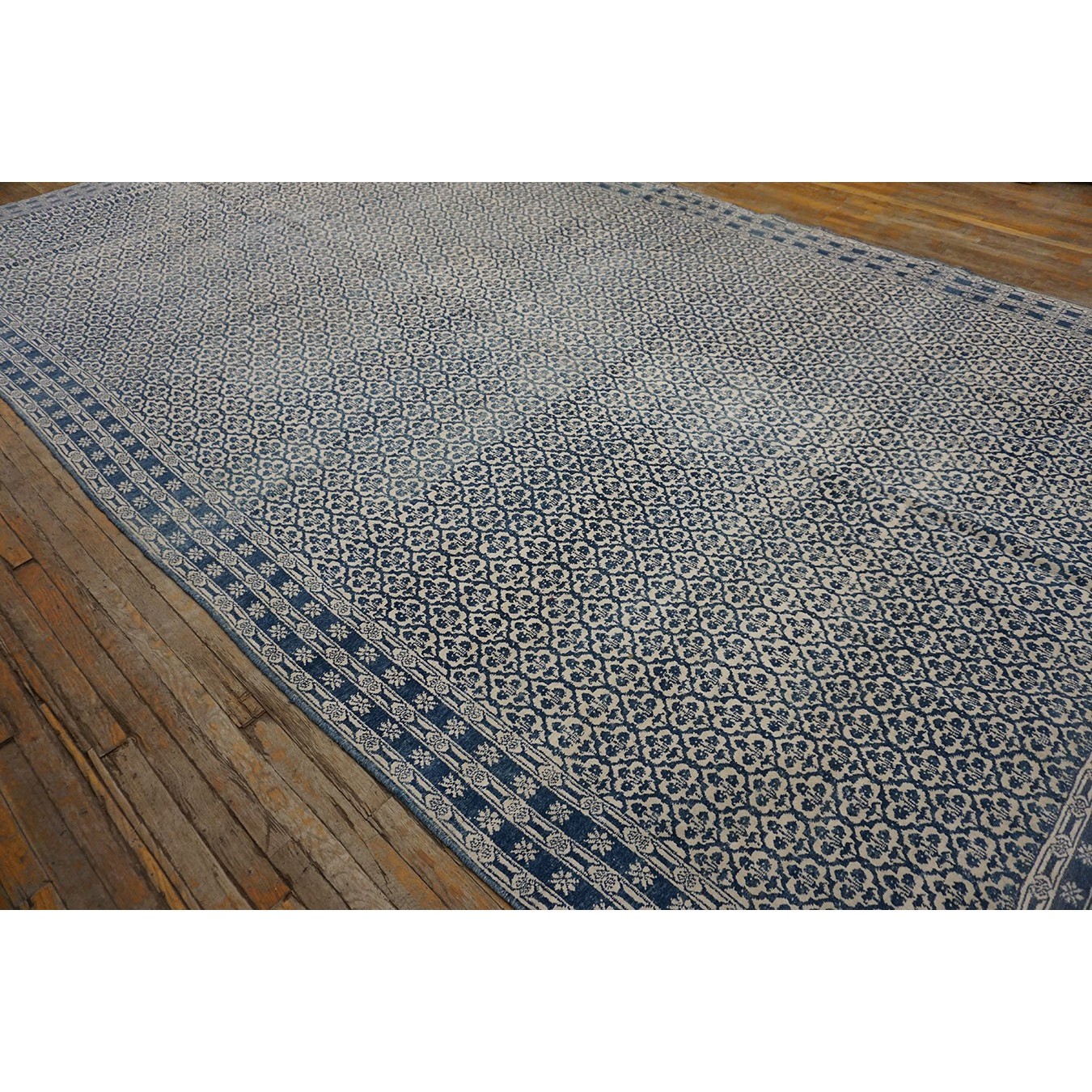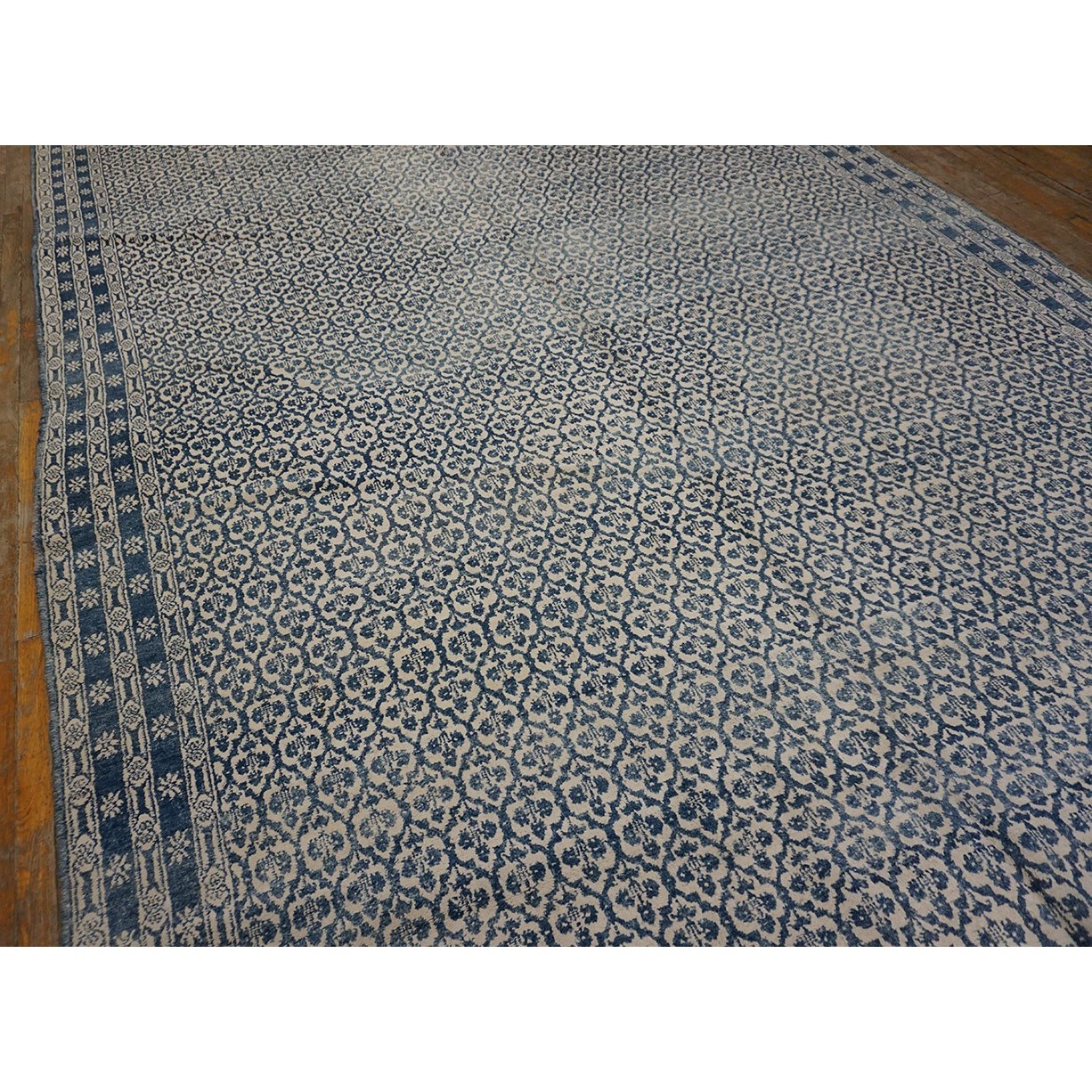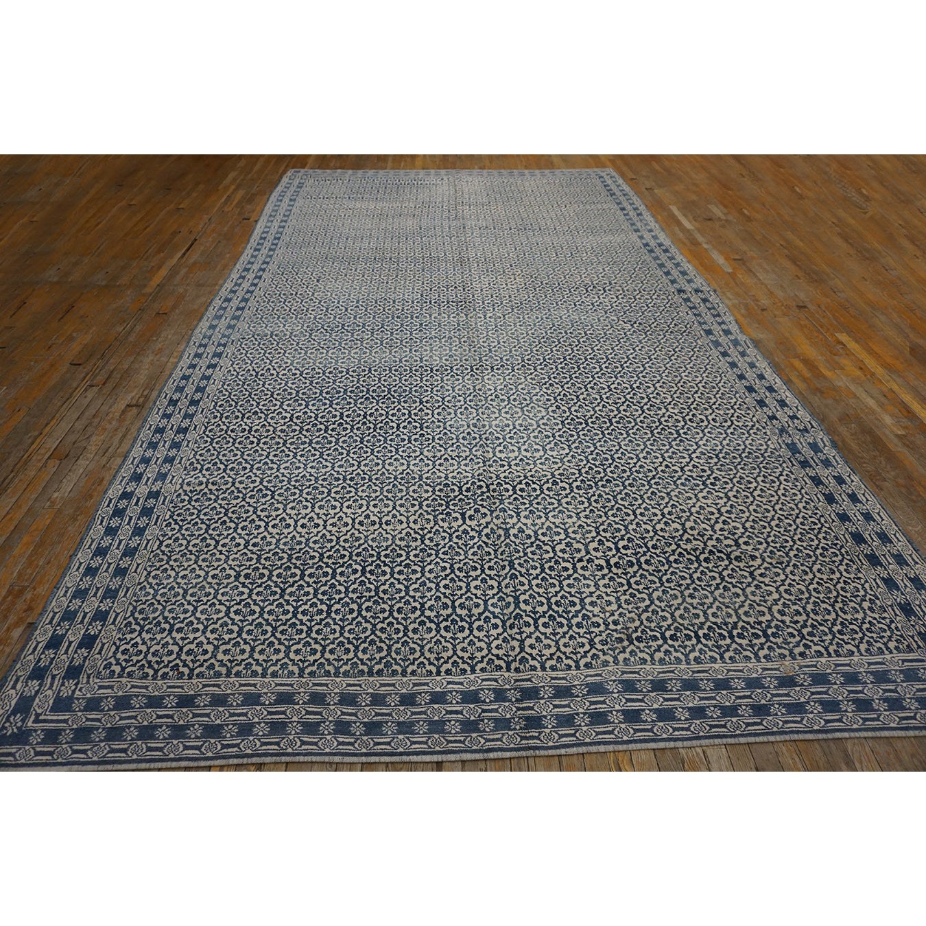 Interwar cotton Agra carpets often employ bi-tonal palettes, especially off white and medium blue, as here, with a very small honeycomb lattice whose cells each enclose a simplified four leaf plant. Five denim blue and ecru borders with star rosettes and oval rosettes. Good condition. Restrained color scheme. M