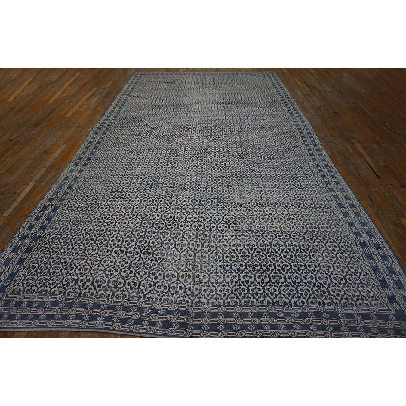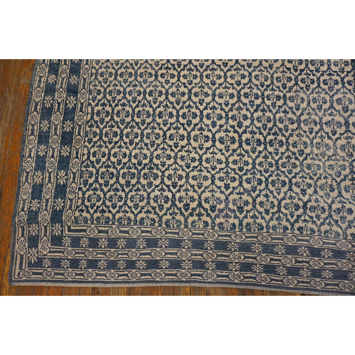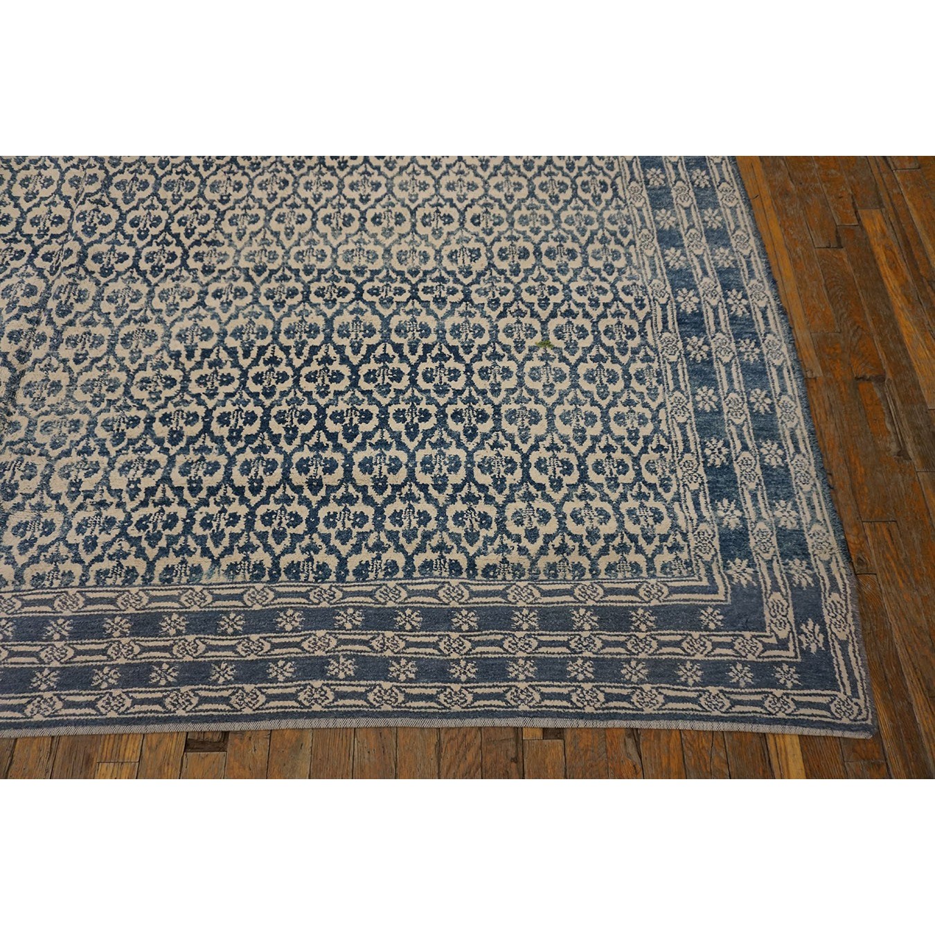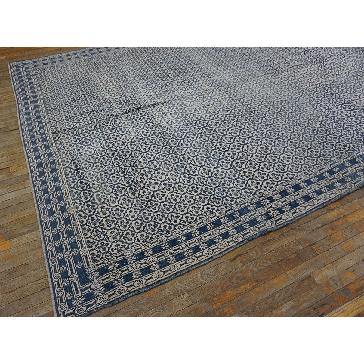 Interwar cotton Agra carpets often employ bi-tonal palettes, especially off white and medium blue, as here, with a very small honeycomb lattice whose cells each enclose a simplified four leaf plant. Five denim blue and ecru borders with star rosettes and oval rosettes. Good condition. Restrained color scheme. M