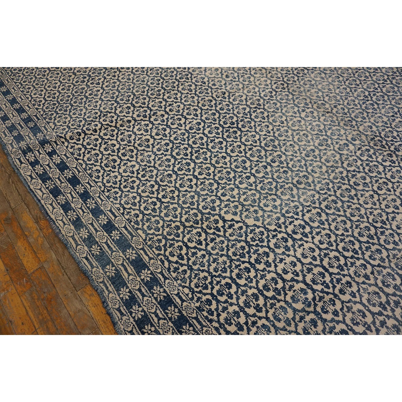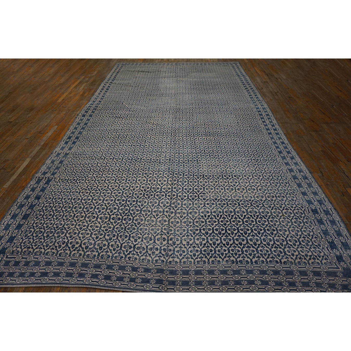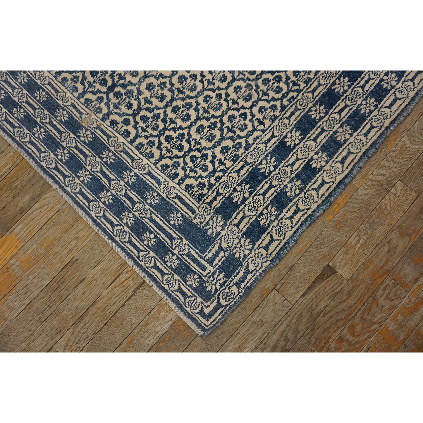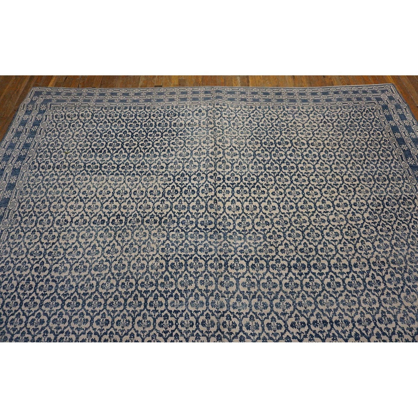 Interwar cotton Agra carpets often employ bi-tonal palettes, especially off white and medium blue, as here, with a very small honeycomb lattice whose cells each enclose a simplified four leaf plant. Five denim blue and ecru borders with star rosettes and oval rosettes. Good condition. Restrained color scheme. M