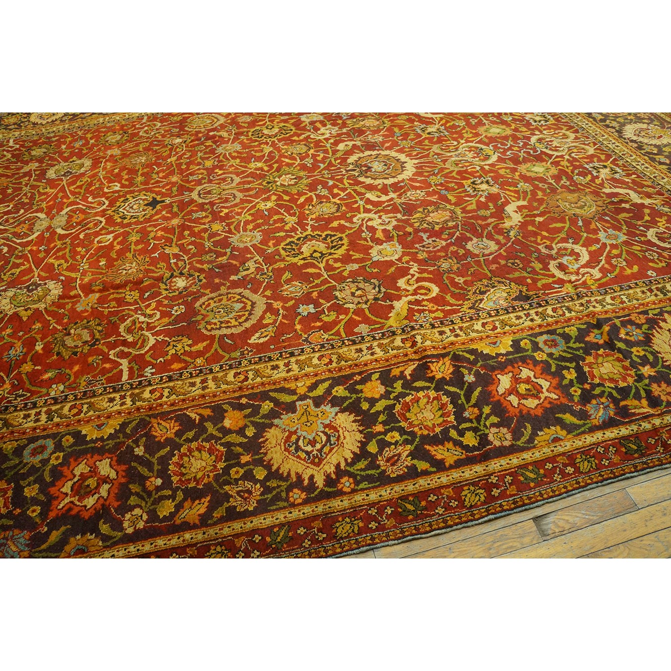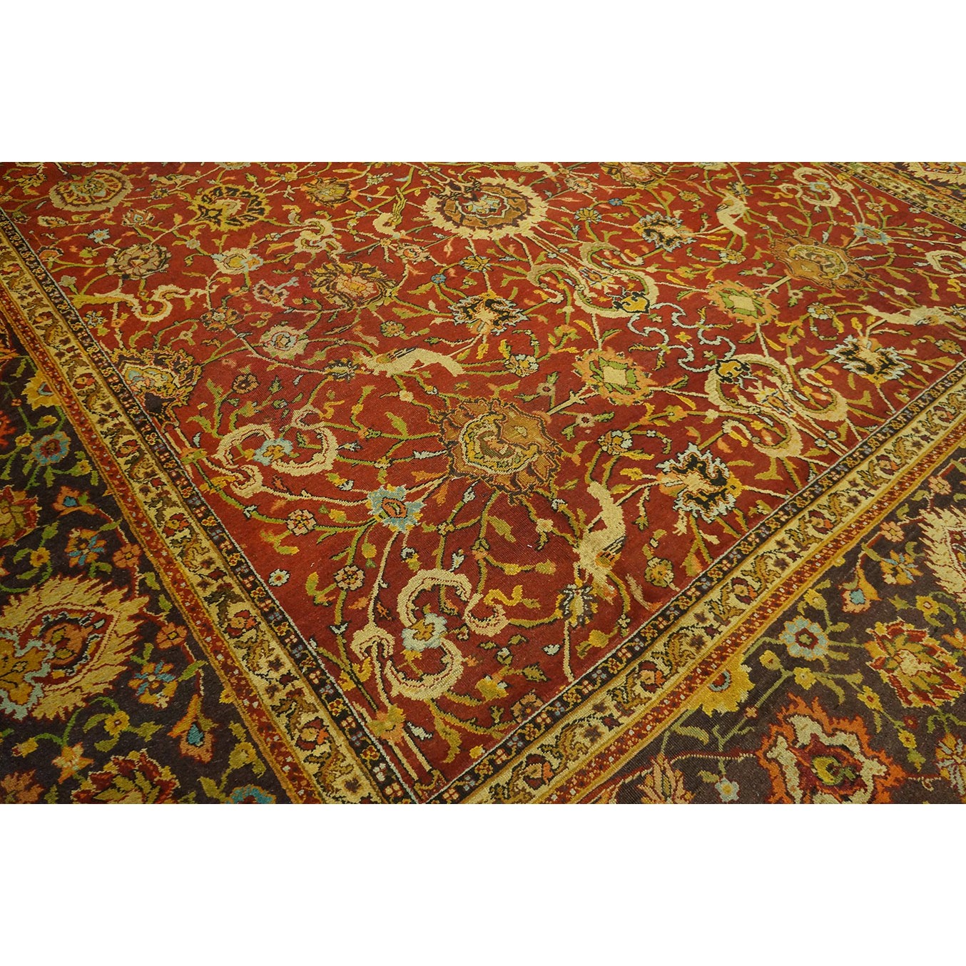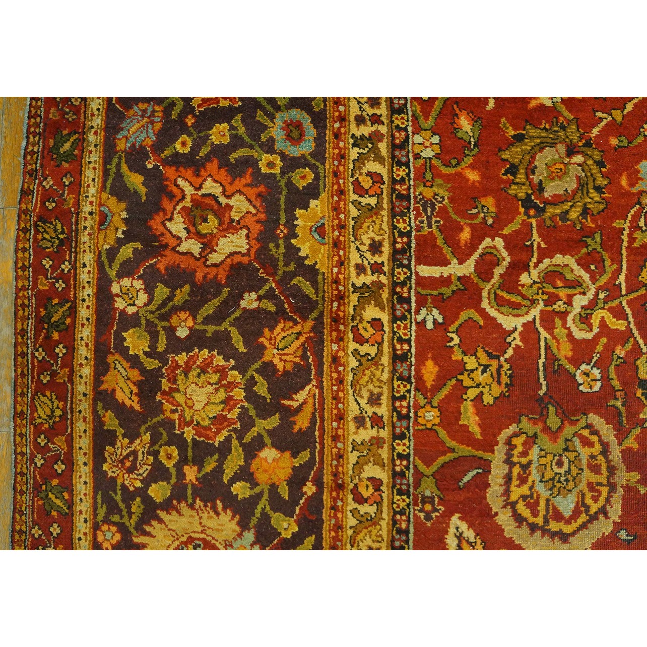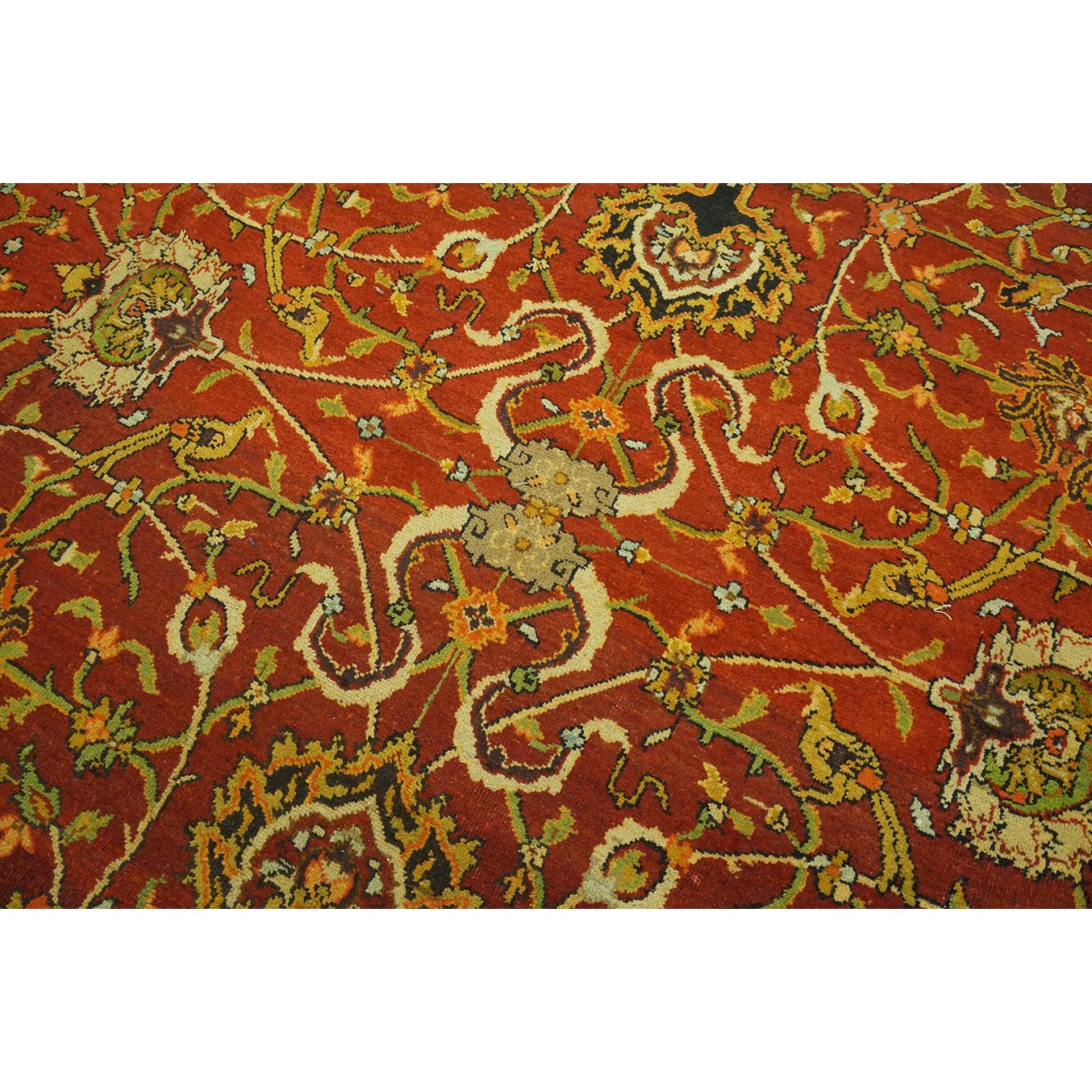 With an impeccable classical design ancestry, this red-rust ground northern Indian antique city carpet shows a two layer round arabesque pattern with in-and-out palmettes and cloud bands, accented with tiny birds. The navy border shows reversing flame palmettes and smaller palmettes and foliate elements. Very attractive and antique, well-woven and in good condition.