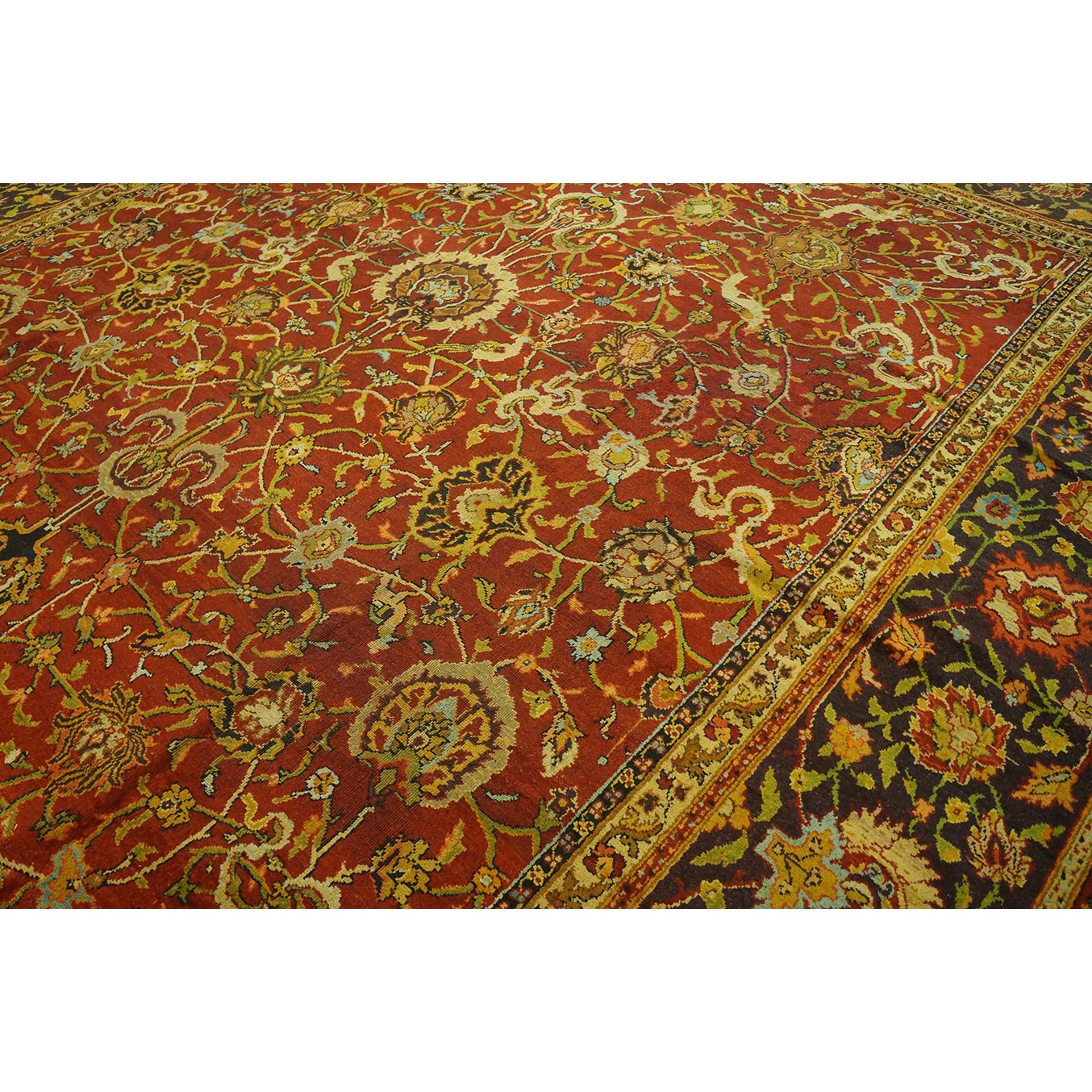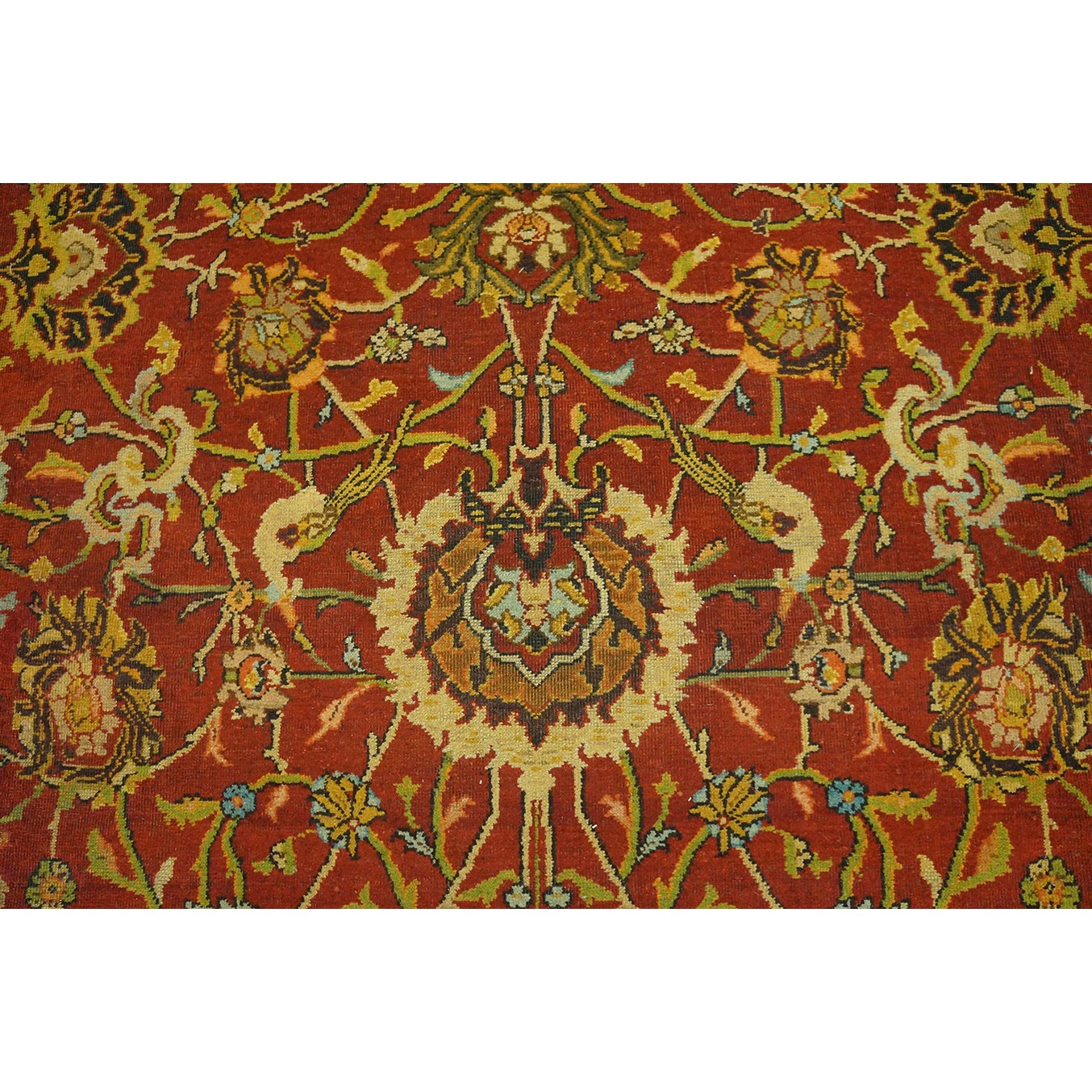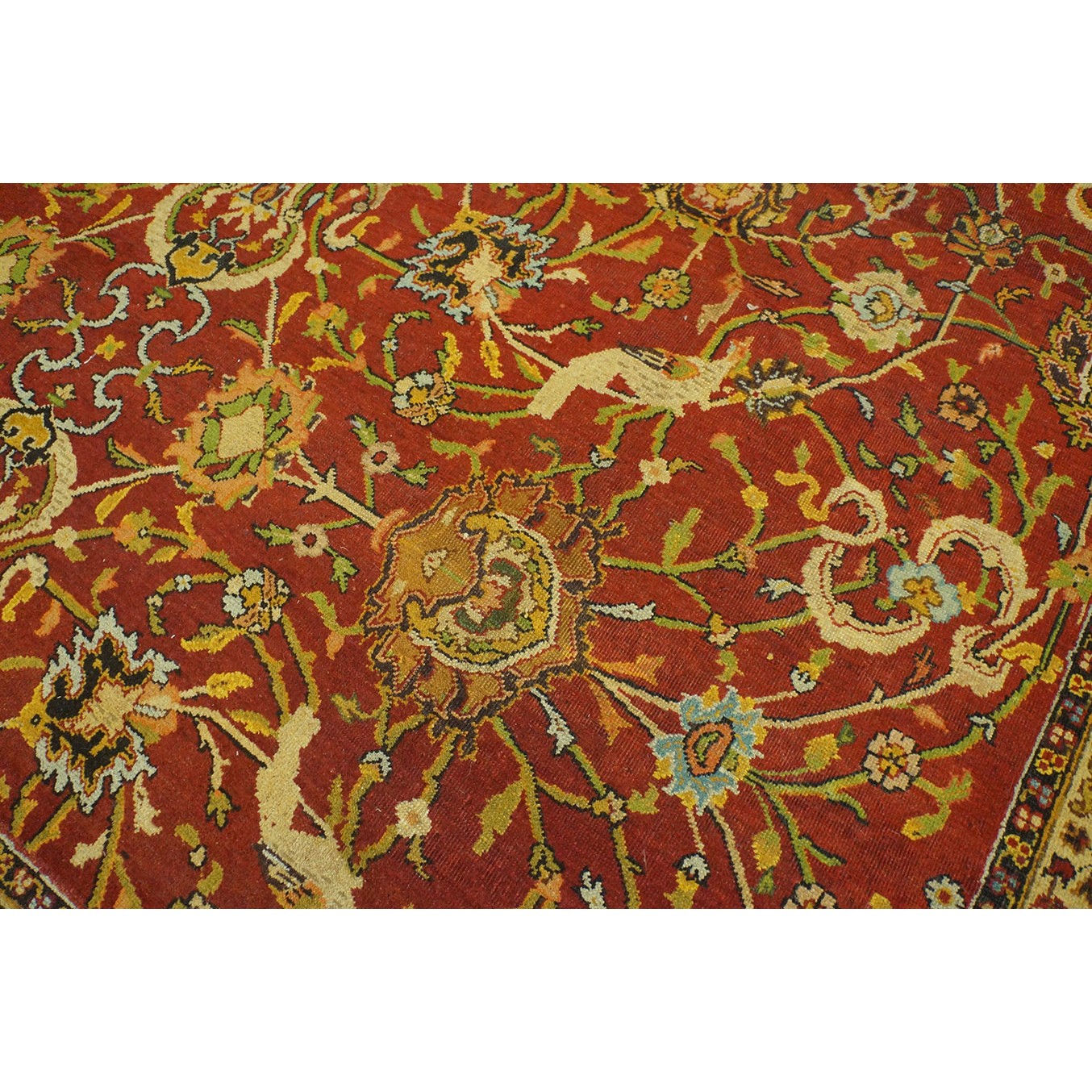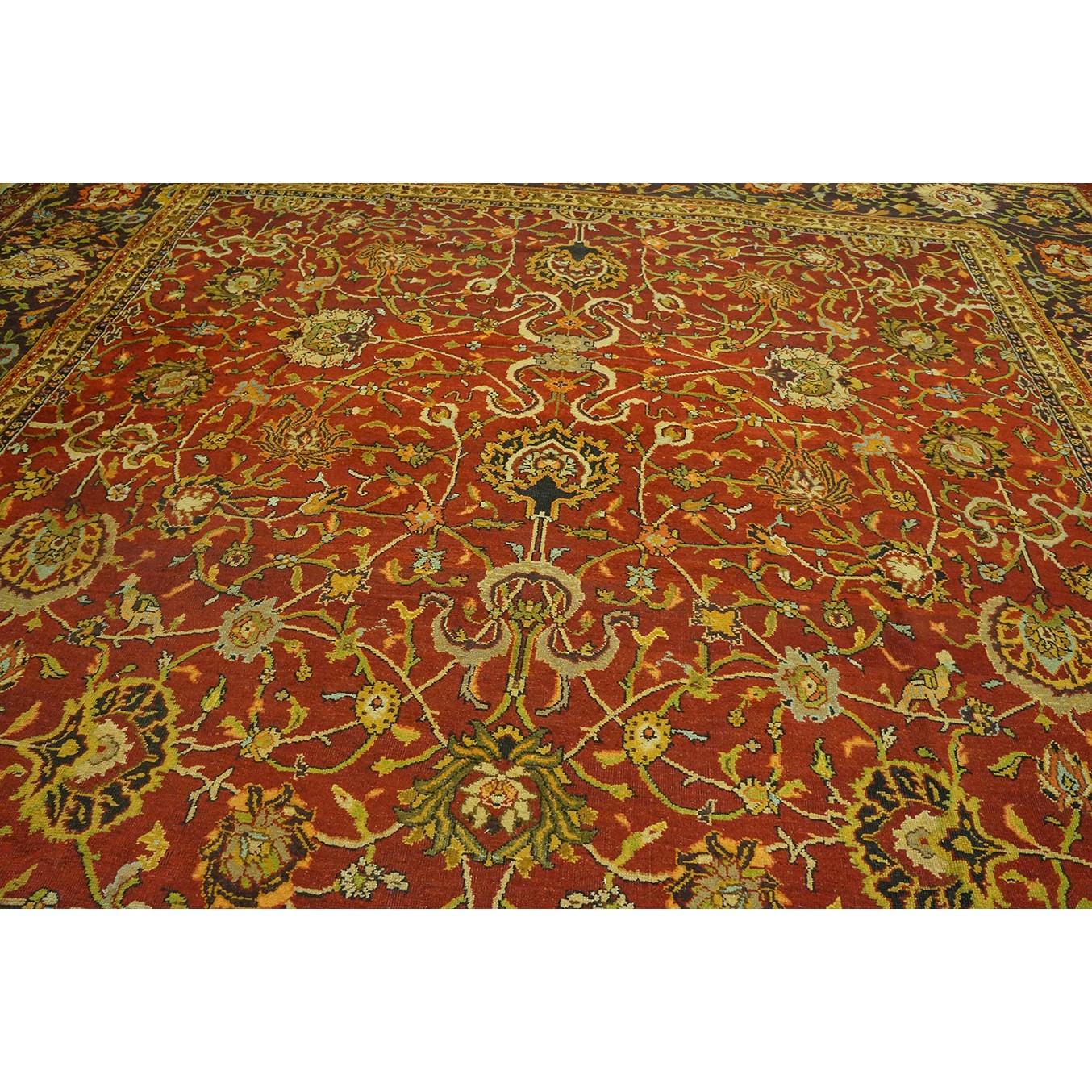 With an impeccable classical design ancestry, this red-rust ground northern Indian antique city carpet shows a two layer round arabesque pattern with in-and-out palmettes and cloud bands, accented with tiny birds. The navy border shows reversing flame palmettes and smaller palmettes and foliate elements. Very attractive and antique, well-woven and in good condition.