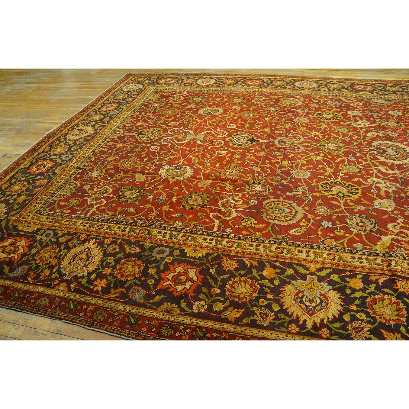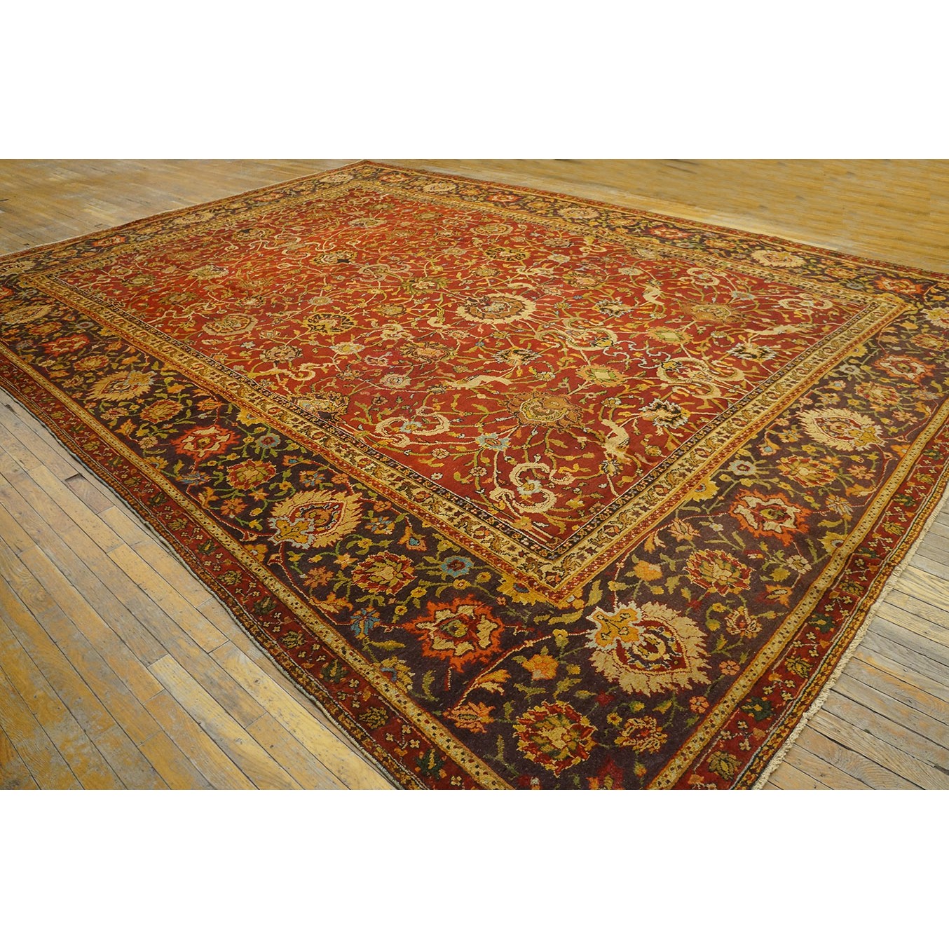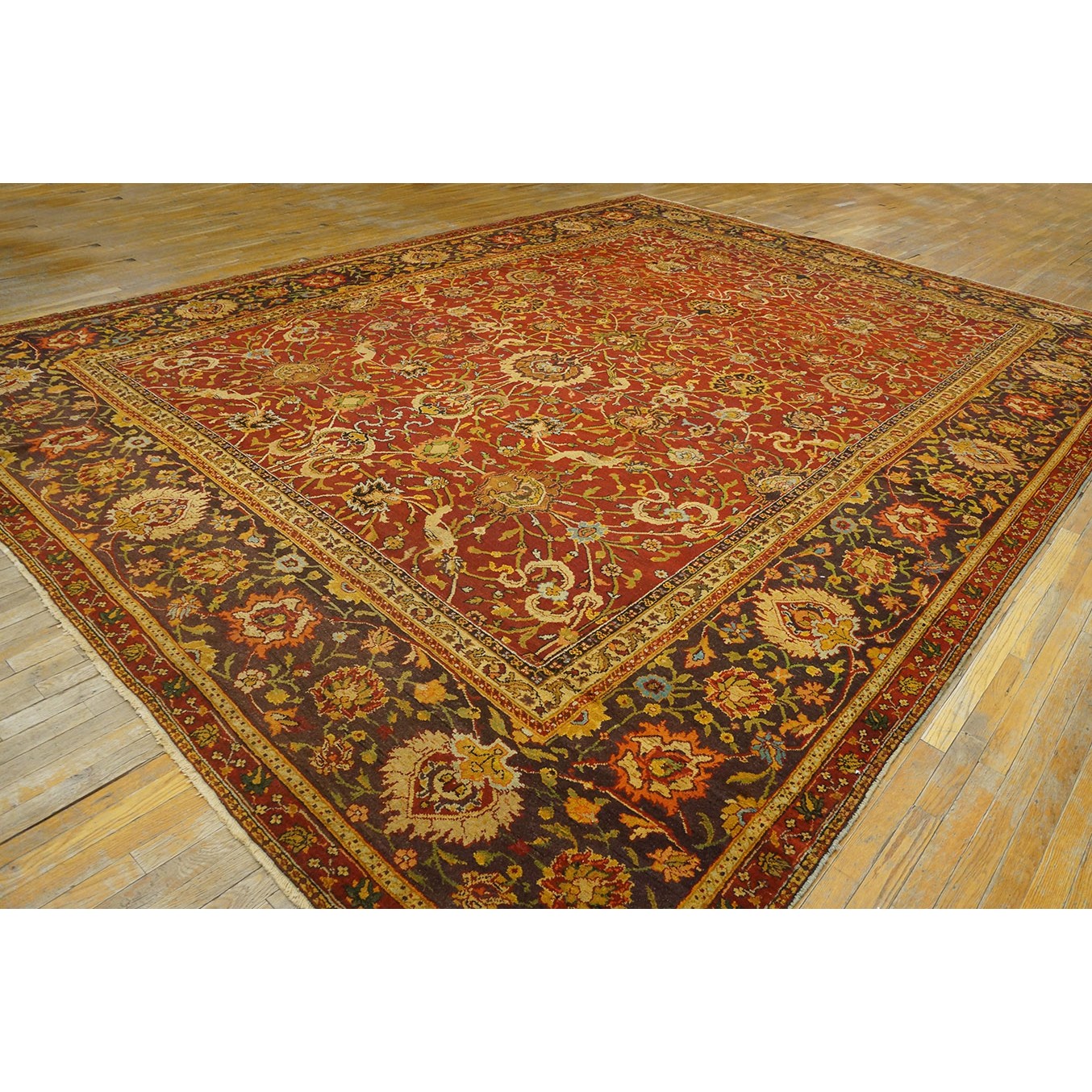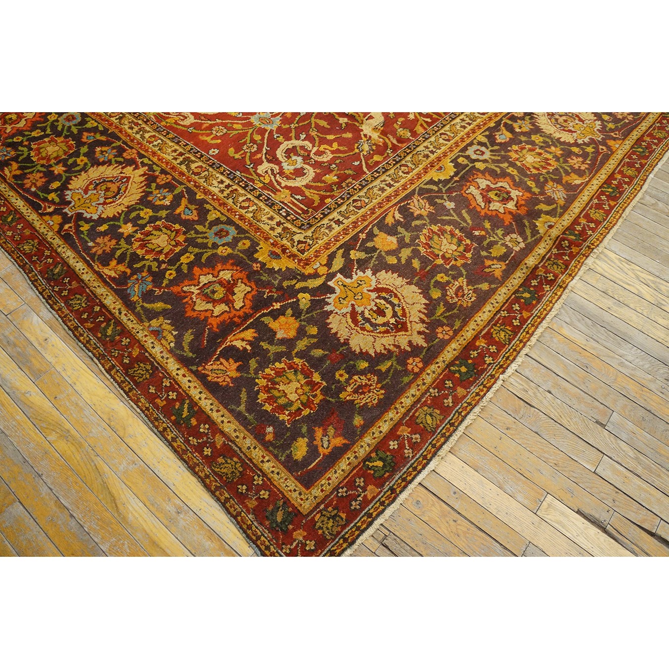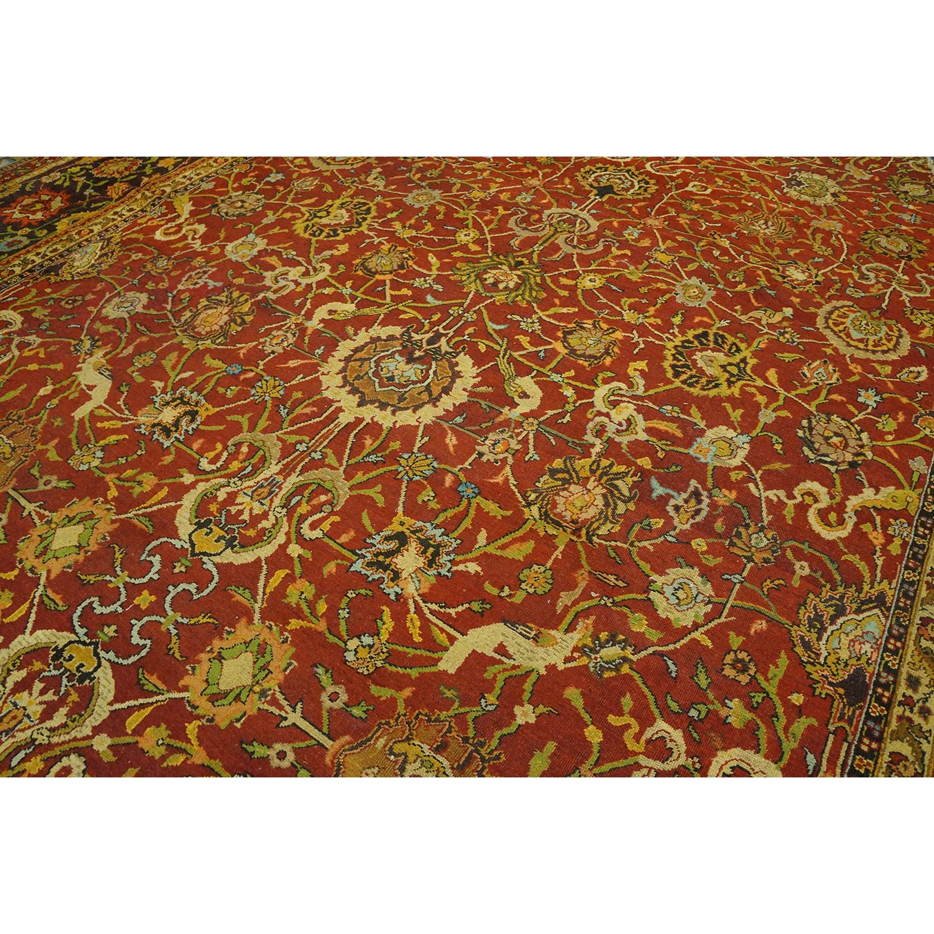 With an impeccable classical design ancestry, this red-rust ground northern Indian antique city carpet shows a two layer round arabesque pattern with in-and-out palmettes and cloud bands, accented with tiny birds. The navy border shows reversing flame palmettes and smaller palmettes and foliate elements. Very attractive and antique, well-woven and in good condition.