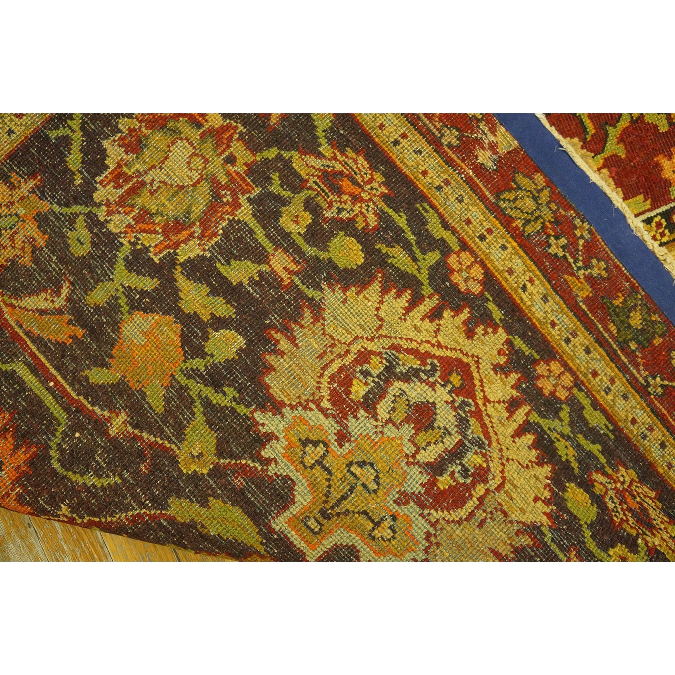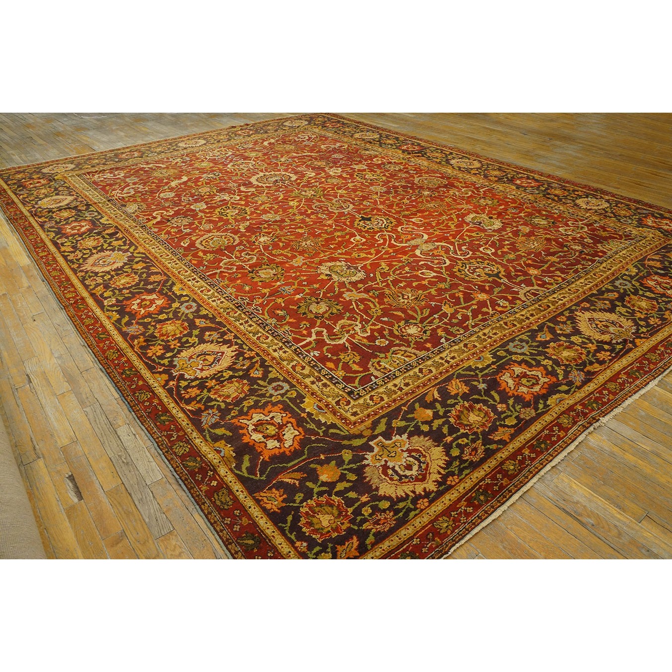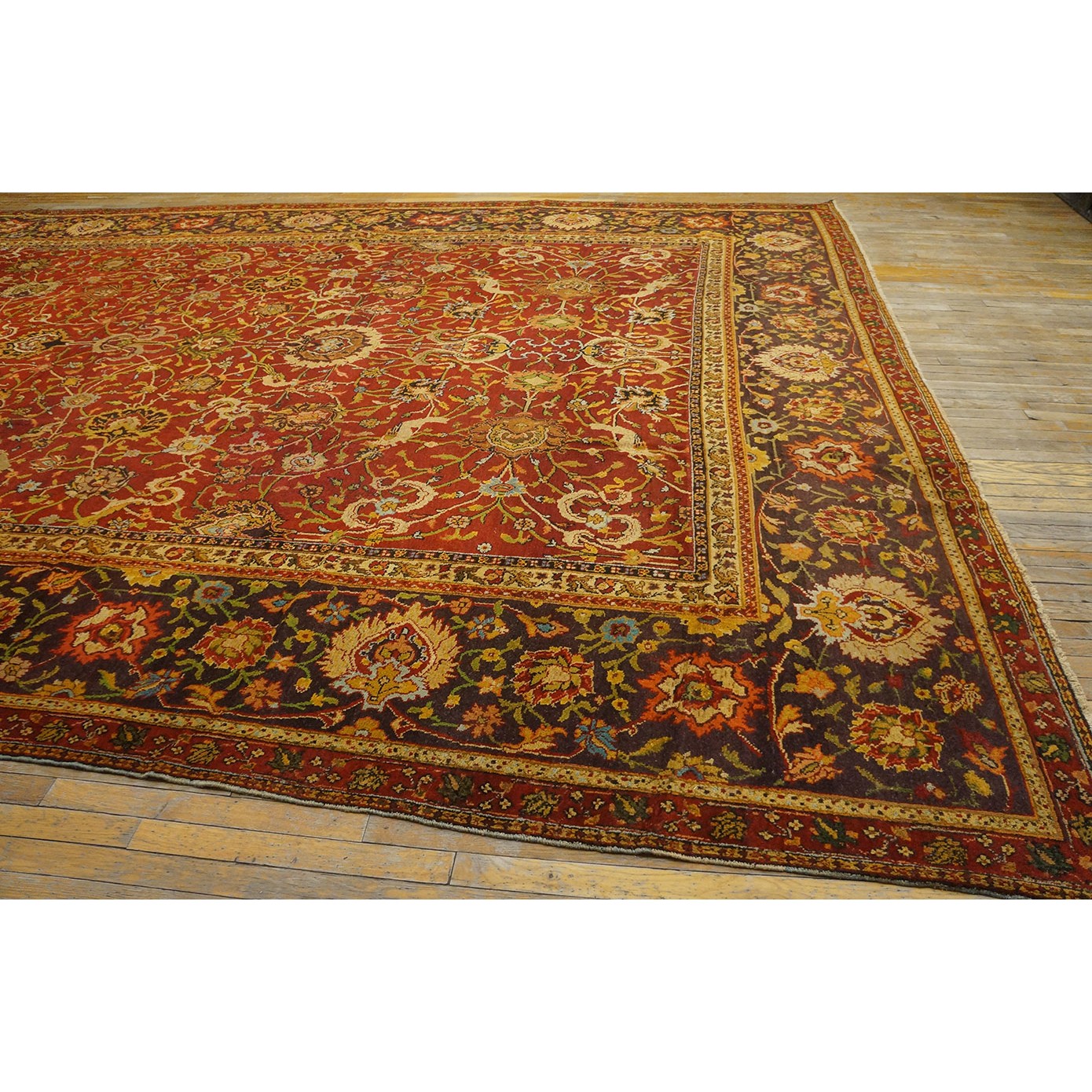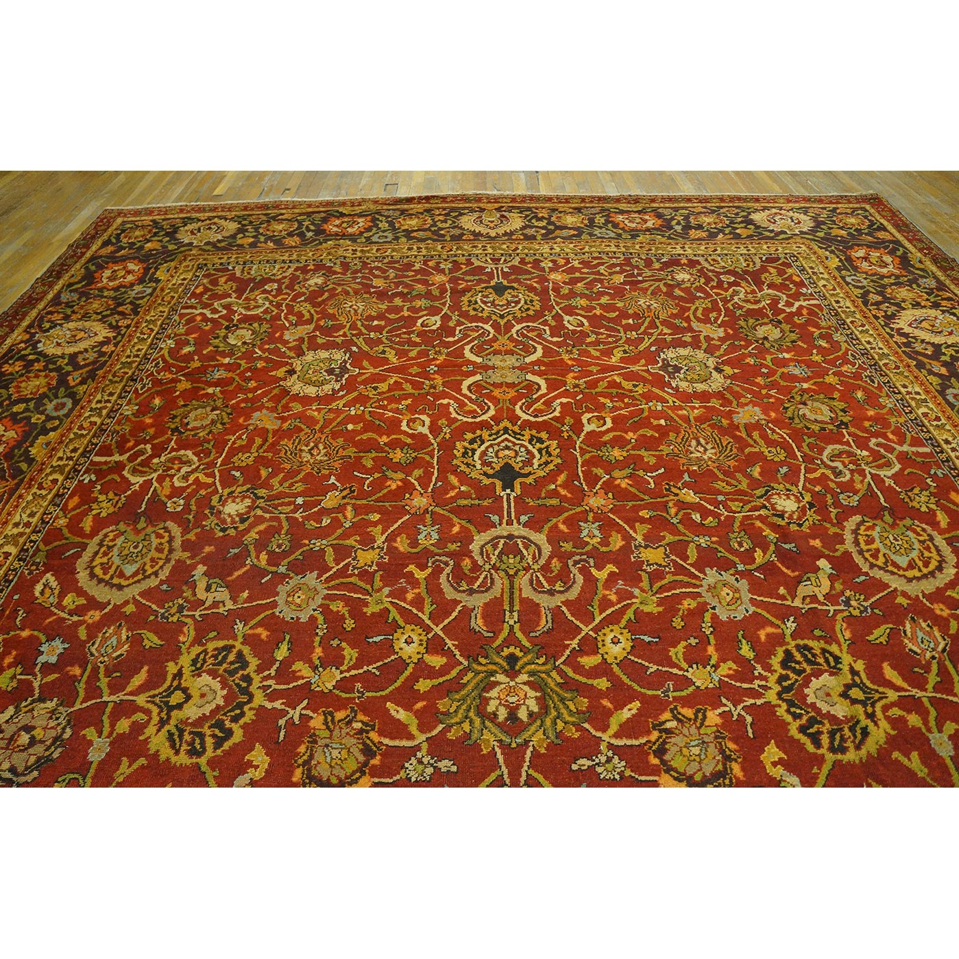With an impeccable classical design ancestry, this red-rust ground northern Indian antique city carpet shows a two layer round arabesque pattern with in-and-out palmettes and cloud bands, accented with tiny birds. The navy border shows reversing flame palmettes and smaller palmettes and foliate elements. Very attractive and antique, well-woven and in good condition.