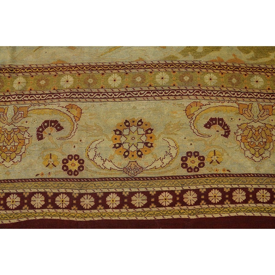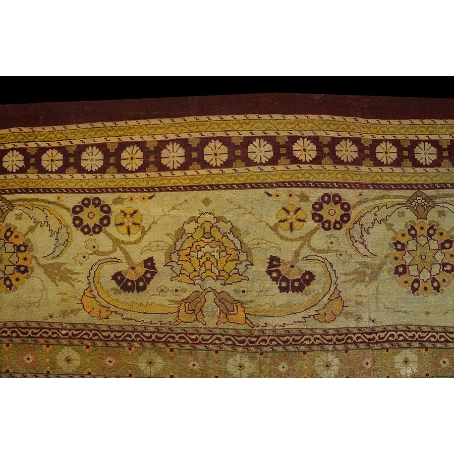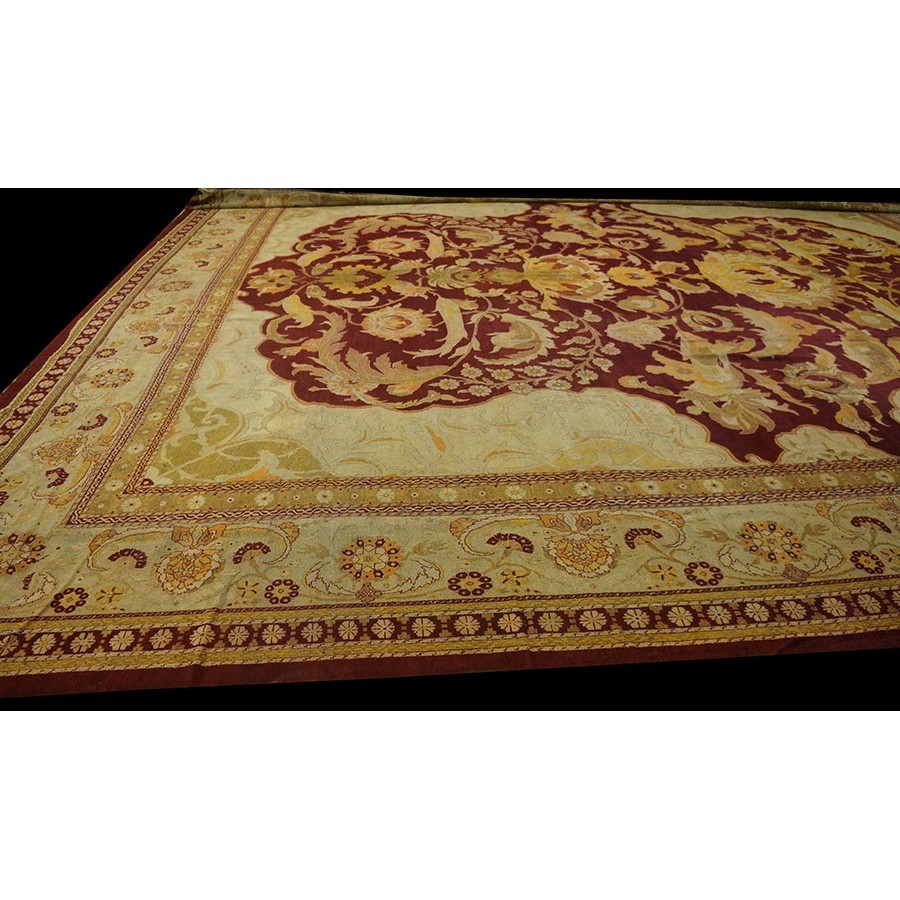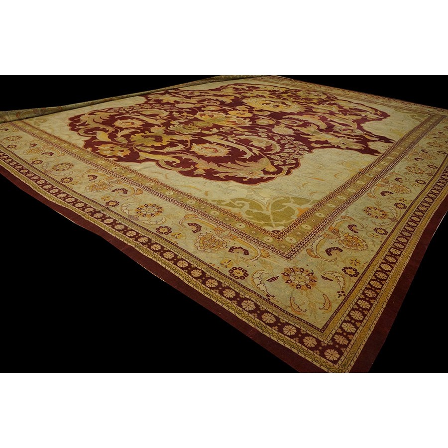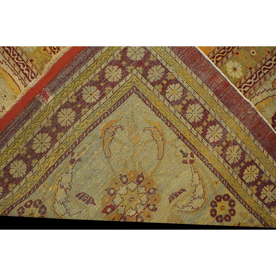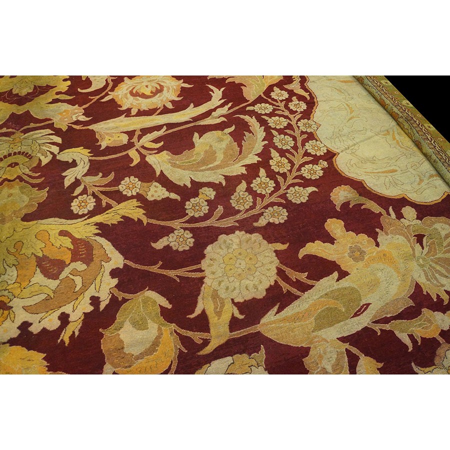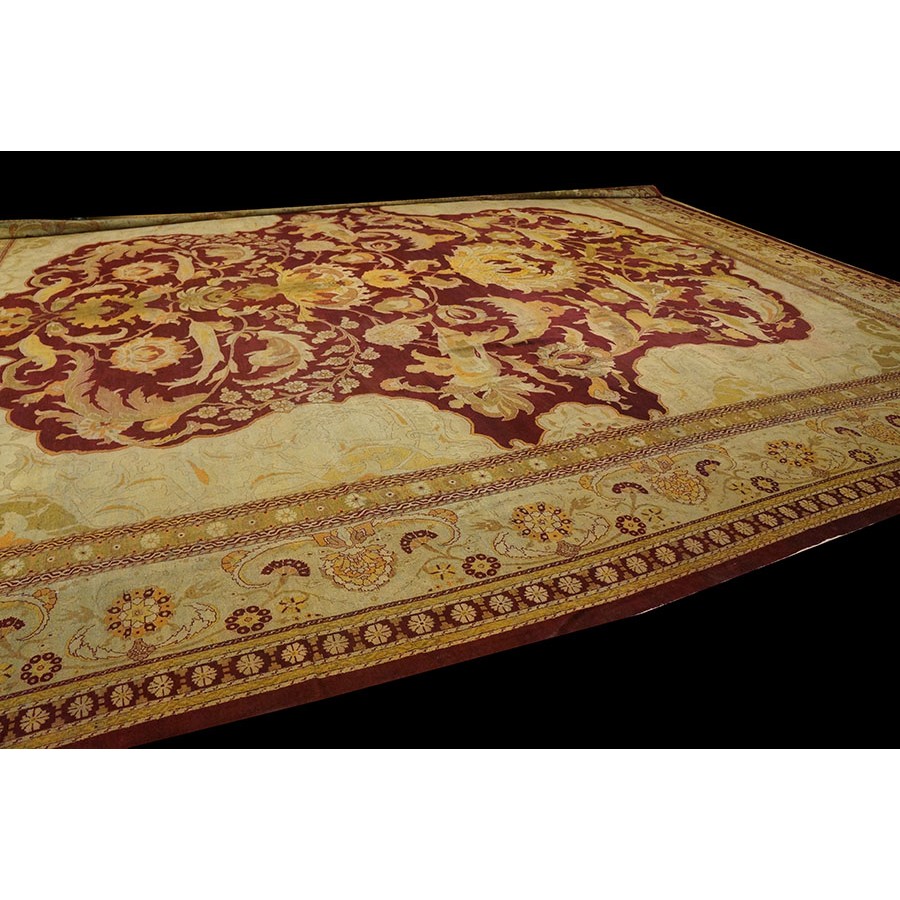 The rich cranberry lac red field of this impossibly striking Indian carpet has a design of ascending palmettes and lancet curved leavers of varying sizes and complexities in a “book-cover” shaped reserve, within ivory arabesque filled corners. The surrounding border is lightest blue with lotus palmettes and bracketing leaves. He whole design is derived from late 16th century Turkish Ottoman Court rugs, but enlarged to most impressive scale.