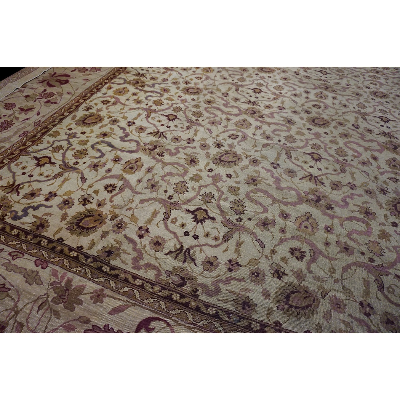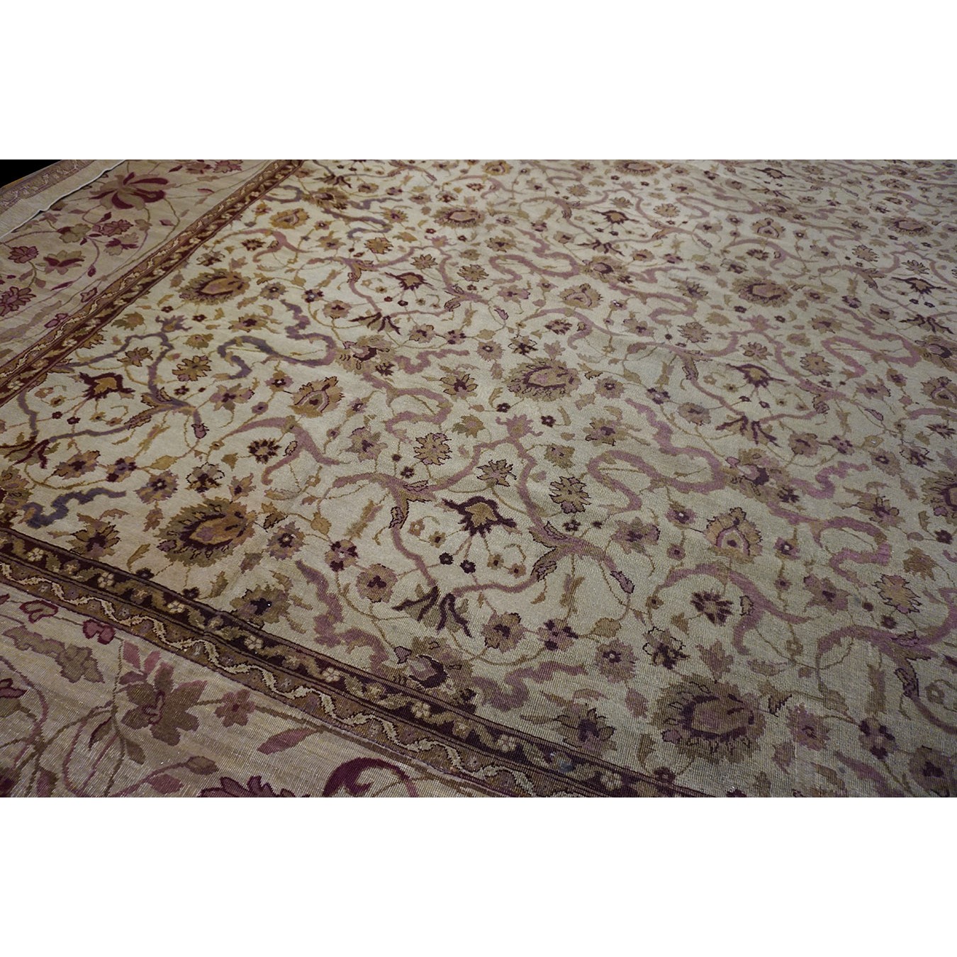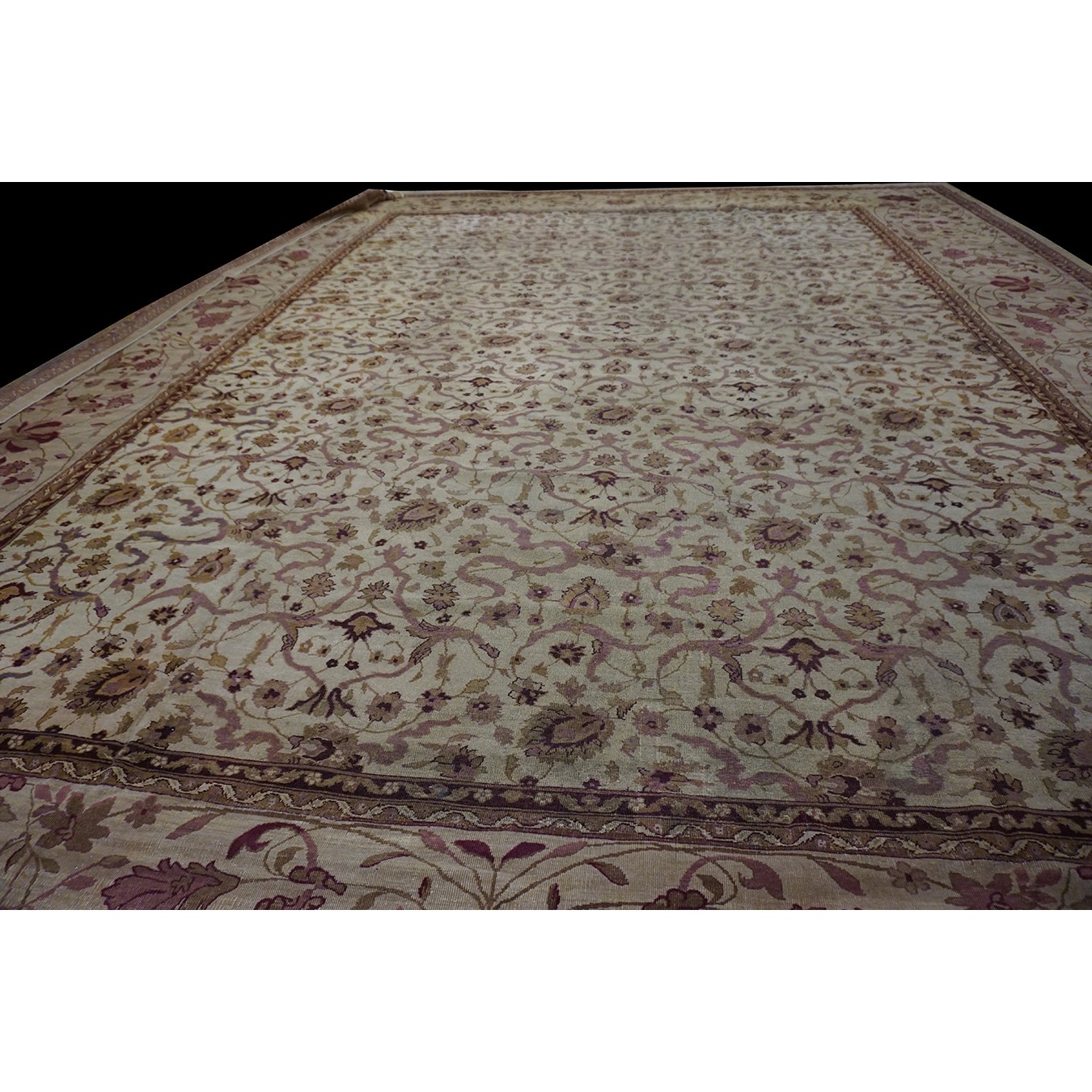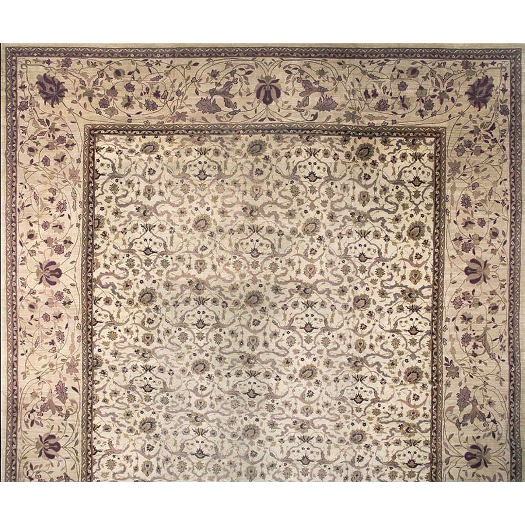 This is an extremely well designed large allover pattern ivory antique Indian carpet. The field design is classically derived with its wriggling cloud bands, mobile split arabesques, floating palmettes, and wiry vine tendrils. The border is a very slightly different cream color, with elegant palmettes connected by spiral vines and a millefleurs of almost recognizable blossoms.