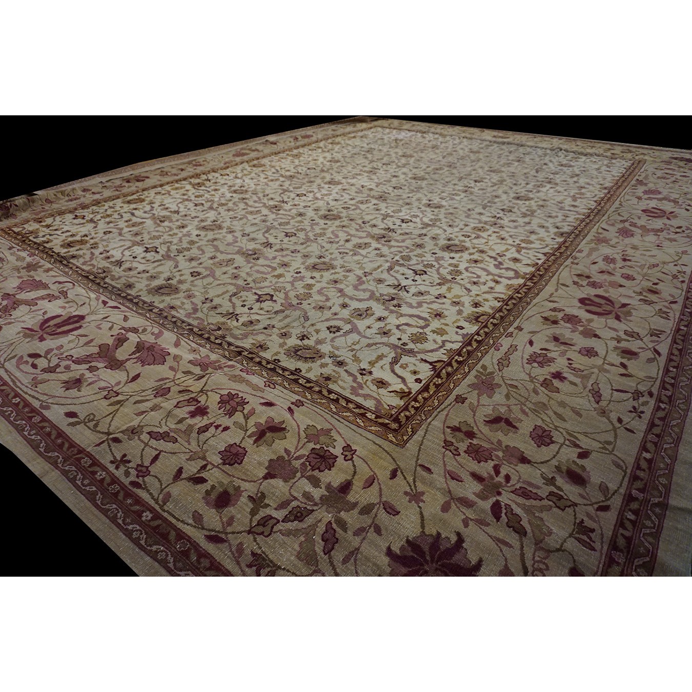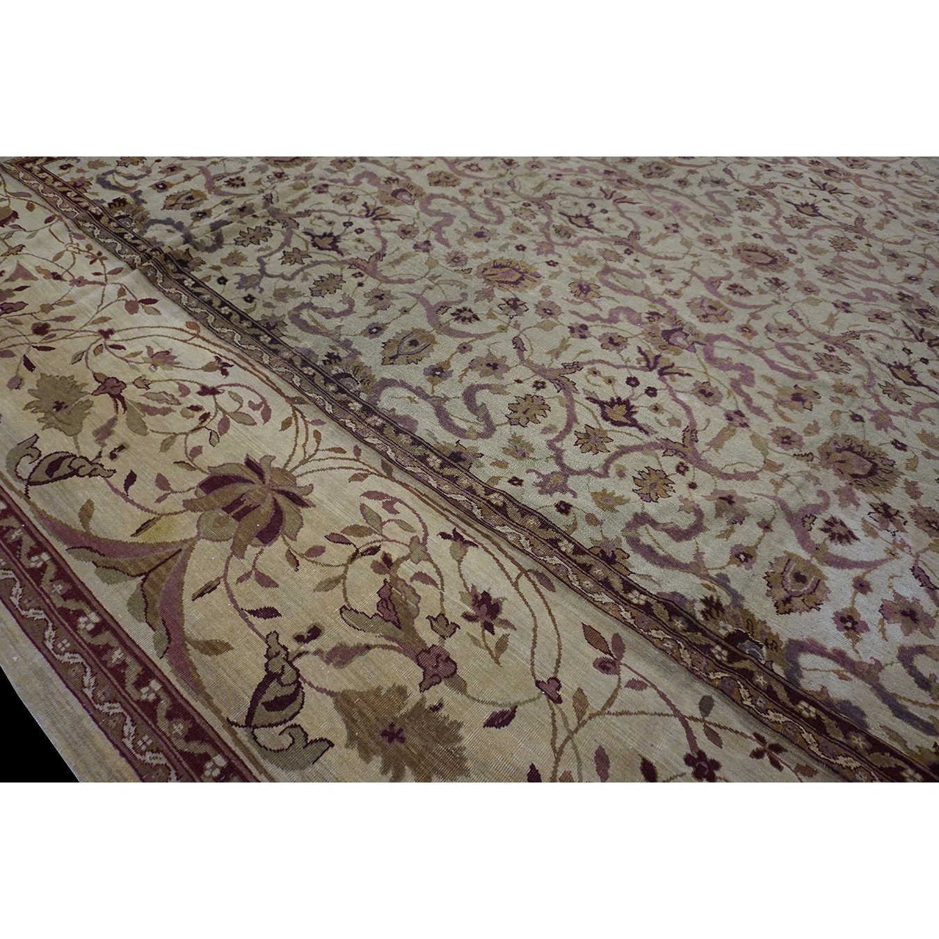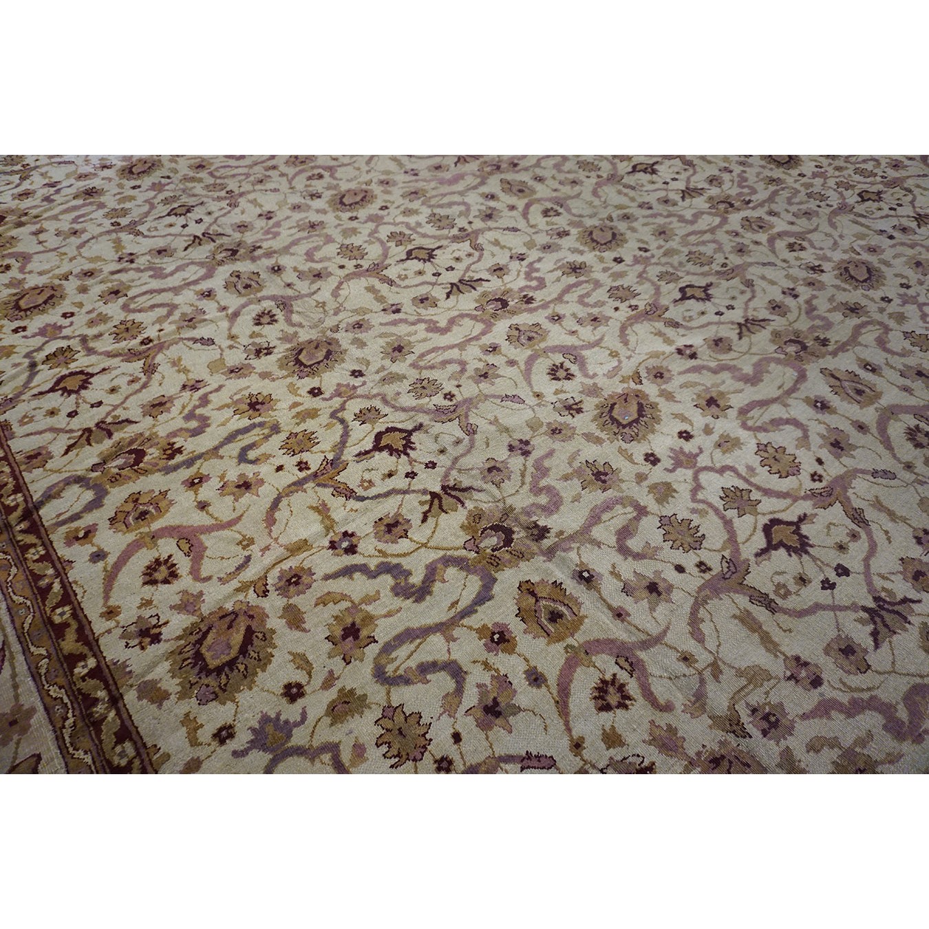 This is an extremely well designed large allover pattern ivory antique Indian carpet. The field design is classically derived with its wriggling cloud bands, mobile split arabesques, floating palmettes, and wiry vine tendrils. The border is a very slightly different cream color, with elegant palmettes connected by spiral vines and a millefleurs of almost recognizable blossoms.
