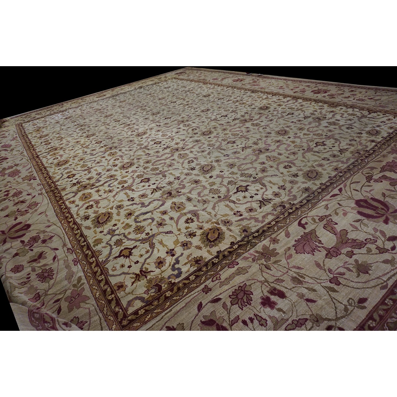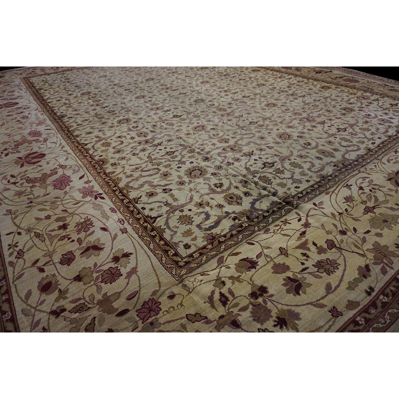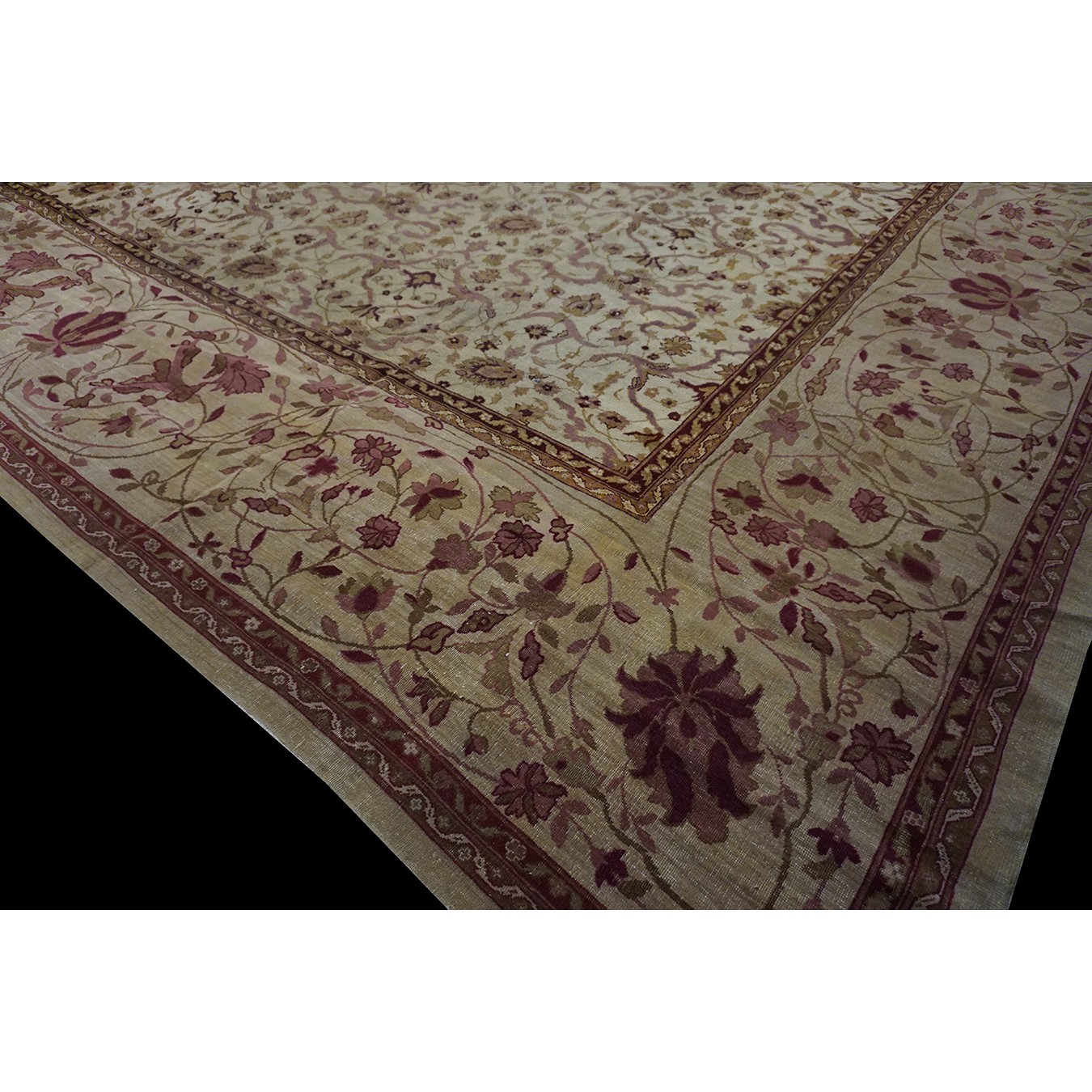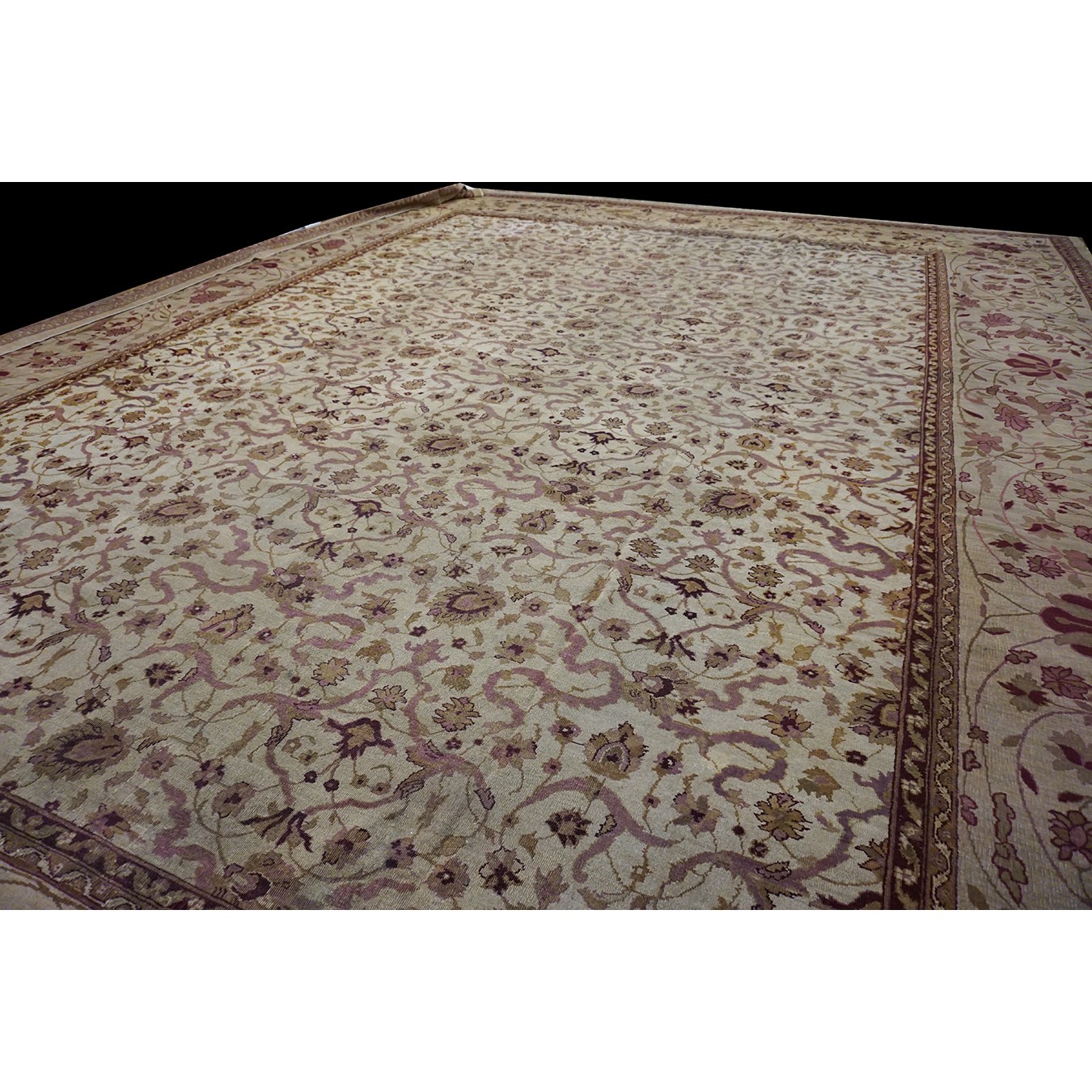 This is an extremely well designed large allover pattern ivory antique Indian carpet. The field design is classically derived with its wriggling cloud bands, mobile split arabesques, floating palmettes, and wiry vine tendrils. The border is a very slightly different cream color, with elegant palmettes connected by spiral vines and a millefleurs of almost recognizable blossoms.
