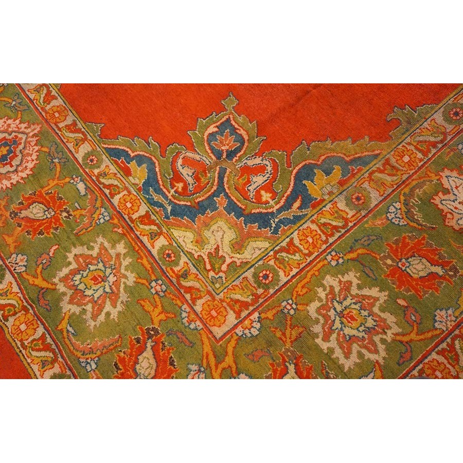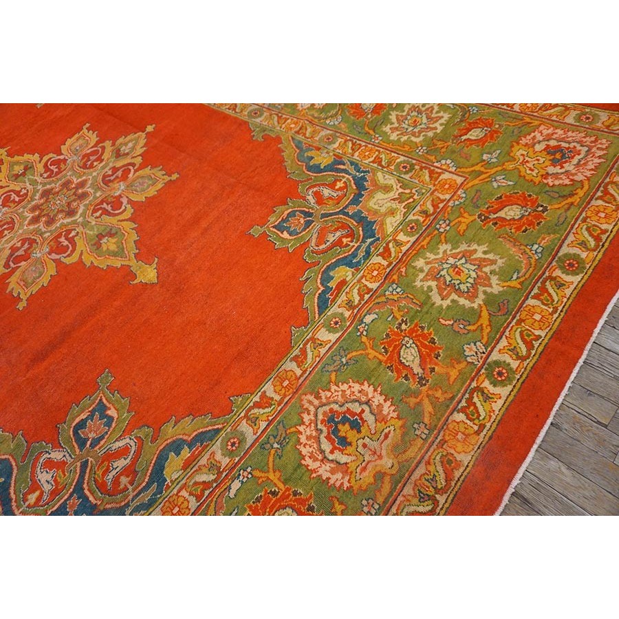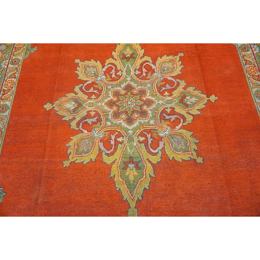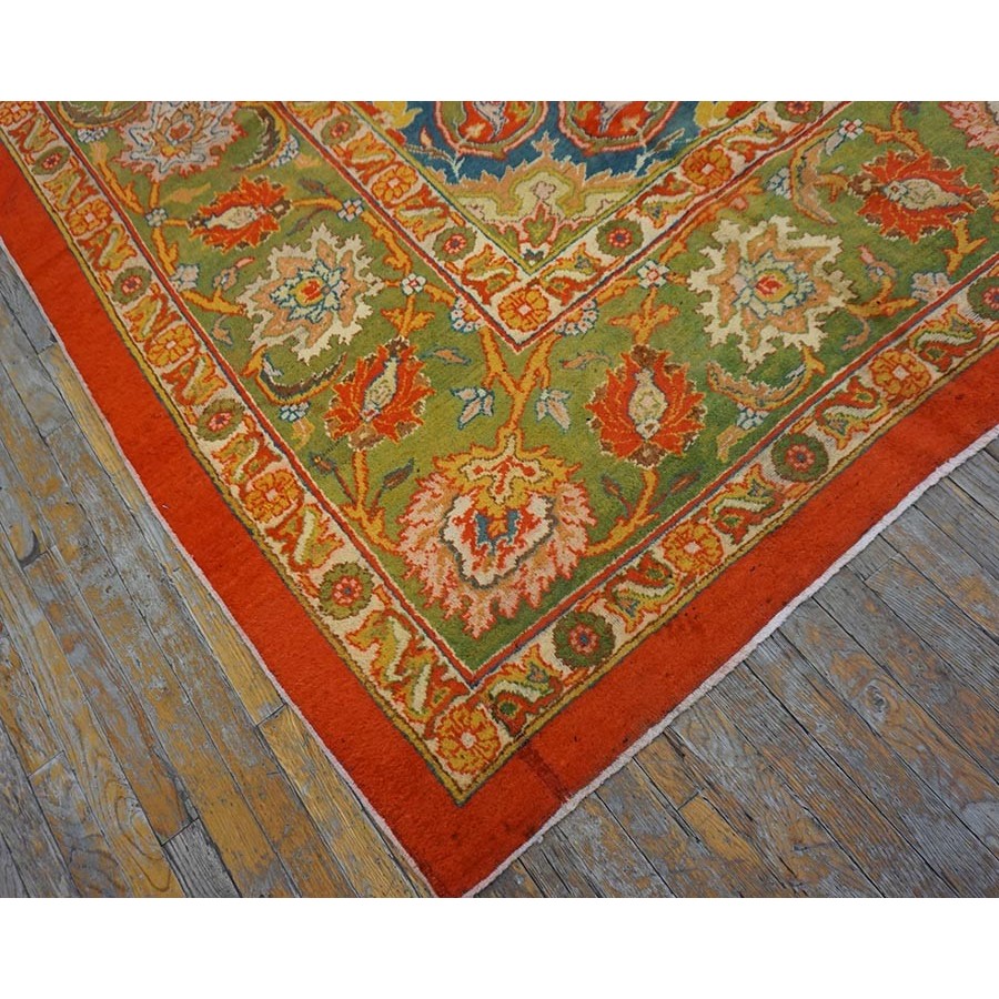 This attractive c. 1900 Indian carpet gets everything right:open clear red field, eight lobe ultra-classic medallion with yellow accents and matching navy quarter corners; and a perfectly proportioned main border with a variety of palmettes, diagonal lancet leaves and curvilinear connecting vine scroll. The style is that of a Sultanabad, but the colors are spicier Indian.