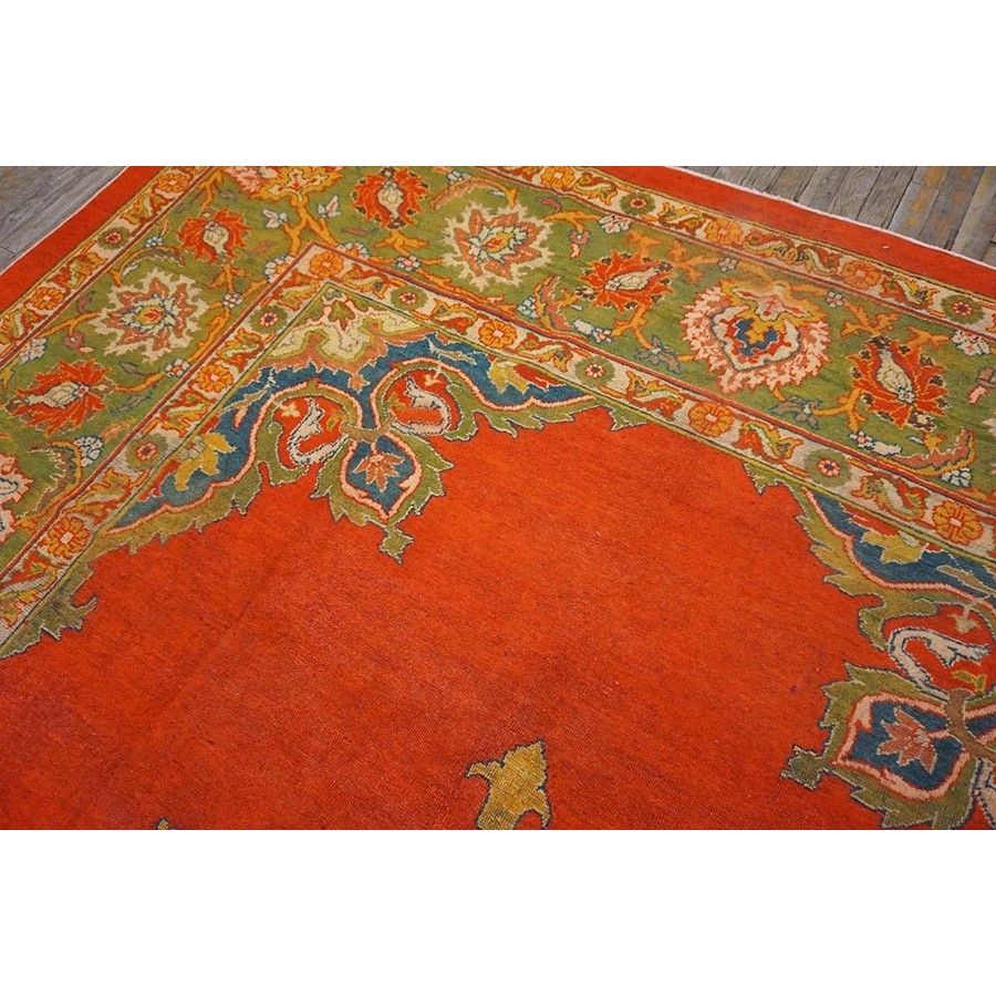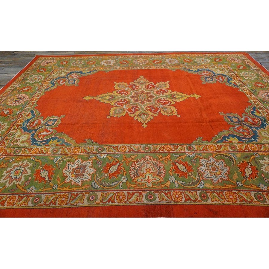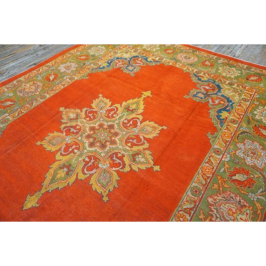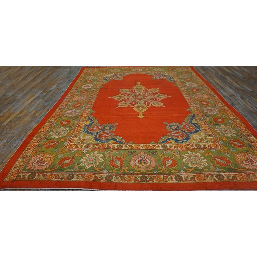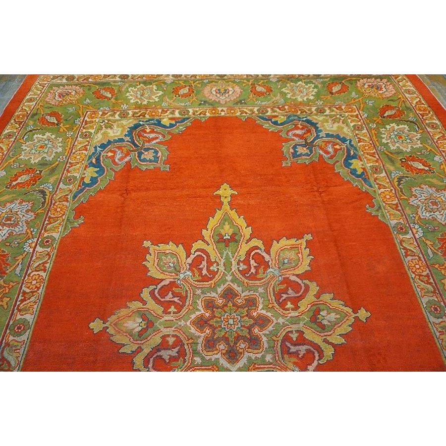 This attractive c. 1900 Indian carpet gets everything right:open clear red field, eight lobe ultra-classic medallion with yellow accents and matching navy quarter corners; and a perfectly proportioned main border with a variety of palmettes, diagonal lancet leaves and curvilinear connecting vine scroll. The style is that of a Sultanabad, but the colors are spicier Indian.