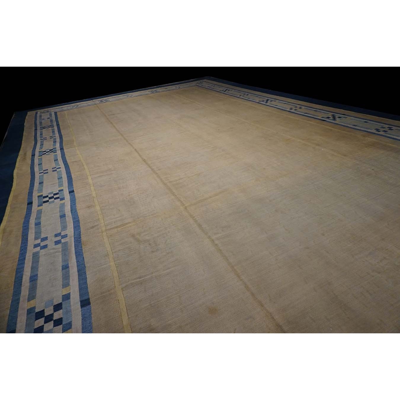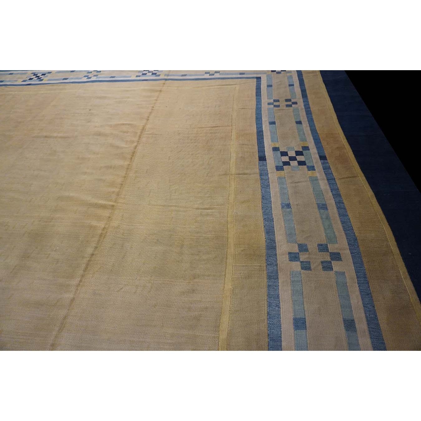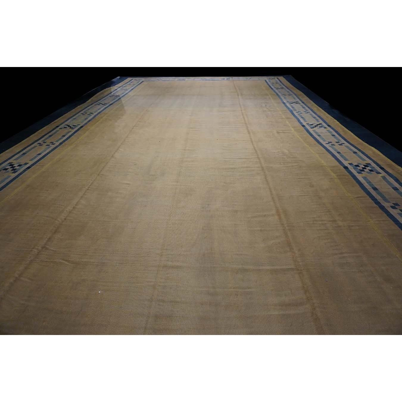 Open, unornamented field were popular in the Art Deco period. This enormous, camel- colored carpet may have been initially woven for an exclusive hotel lobby. The ivory border is ornamented with dots and bars in shades of blue. A grand gallery or perhaps a return to institutional use would be equally appropriate. The condition is still excellent, without spot or channel wear, amazingly after more than 80 years