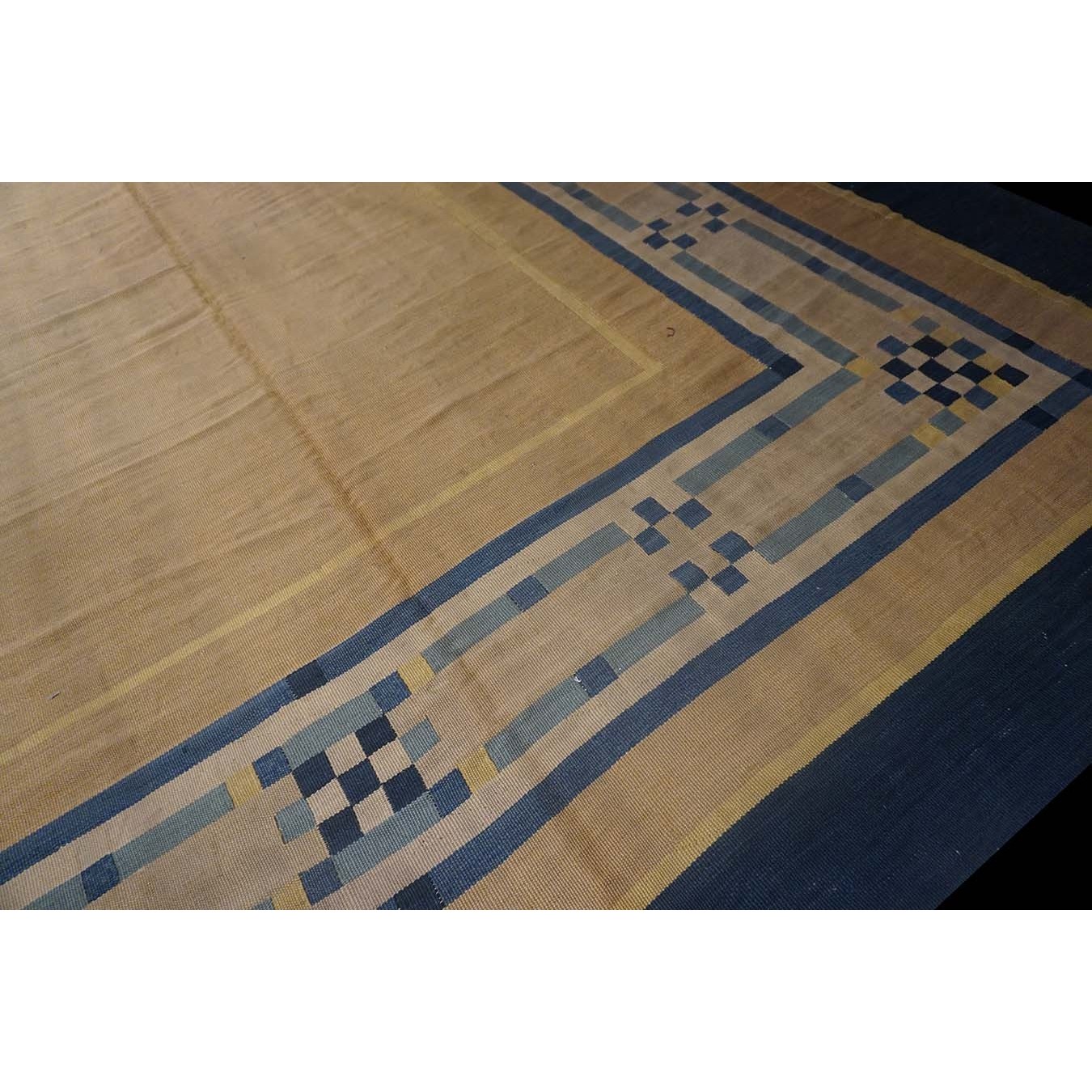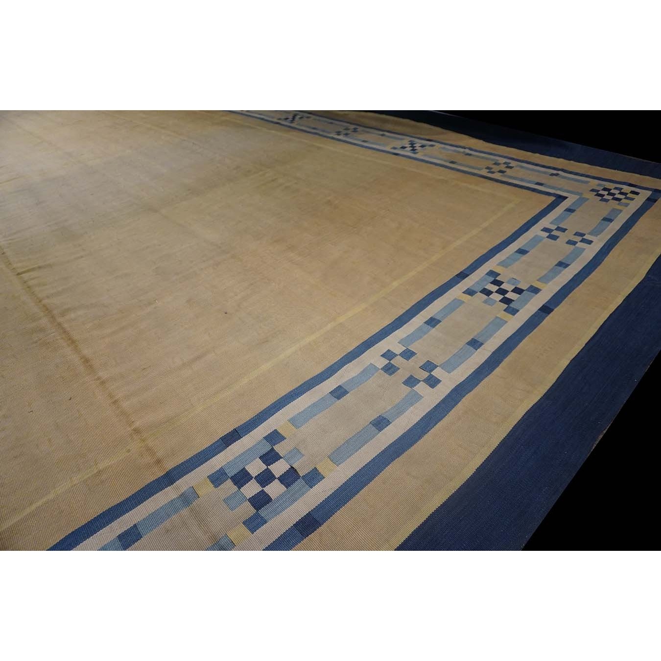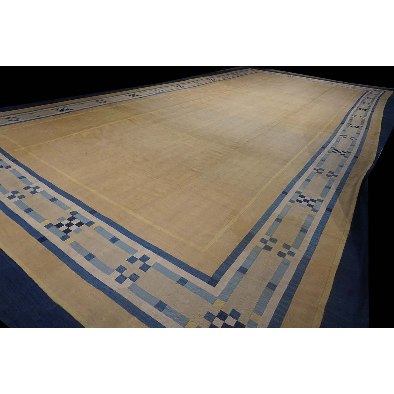 Open, unornamented field were popular in the Art Deco period. This enormous, camel- colored carpet may have been initially woven for an exclusive hotel lobby. The ivory border is ornamented with dots and bars in shades of blue. A grand gallery or perhaps a return to institutional use would be equally appropriate. The condition is still excellent, without spot or channel wear, amazingly after more than 80 years
