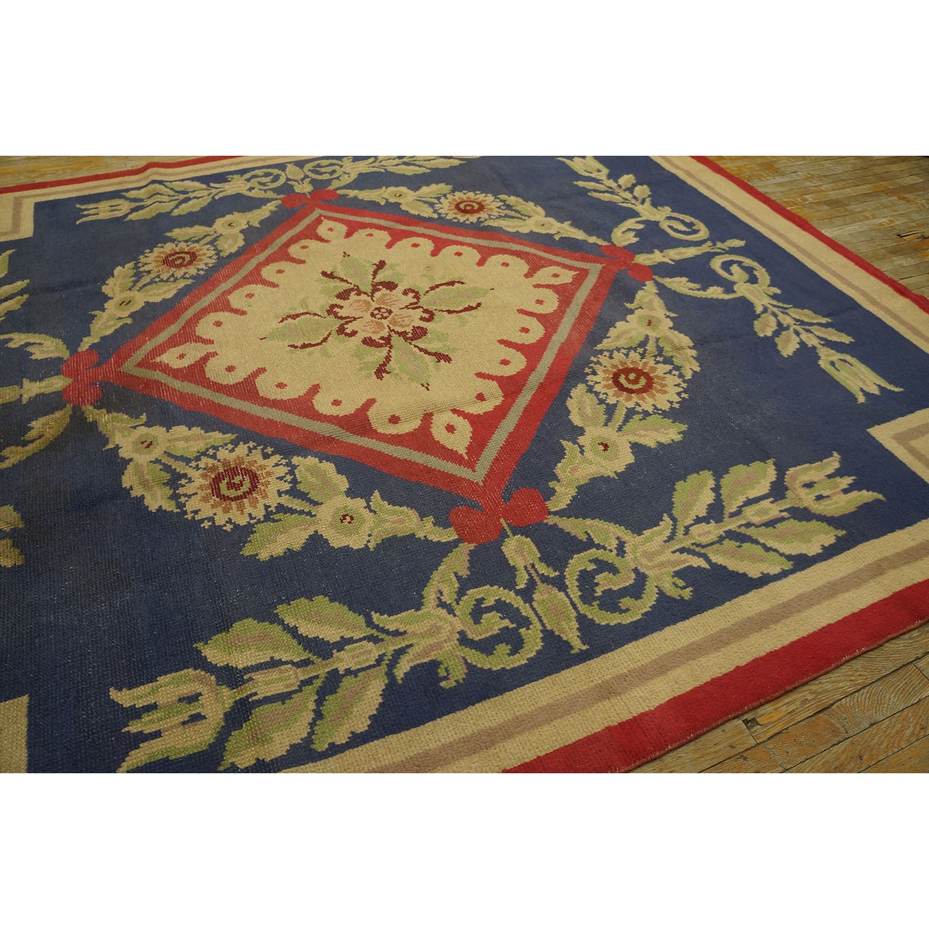 This is an extremely attractive example of neoclassic or Empire French Art Deco with its broad blue cruciform sub field enclosing a red lozenge medallion and sunflower and tulip surrounding motives. The effect is wholly modern, but it is completely sympathetic to post Louis French furniture.