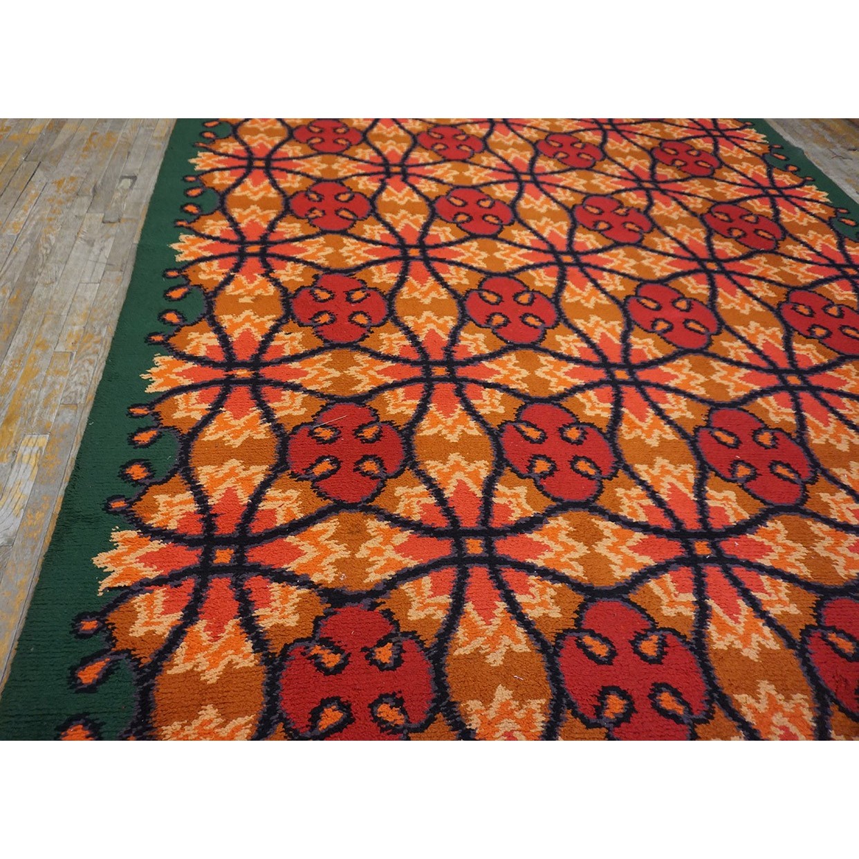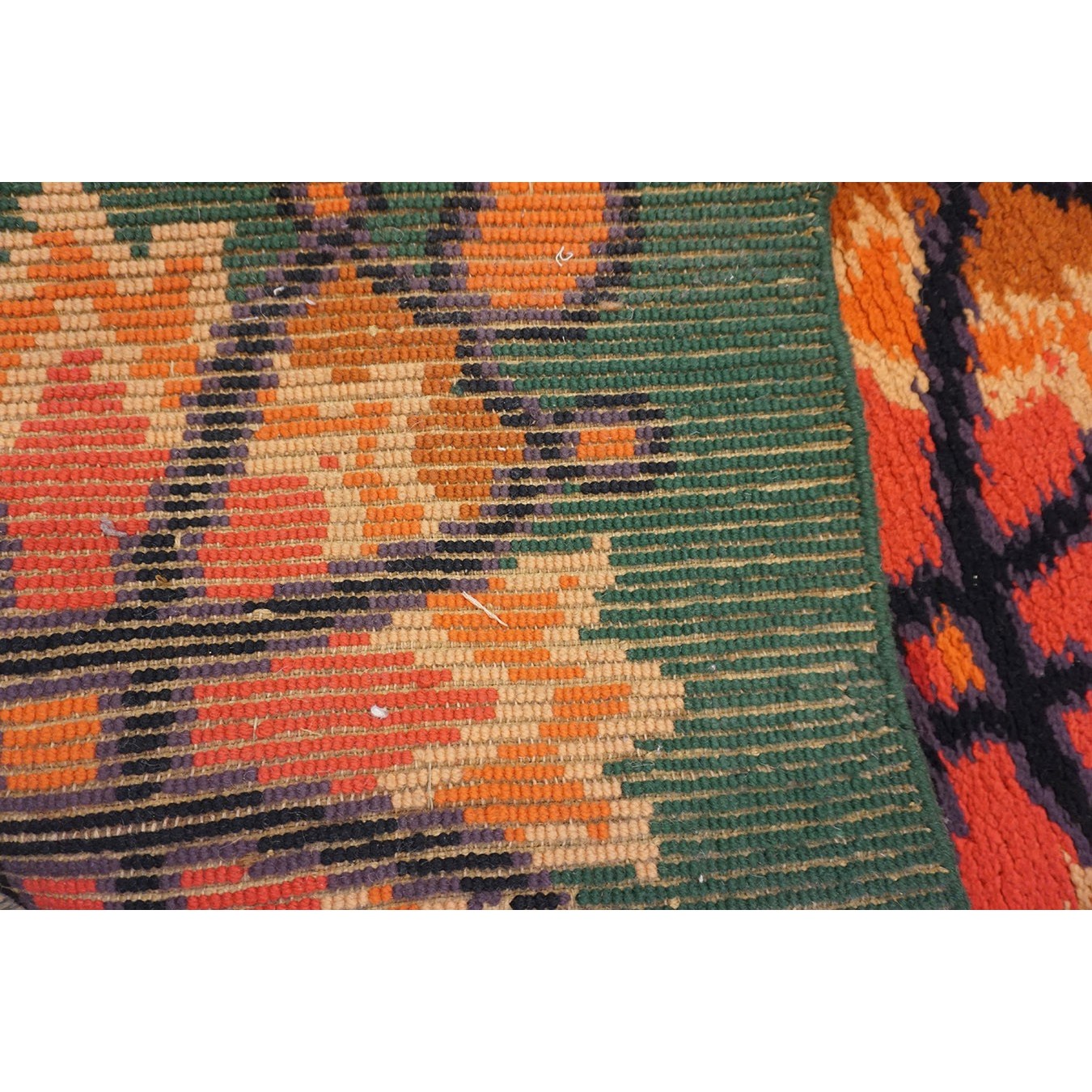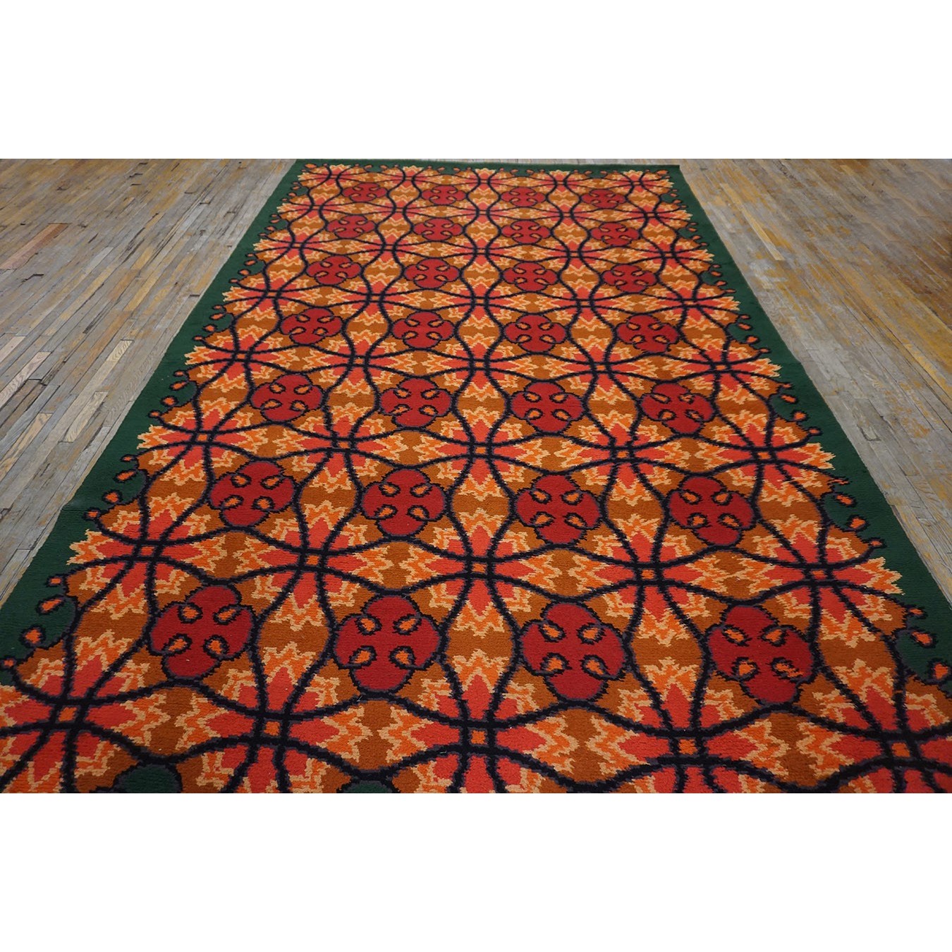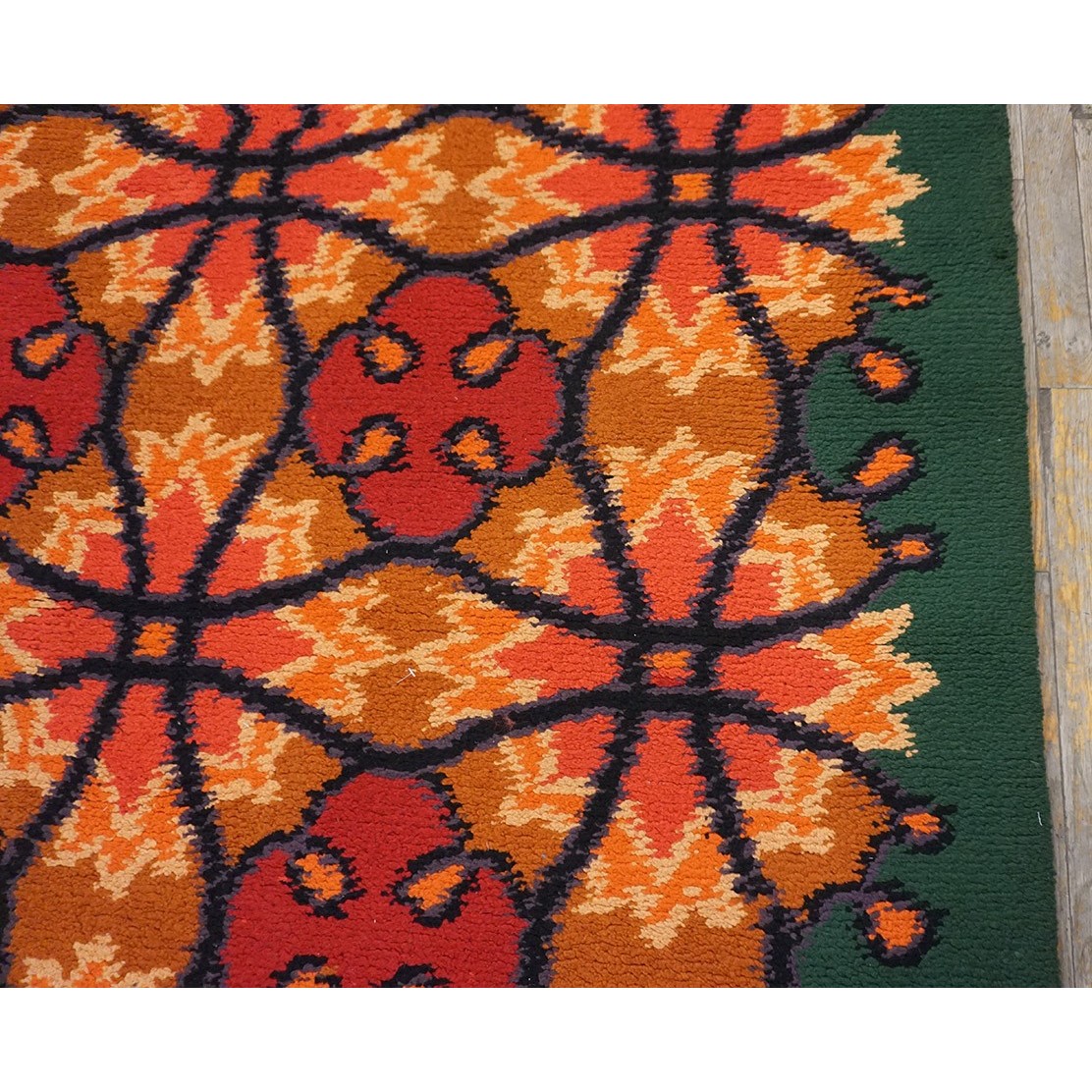 From the post-WWII modernist period, this French pile carpet in good condition shows a complex geometric all-over textile pattern of interlocking circles and small orange-rust fat quatrefoils, along with jagged yellow stars. At least two distinct pattern levels. This modern carpet will set off a color explosion in any contempt interior. Good condition.
