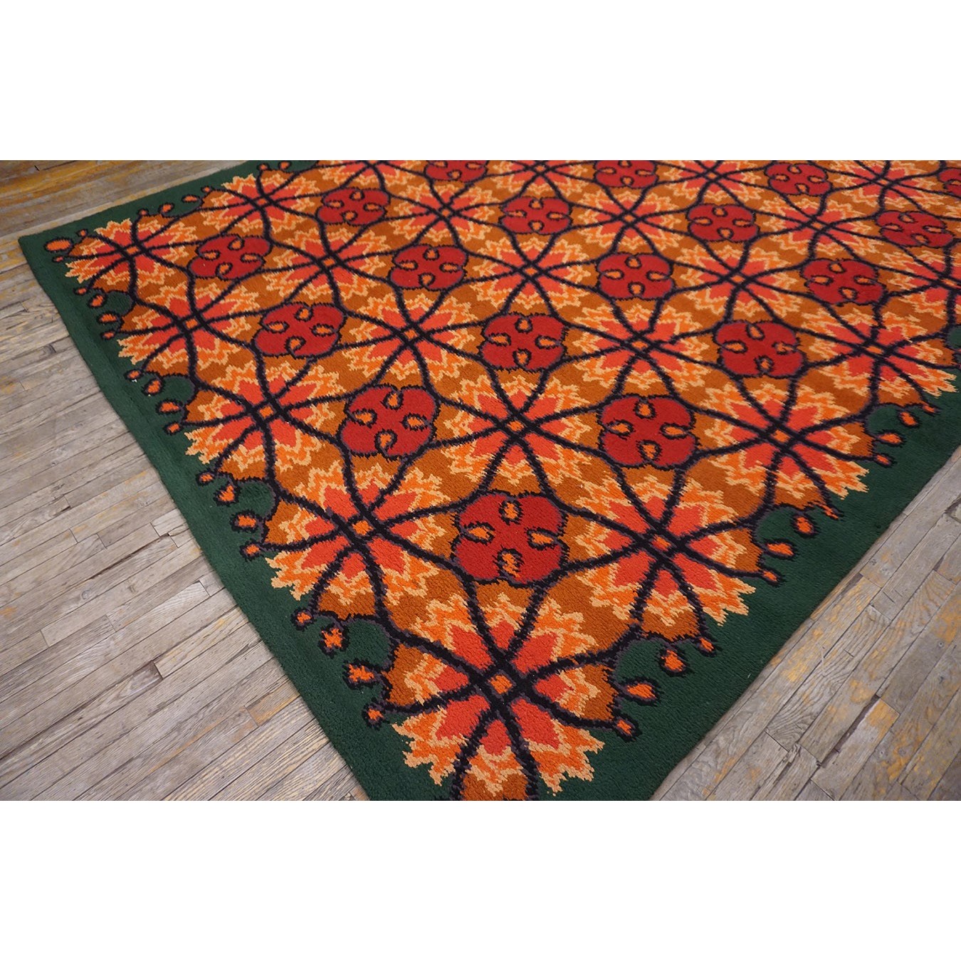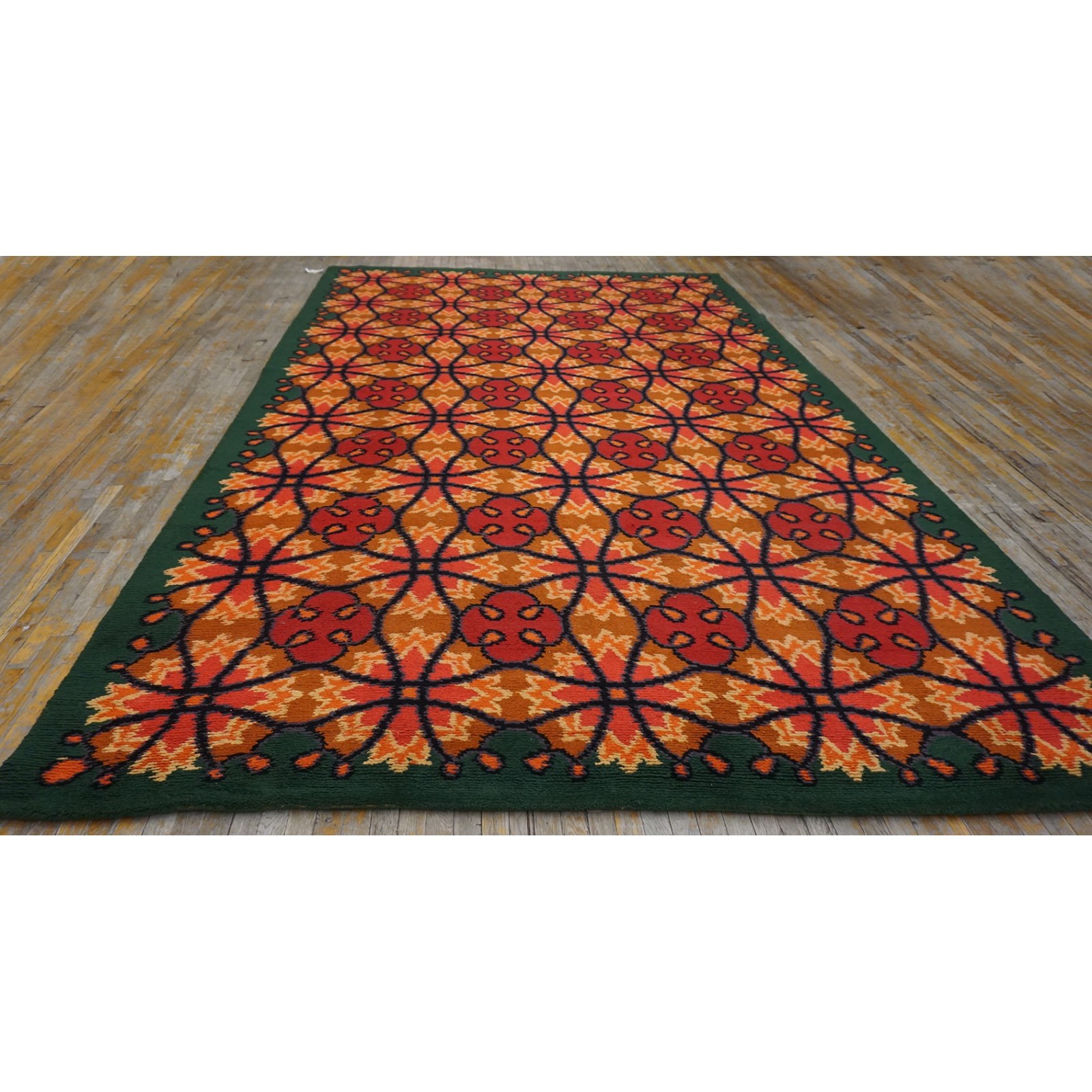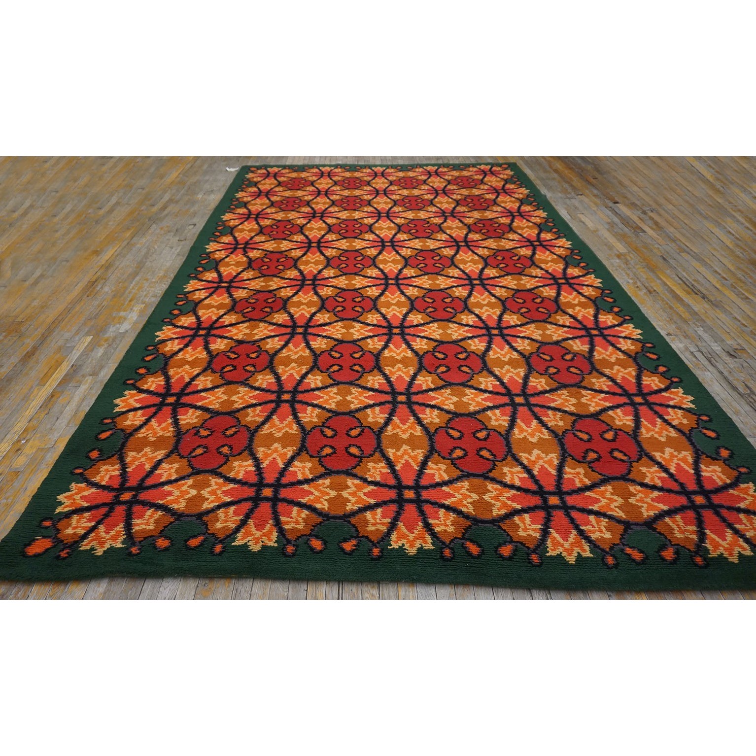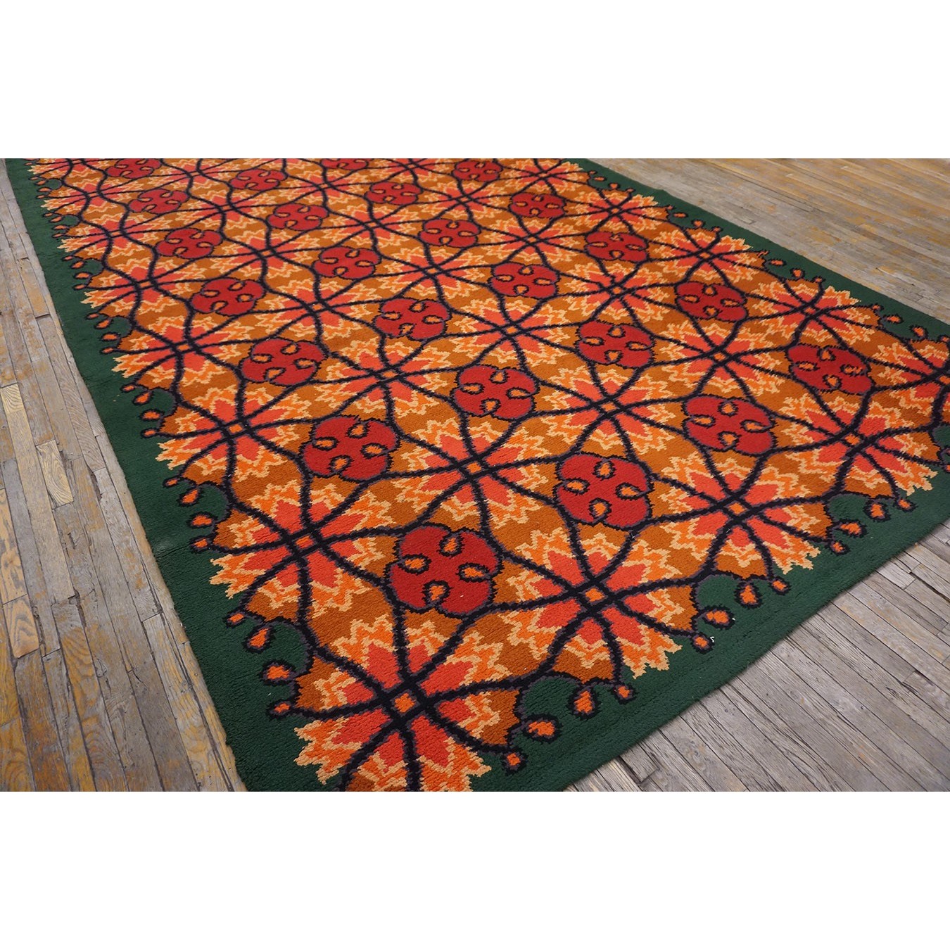 From the post-WWII modernist period, this French pile carpet in good condition shows a complex geometric all-over textile pattern of interlocking circles and small orange-rust fat quatrefoils, along with jagged yellow stars. At least two distinct pattern levels. This modern carpet will set off a color explosion in any contempt interior. Good condition.