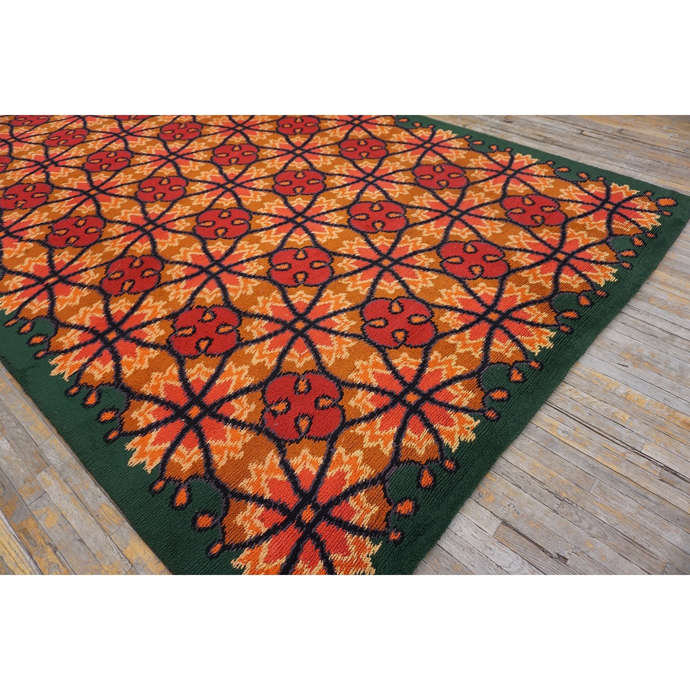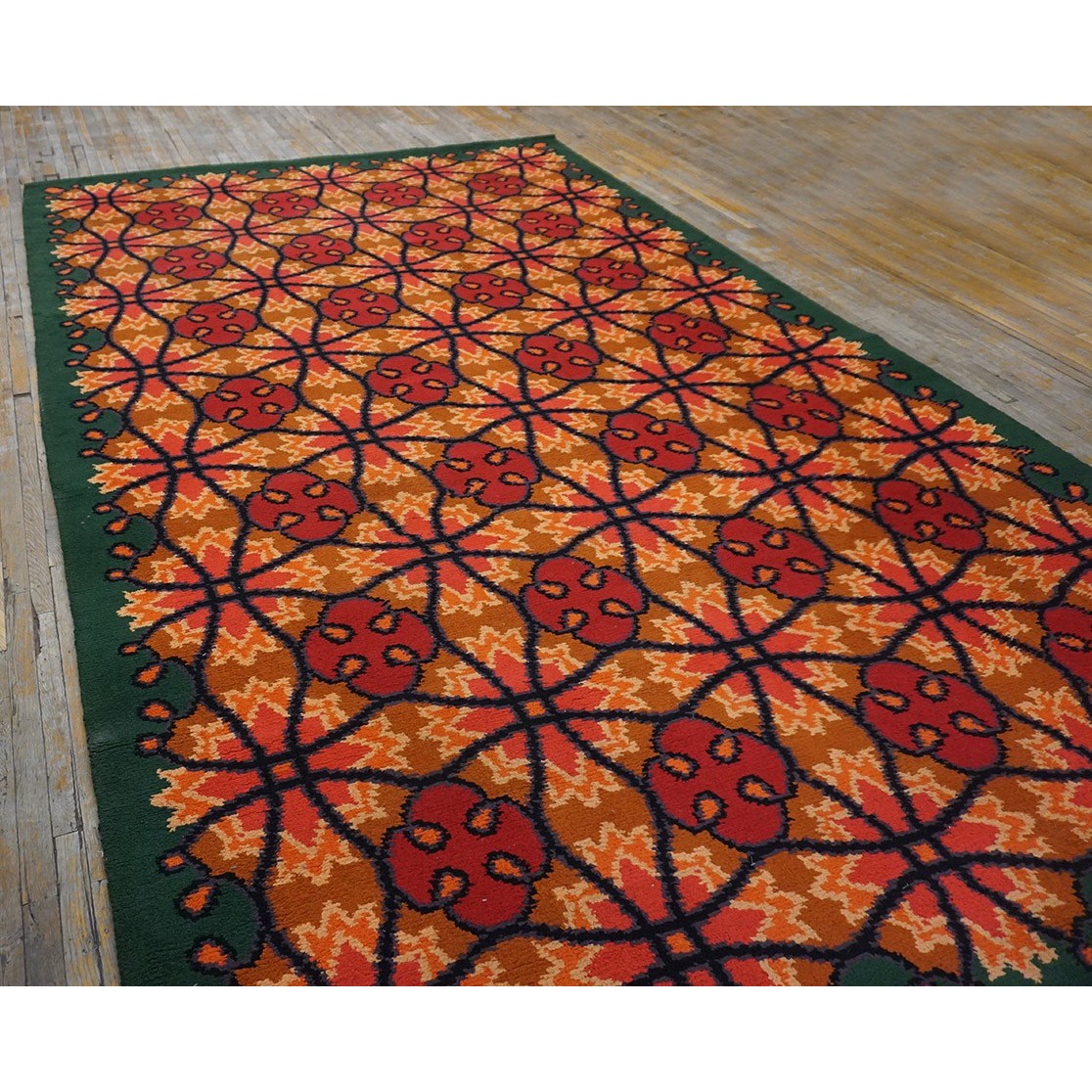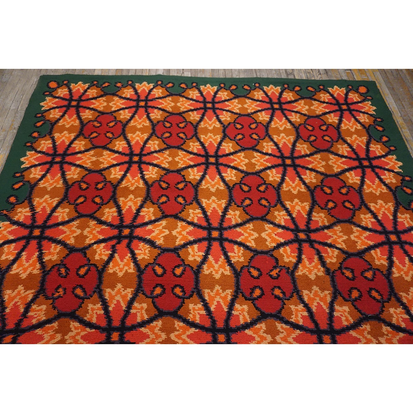 Pairs of wavy black lines define interlocking circles, horizontals and verticals, with underlying tiny flowers and larger cruciforms form the allover pattern of this postwar, borderless French carpet. There is but the slightest hint of a framing border and for all intents and purposes it can be regarded as a section of an infinite pattern allowing the versatile placement of any modern furniture.