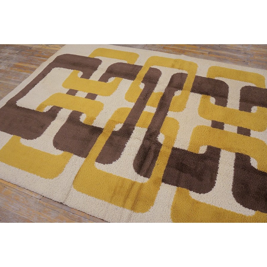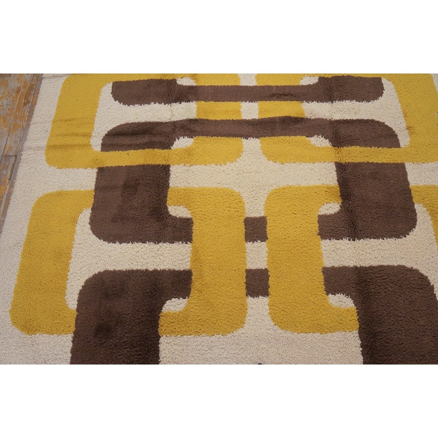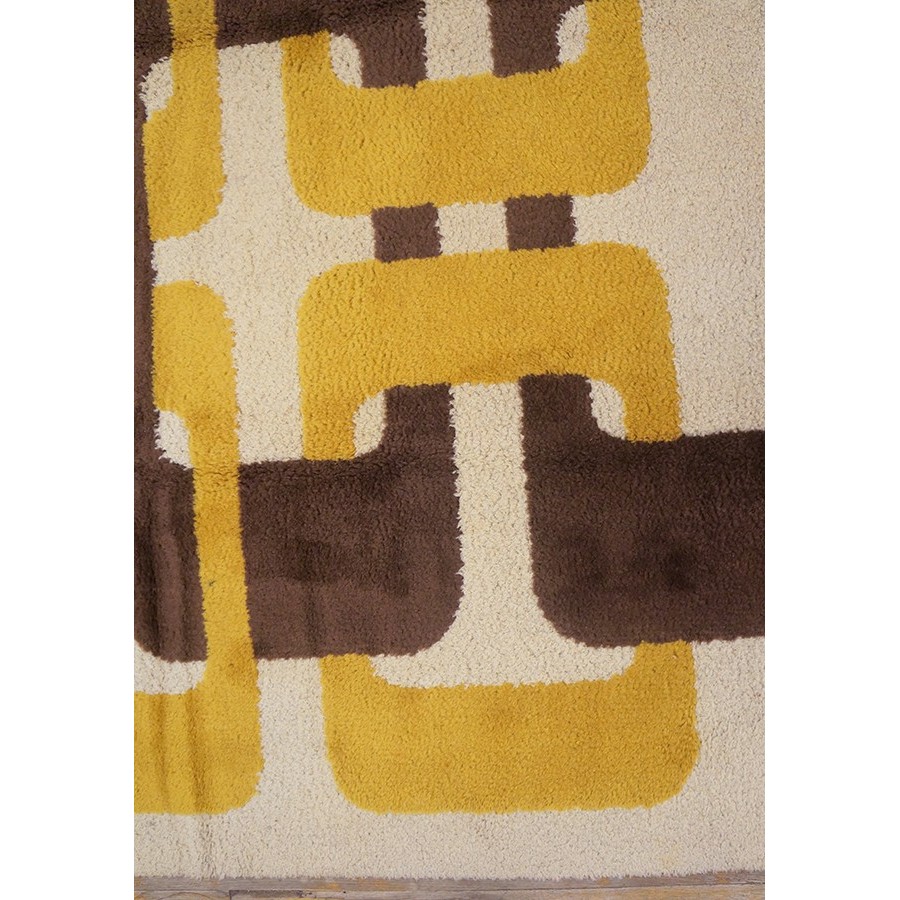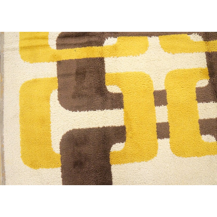 Danish Modern furniture requires Danish Modern rugs like this one to maximally achieve the desired unified effect. The ivory field of this border less,wholly abstract rug has nine interlocking bold, squared ovals in yellow and brown. The scale of the rug is greater than the actual size and it is the emphatic center of any room.