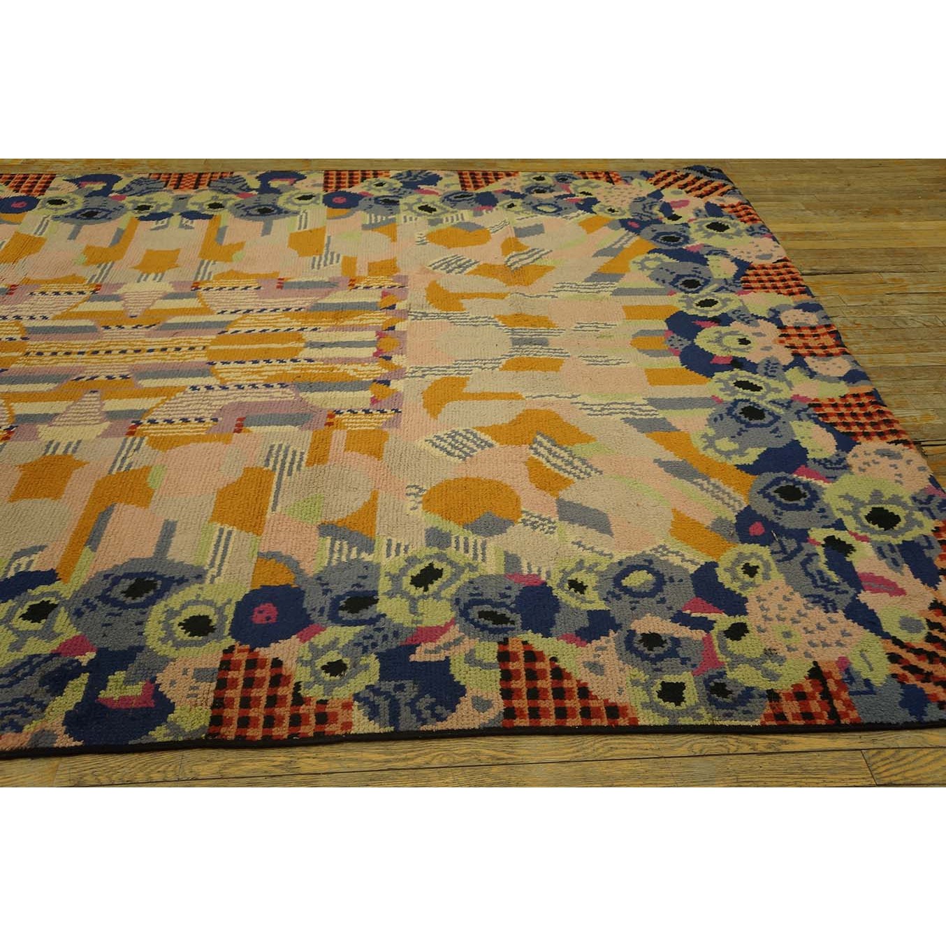Probably designed by Maurice Dufrenne, this French pile carpet shows his characteristic border collage of grids and flowers, with an ecru field decorated with goldenrod patches and striated fragments which cohere at the centre into a puzzle-pattern with teal accents. 1920s floral Art Deco rather than more hard-edged geometric Deco from the 1930s. Rare in this good condition.