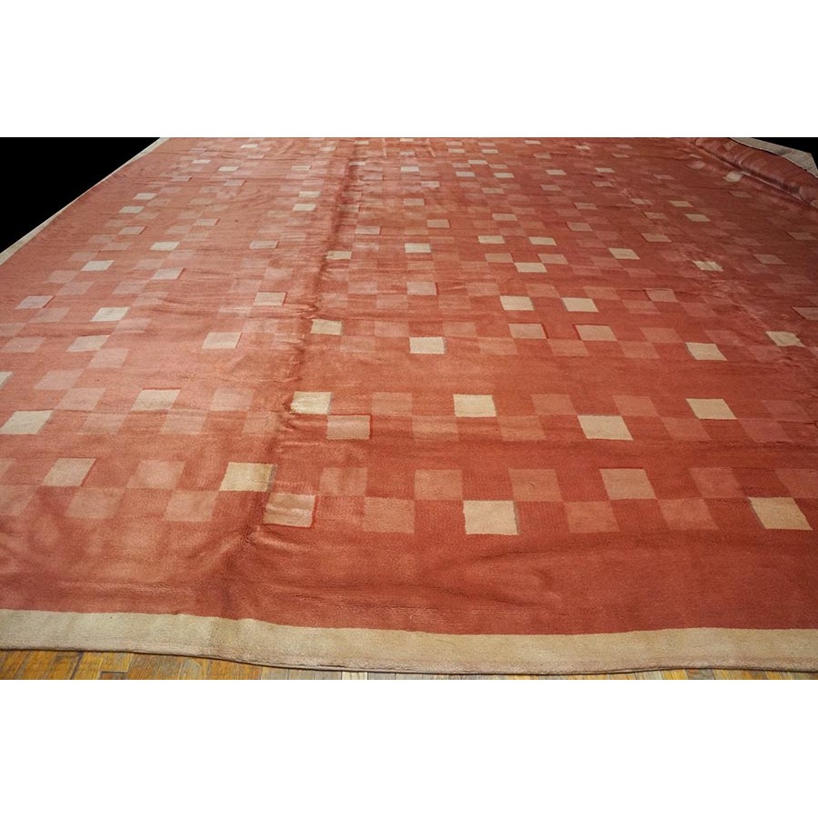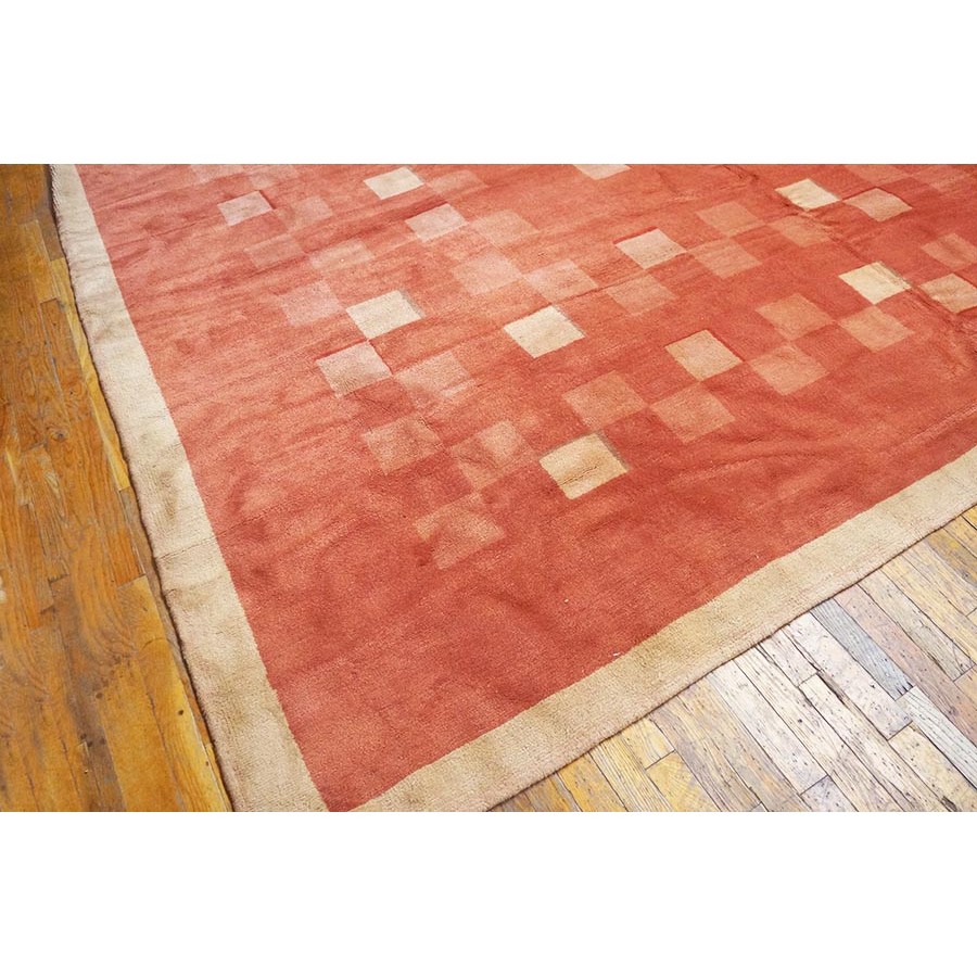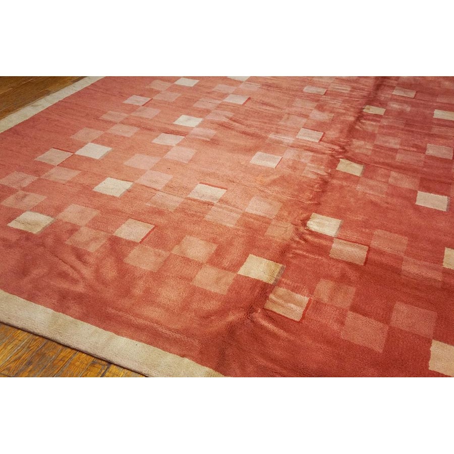 trend in the 1930’s. The pattern is created by rows and columns of identical, small square mosaic elements. The field is a raspberry- rose pink. The main border shows two distinct, concentric double rows of small squares.