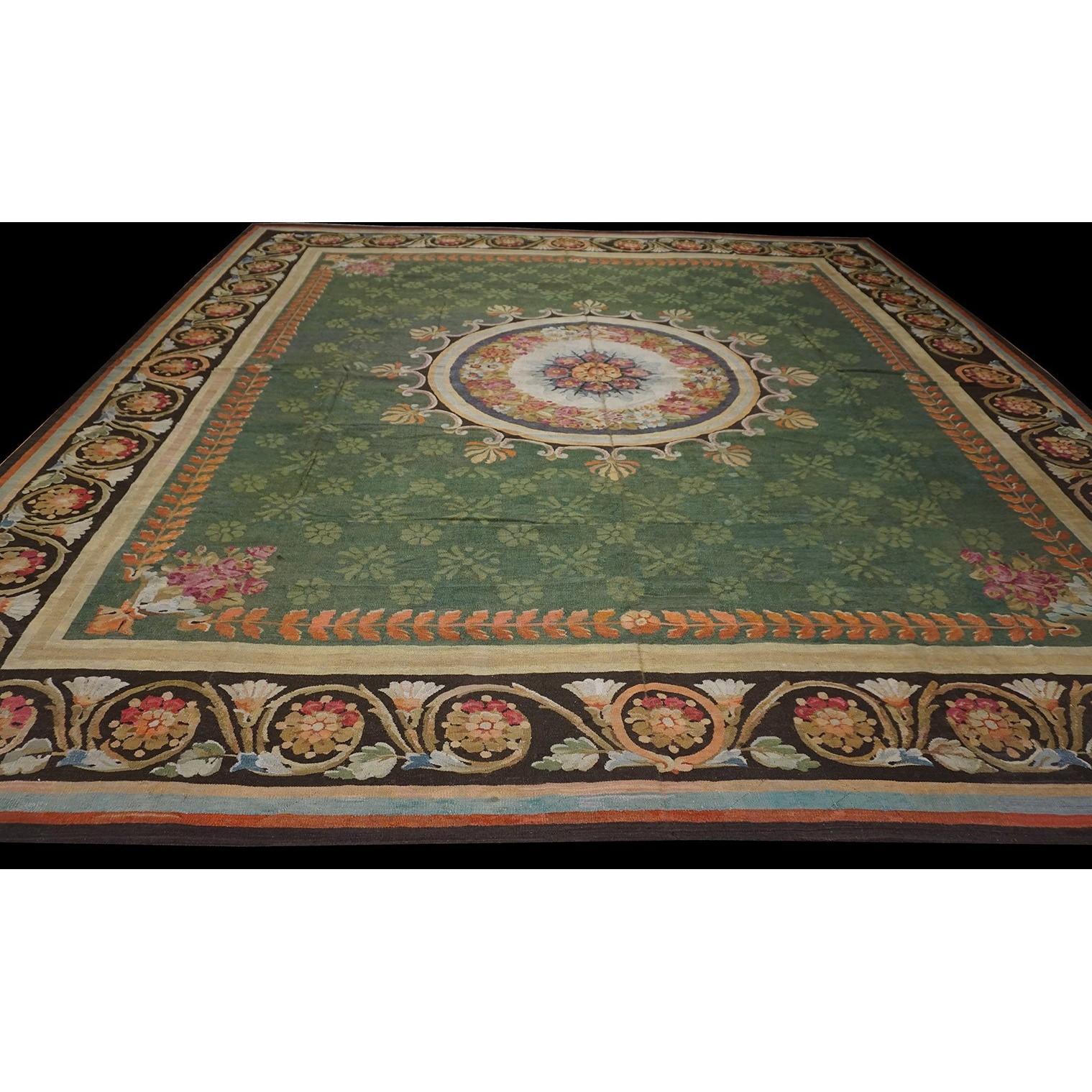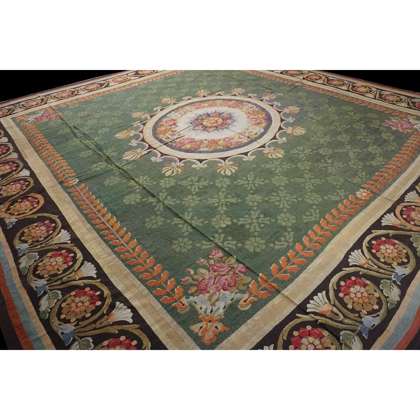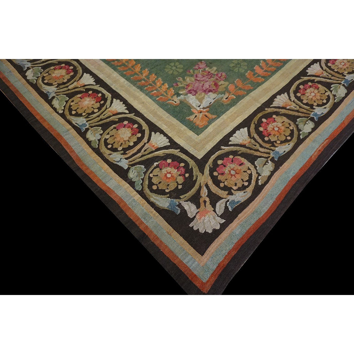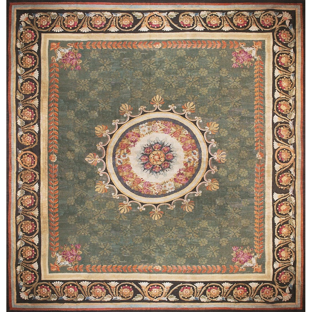 French 19th century rooms must often have been square since so many carpets of the c.1820 period are of similar dimensions. This is a classic early Charles X carpet, with a round medallion, green field with small floral background elements, small vases with bouquets in the field corners, and a bold black volute and trumpet flower border.If you want classic, this is it.
