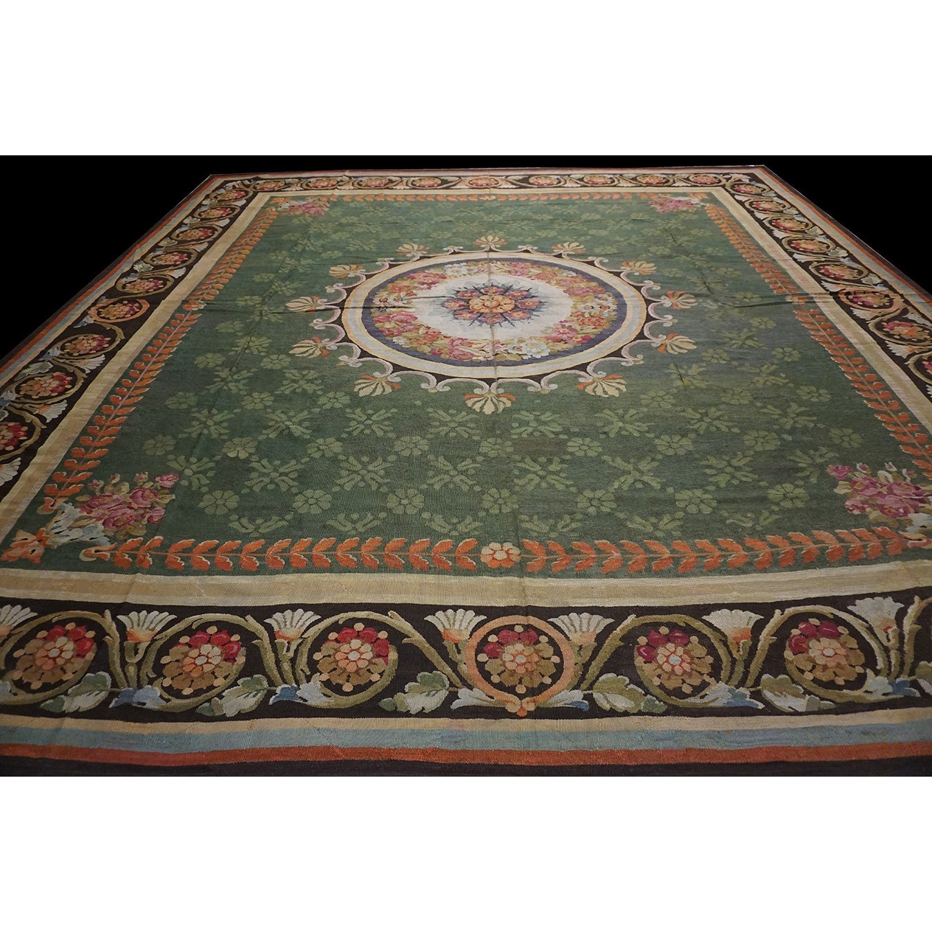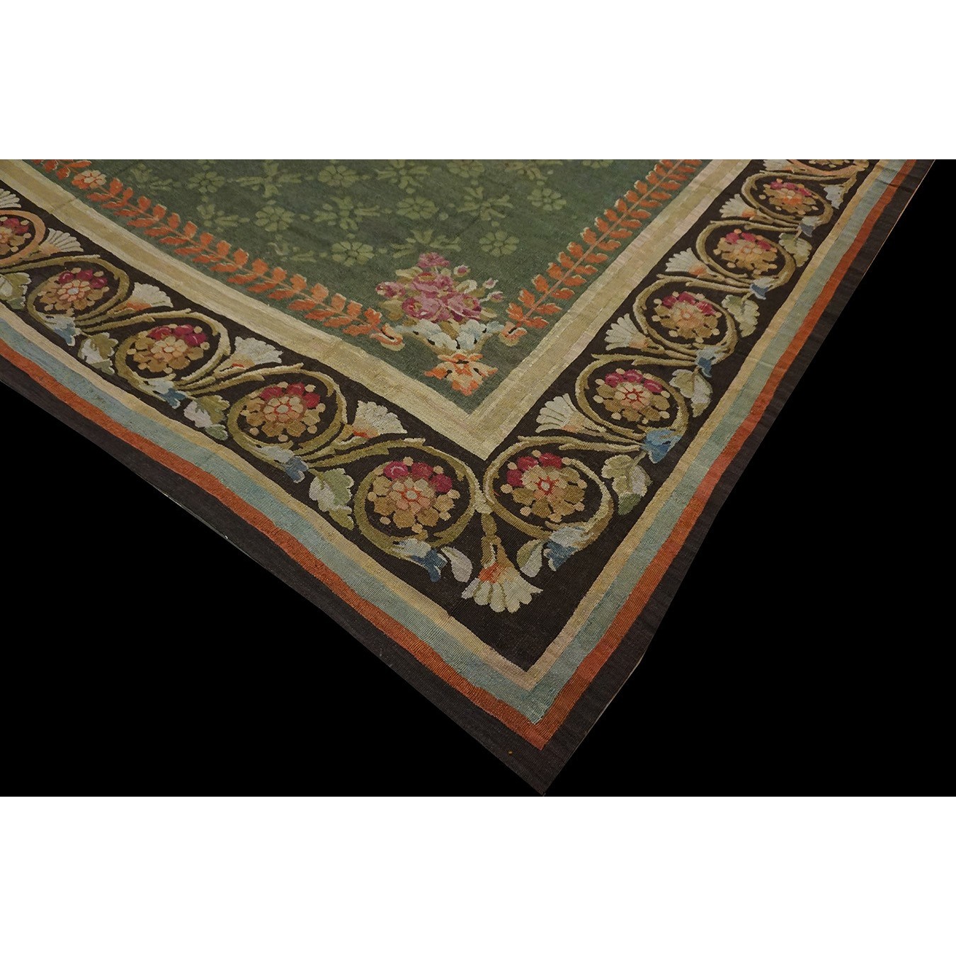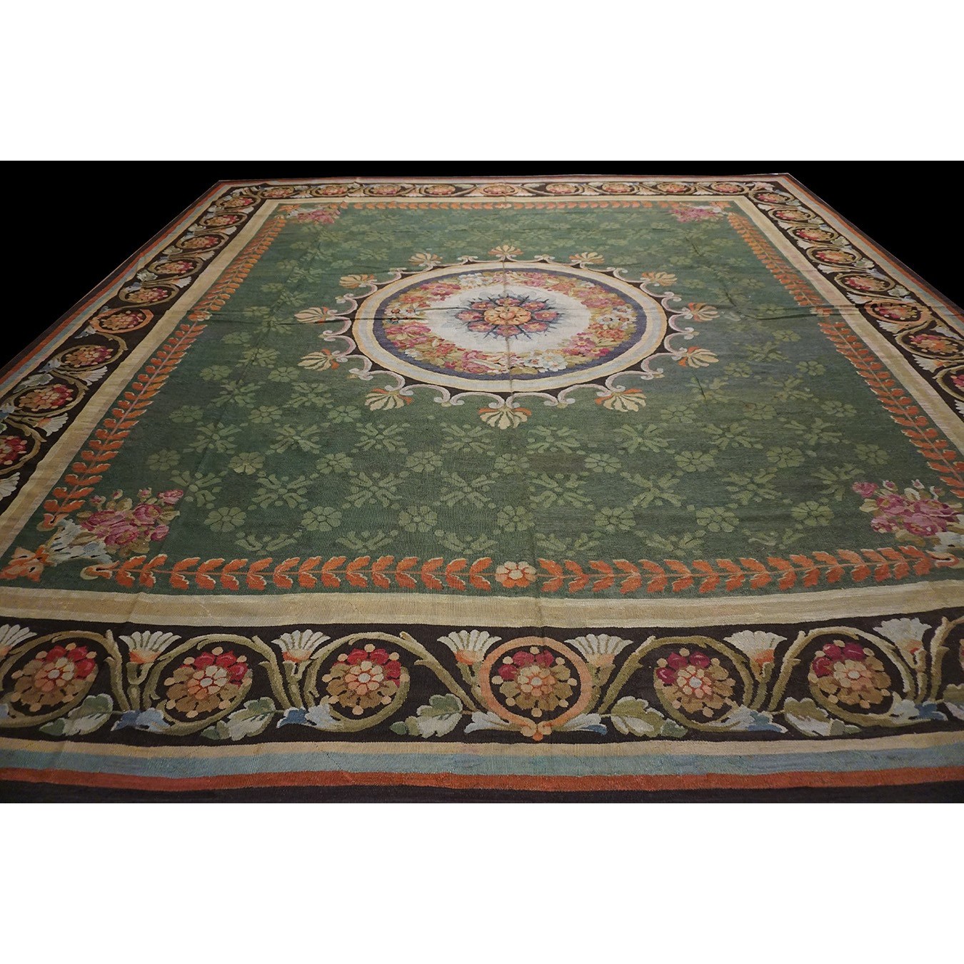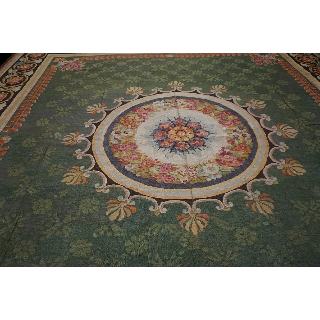 French 19th century rooms must often have been square since so many carpets of the c.1820 period are of similar dimensions. This is a classic early Charles X carpet, with a round medallion, green field with small floral background elements, small vases with bouquets in the field corners, and a bold black volute and trumpet flower border.If you want classic, this is it.