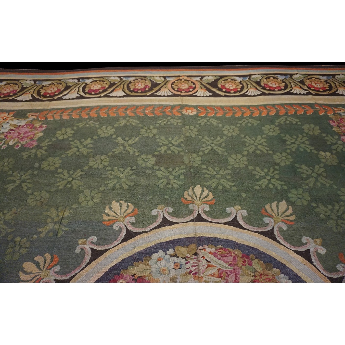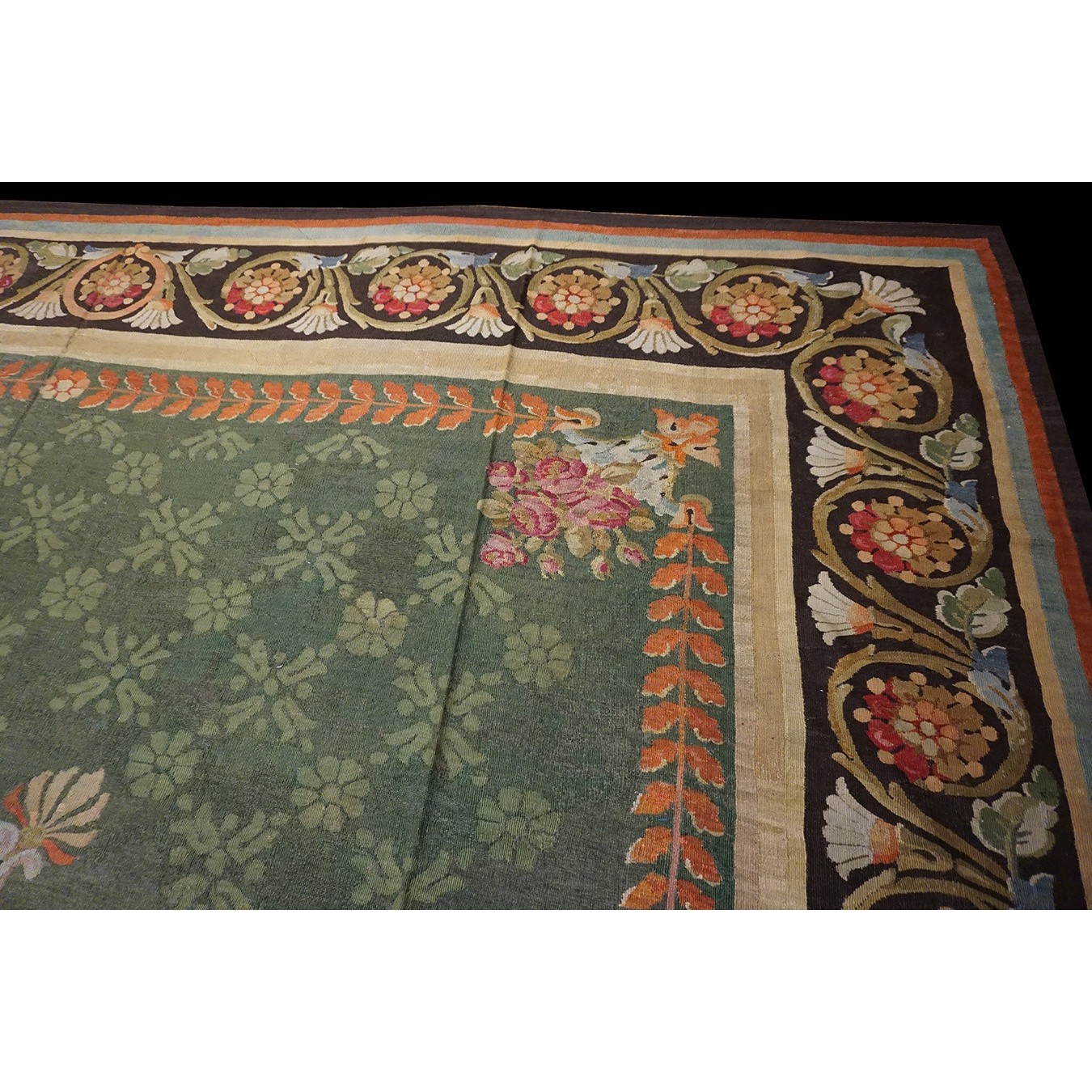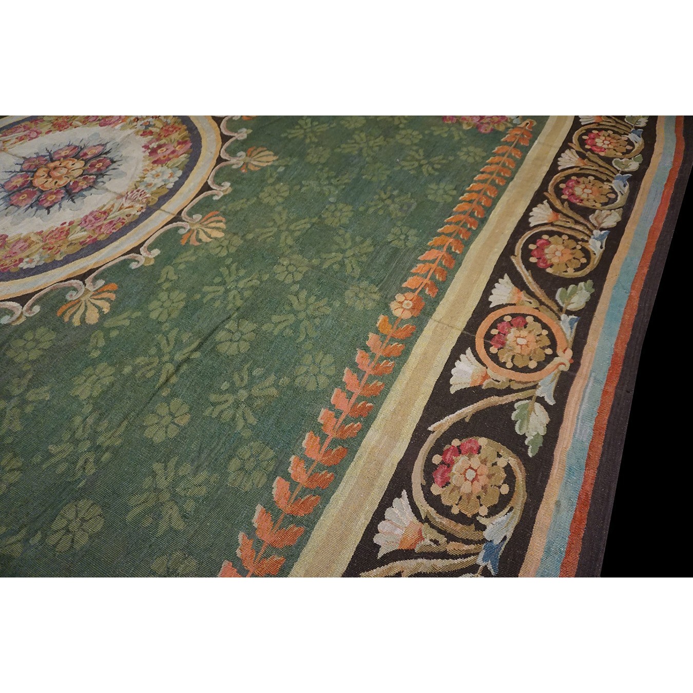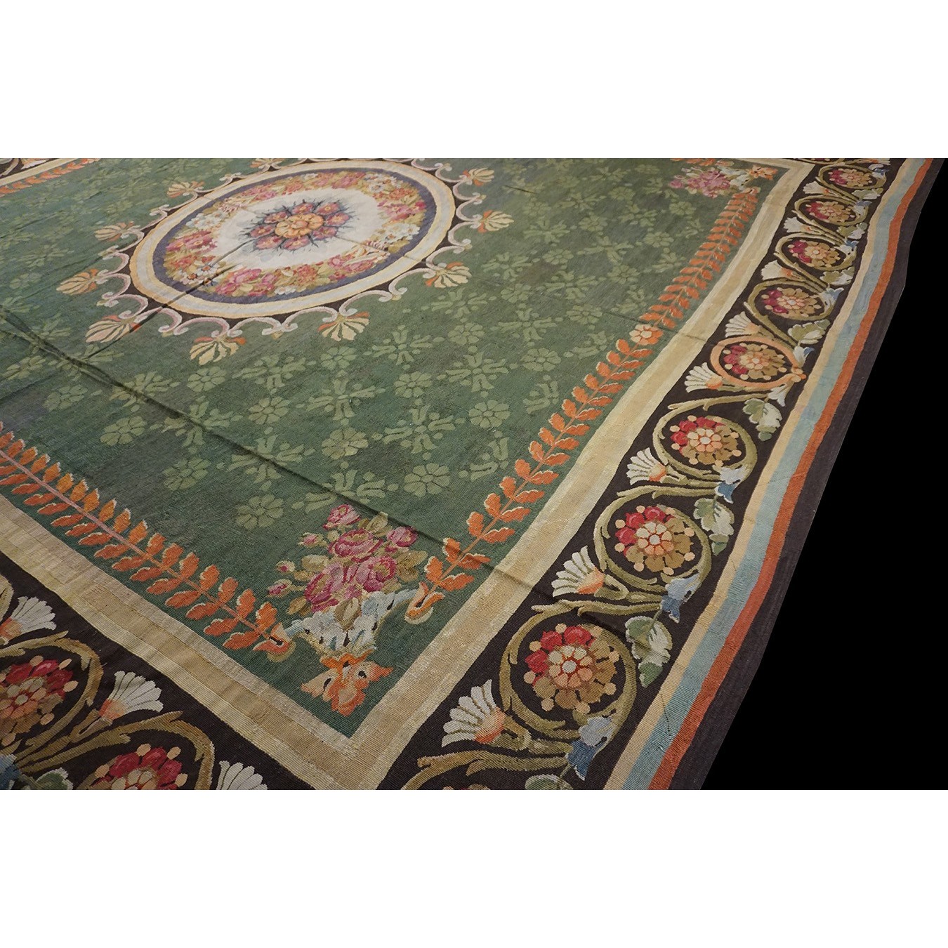 French 19th century rooms must often have been square since so many carpets of the c.1820 period are of similar dimensions. This is a classic early Charles X carpet, with a round medallion, green field with small floral background elements, small vases with bouquets in the field corners, and a bold black volute and trumpet flower border.If you want classic, this is it.