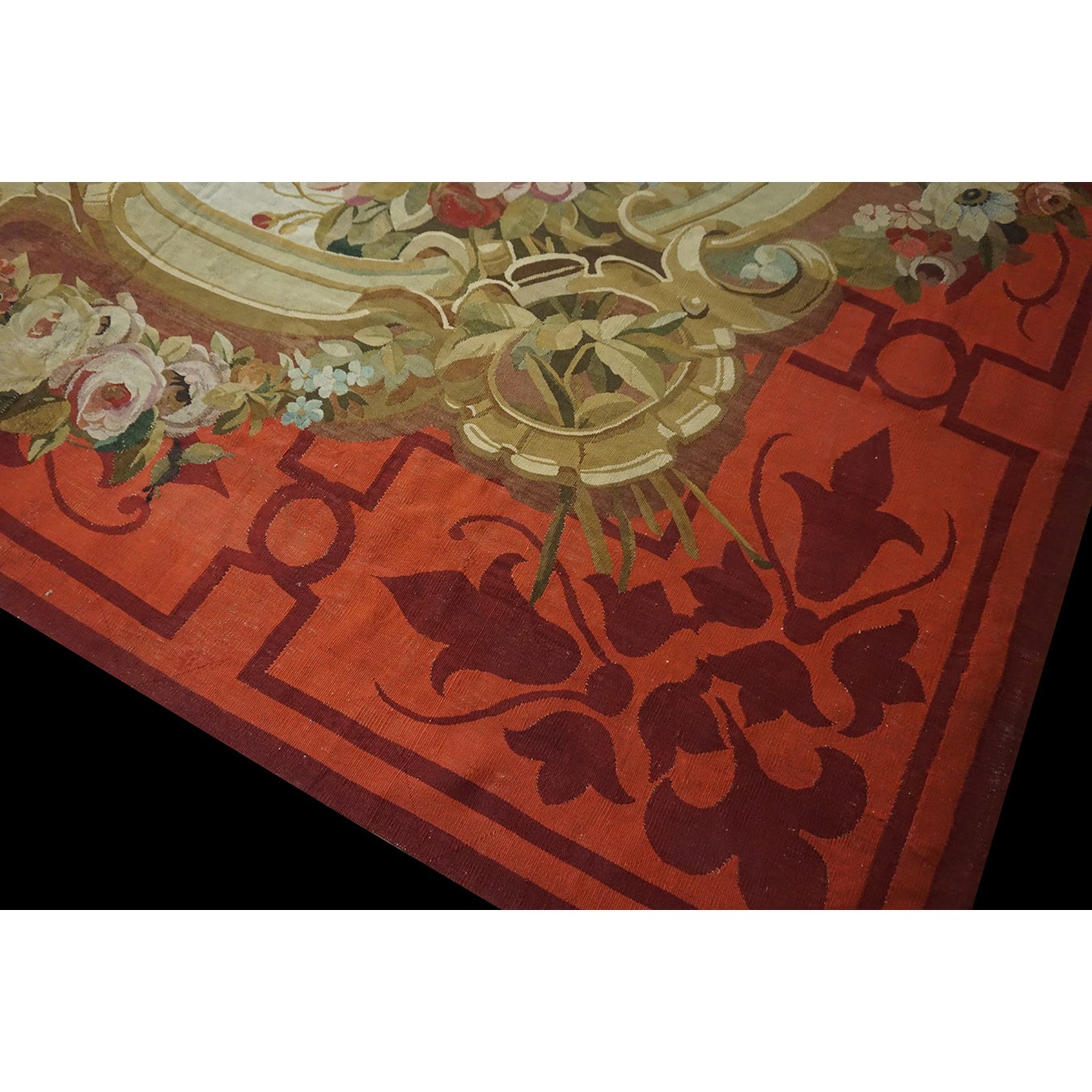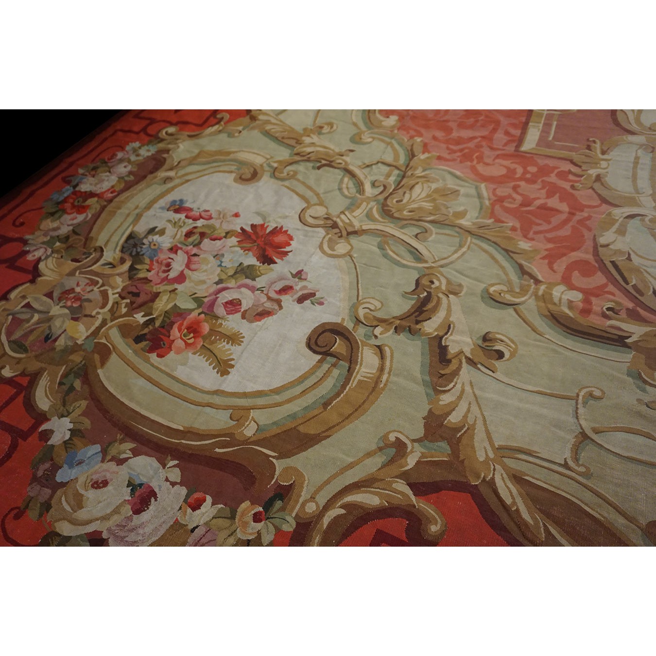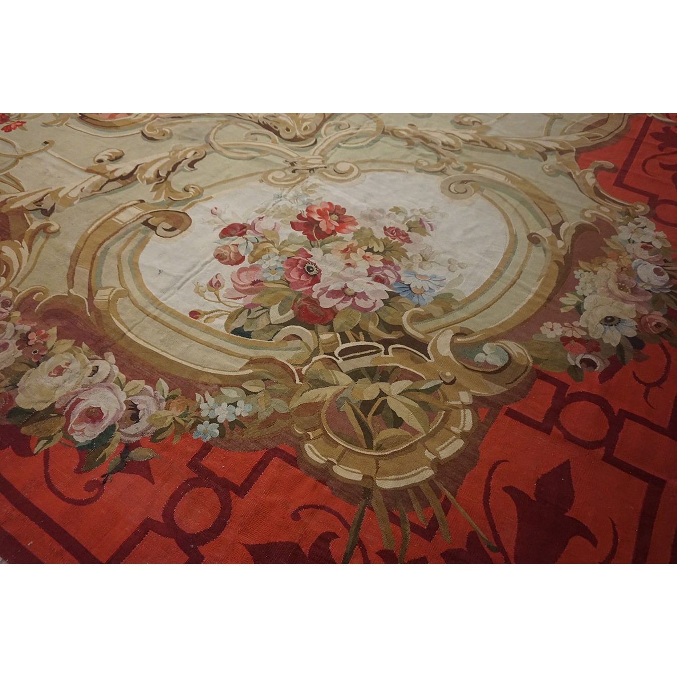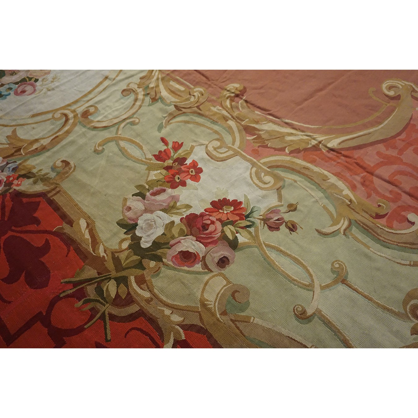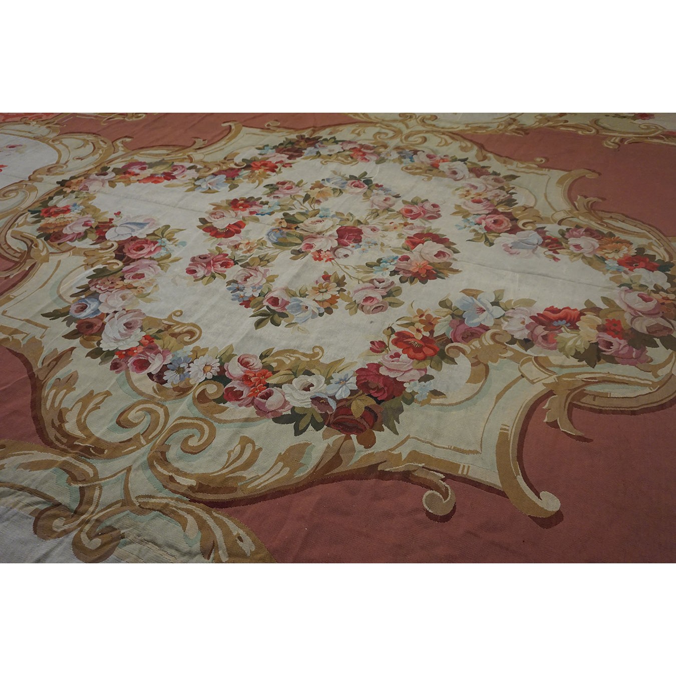 The looms of Aubusson , southwest of Paris, were able to weave carpets of extraordinary size, and this one is perfect for the grand salon of your chateau. The rose ground displays elaborate garland filled , gilt scroll edged cartouches strongly reminiscent of the ormolu mounts of contemporary Louis-style furniture. The ivory border has floral bouquets within more interconnected cartouches edged with acanthus scrolls. The effect is feminine and yet expansive.