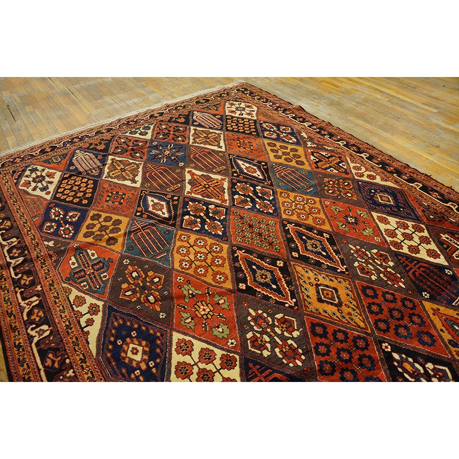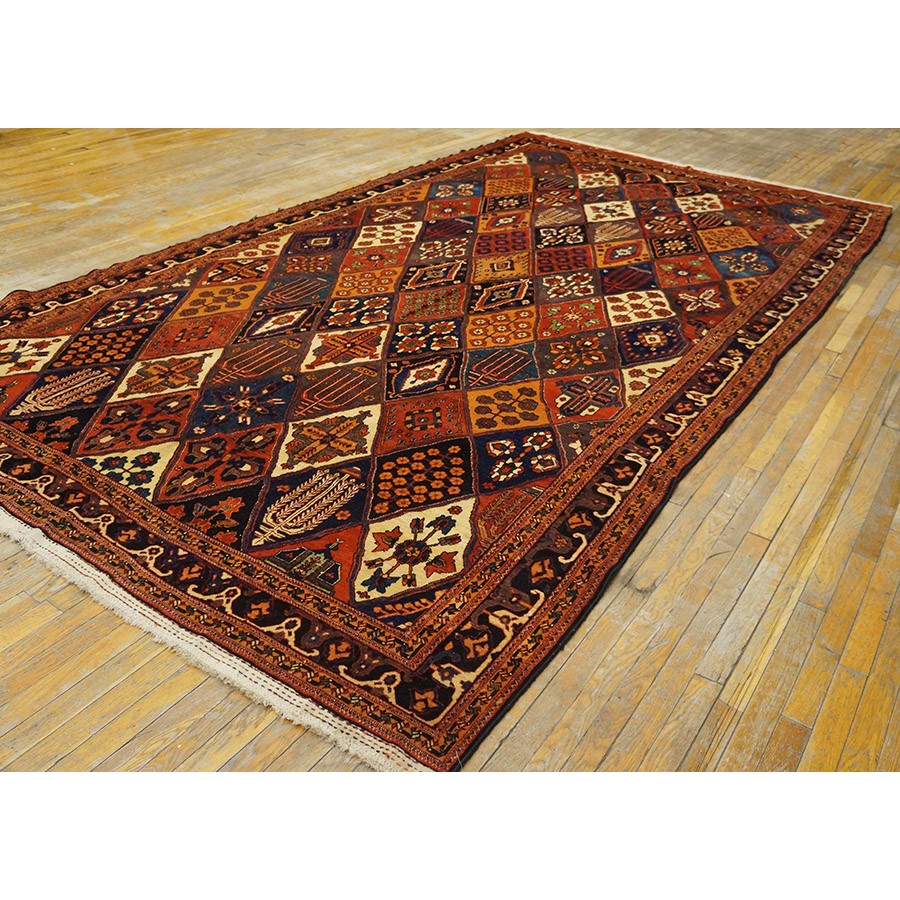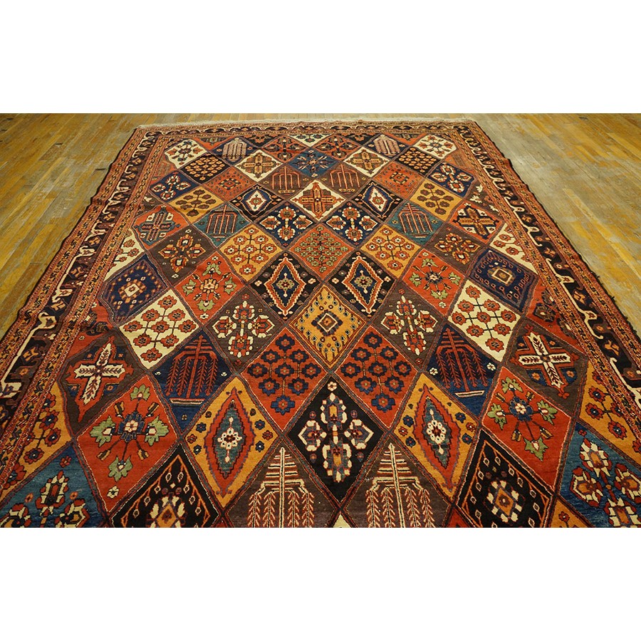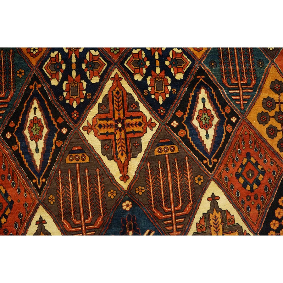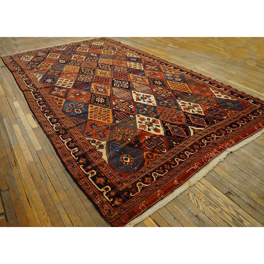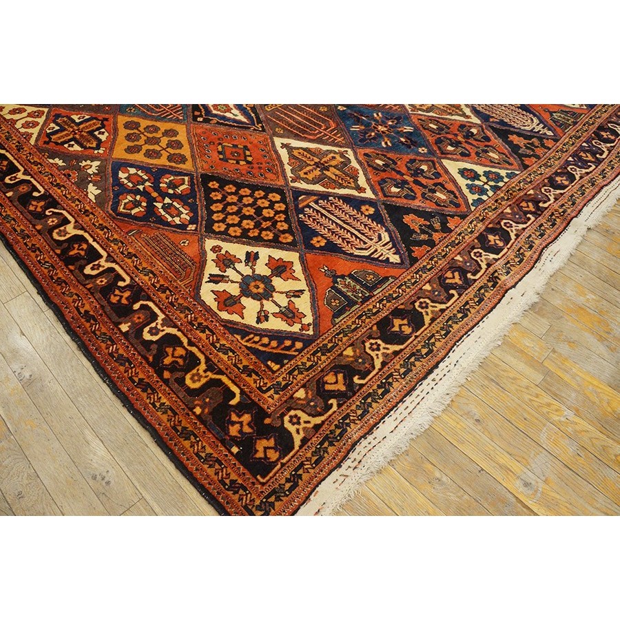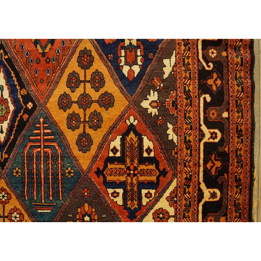 DescriptionBakhtiariThese carpets are made in the Chahar Mahal (Four Places) are of southwest Iran by sedentary villagers, some Armenian, rather than by the nomadic Bakhtiari tribespeoples. They tend to large, square sizes, often over 20 feet in length. Designs are frequently a panel pattern derived from garden carpets, but also lozenge lattices or angular medallions also appear. Colors are bright and the weave is robust. A small group of rugs was made for the Bakhtiari Khans (tribal leaders) early in the 20th century. They are often inscribed and are of very fine workmanship. The more frequently encountered pieces are moderately priced and often in excellent condition. | |