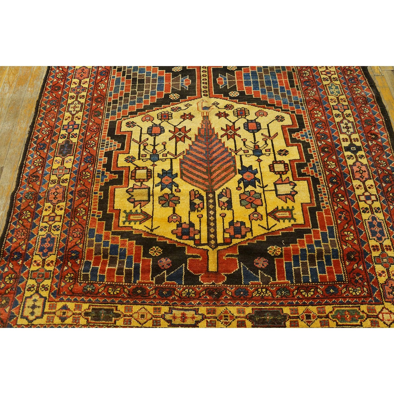 These carpets are made in the Chahar Mahal (“Four Places”) are of southwest Iran by sedentary villagers, some Armenian, rather than by the nomadic Bakhtiari tribespeoples. They tend to large, square sizes, often over 20 feet in length. Designs are frequently a panel pattern derived from garden carpets, but also lozenge lattices or angular medallions also appear. Colors are bright and the weave is robust. A small group of rugs was made for the Bakhtiari Khans (tribal leaders) early in the 20th century. They are often inscribed and are of very fine workmanship. The more frequently encountered pieces are moderately priced and often in excellent condition.