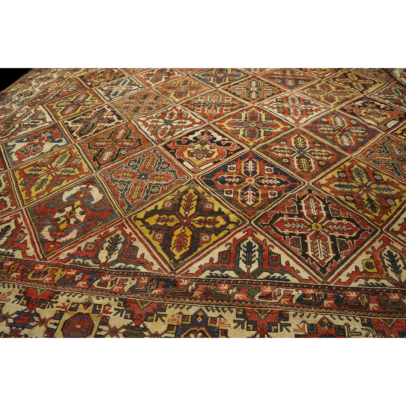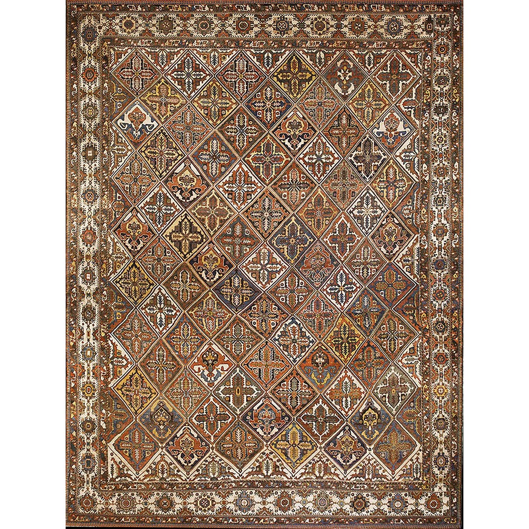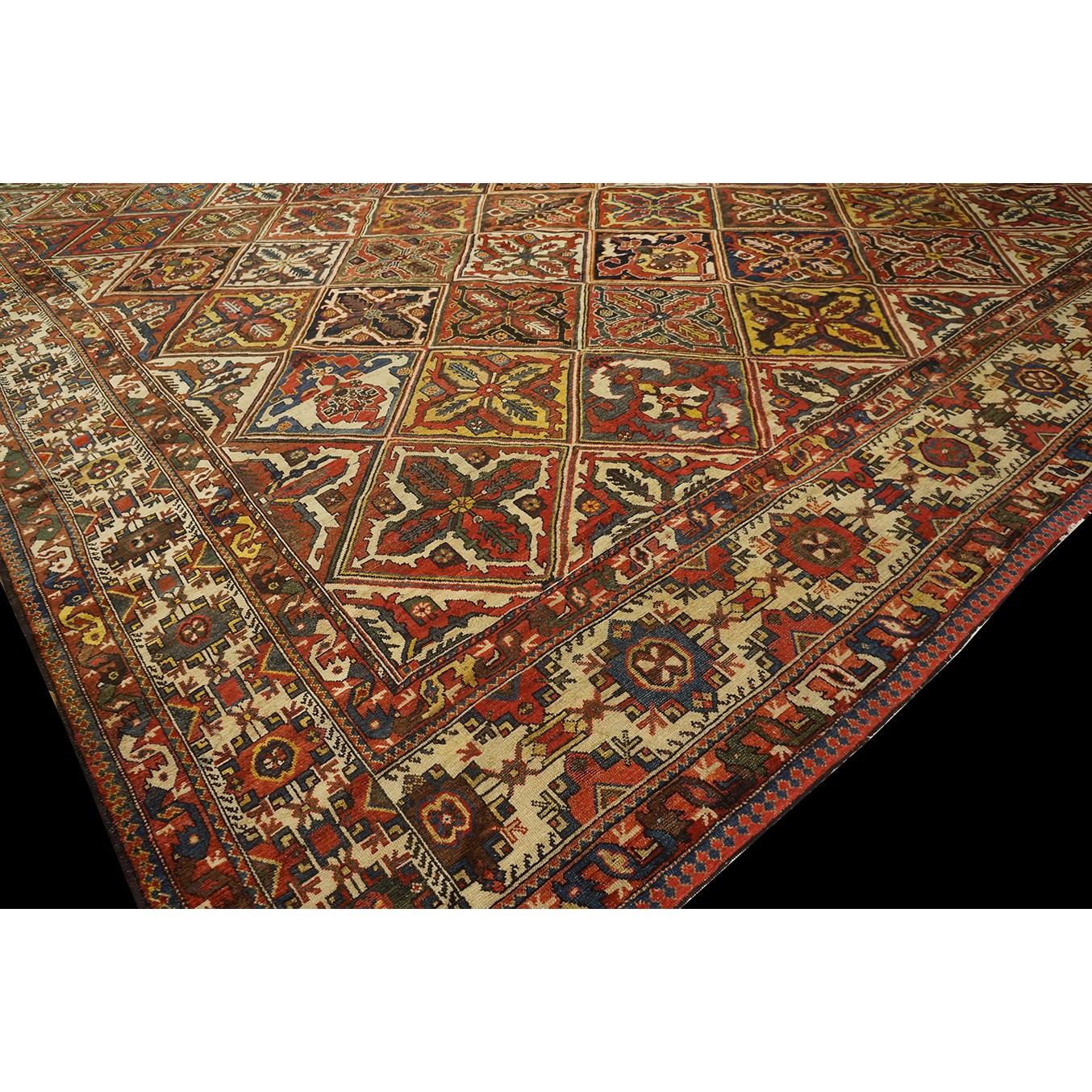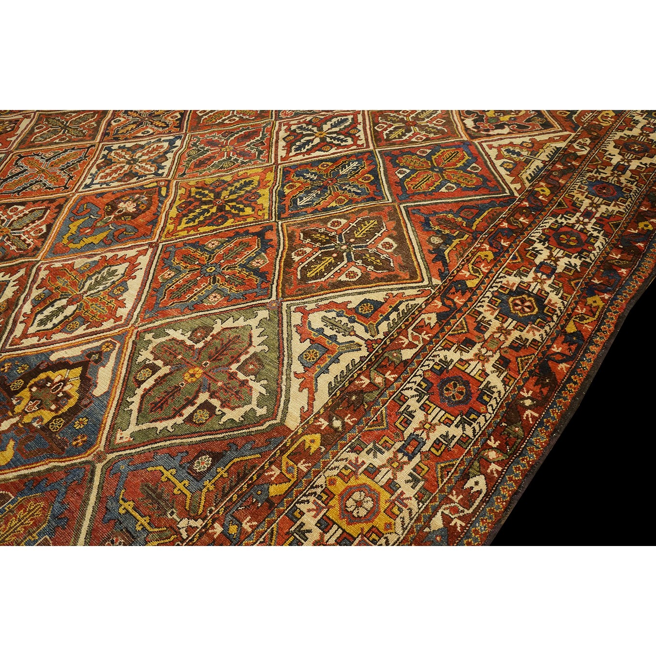 DescriptionBakhtiariThese carpets are made in the Chahar Mahal (Four Places) are of southwest Iran by sedentary villagers, some Armenian, rather than by the nomadic Bakhtiari tribespeoples. They tend to large, square sizes, often over 20 feet in length. Designs are frequently a panel pattern derived from garden carpets, but also lozenge lattices or angular medallions also appear. Colors are bright and the weave is robust. A small group of rugs was made for the Bakhtiari Khans (tribal leaders) early in the 20th century. They are often inscribed and are of very fine workmanship. The more frequently encountered pieces are moderately priced and often in excellent condition. | |