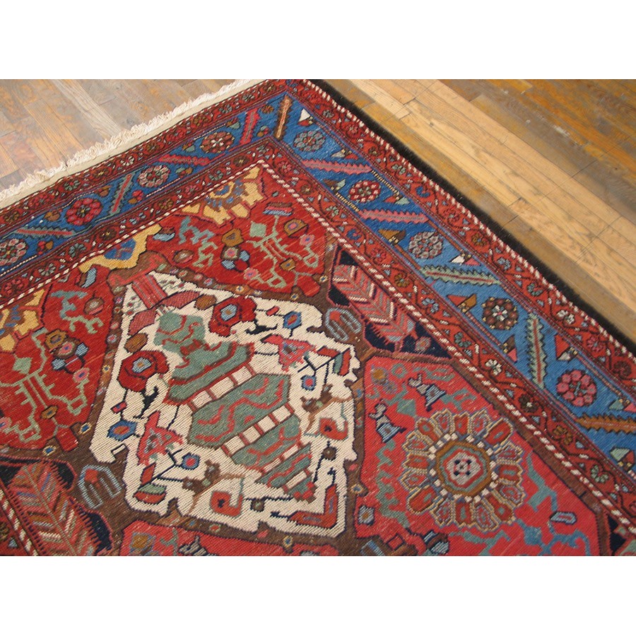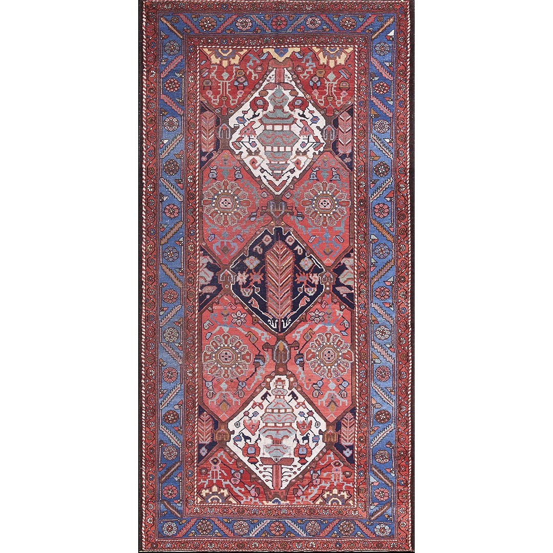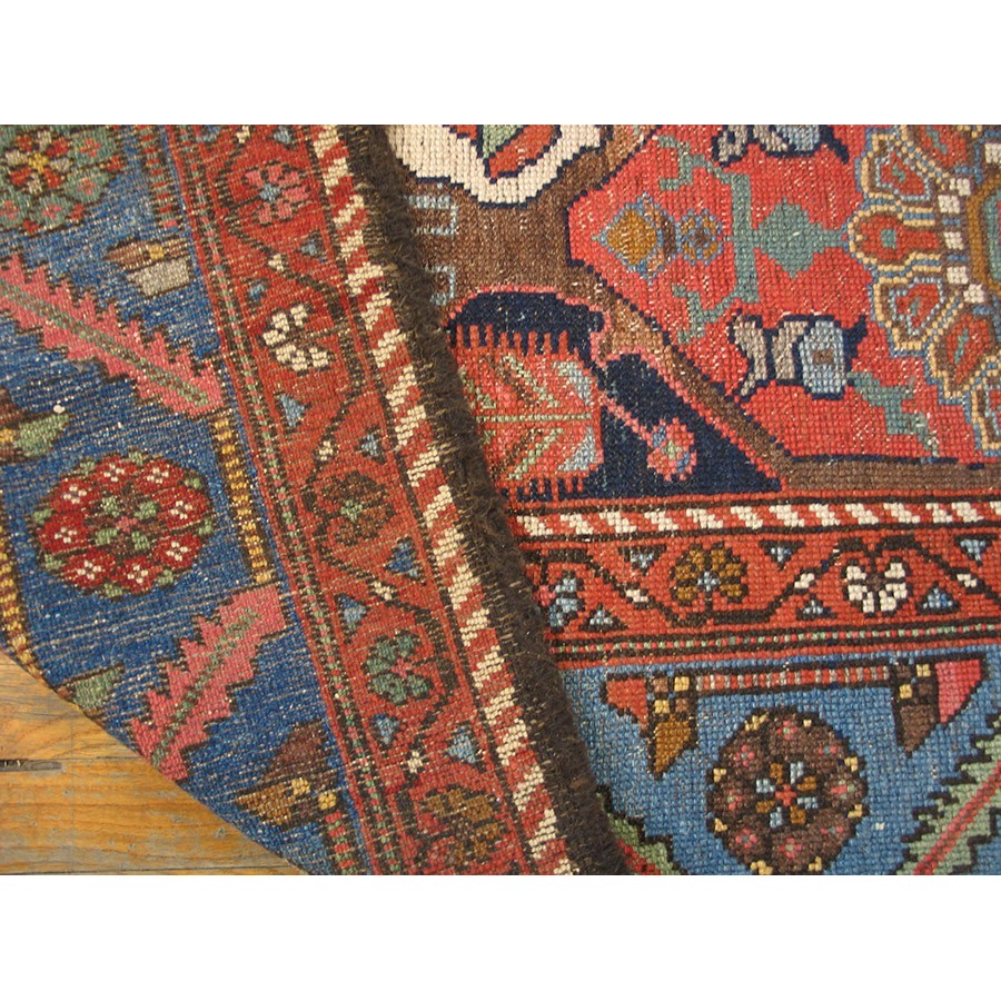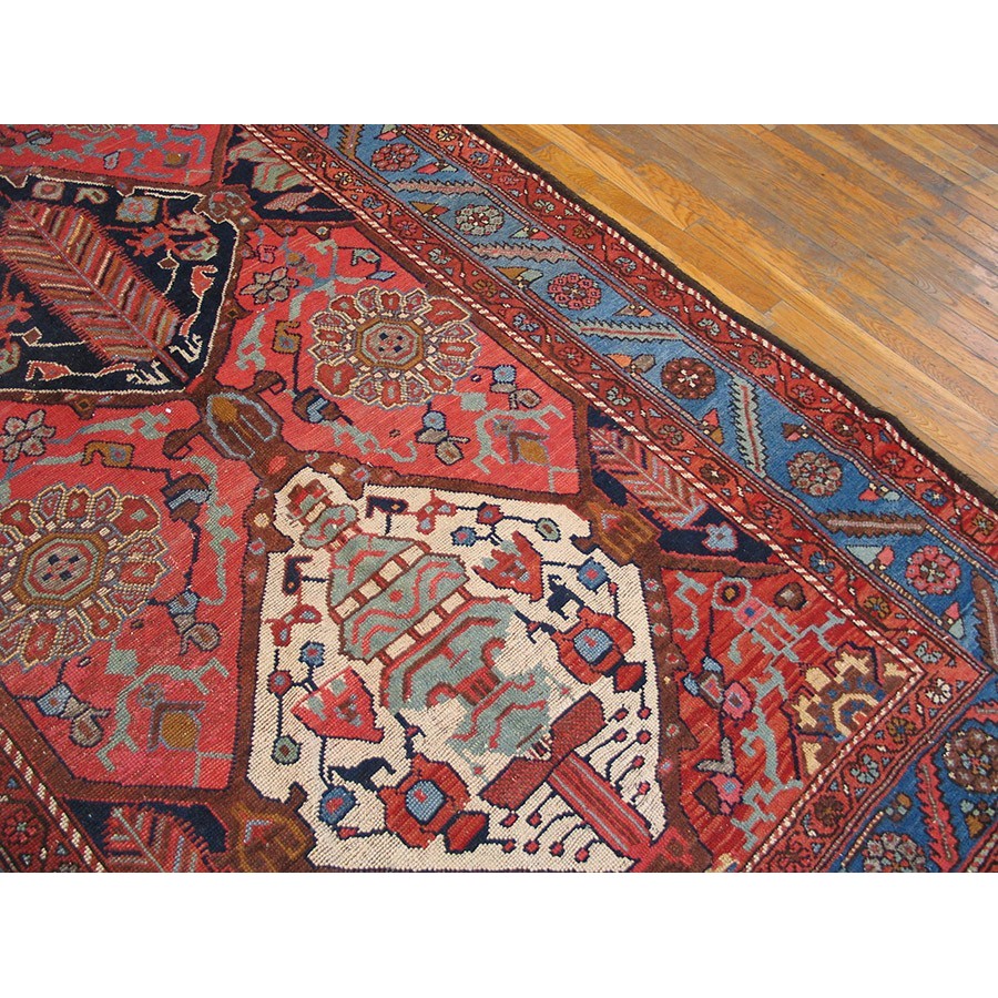 DescriptionBakhtiariThese carpets are made in the Chahar Mahal (Four Places) are of southwest Iran by sedentary villagers, some Armenian, rather than by the nomadic Bakhtiari tribespeoples. They tend to large, square sizes, often over 20 feet in length. Designs are frequently a panel pattern derived from garden carpets, but also lozenge lattices or angular medallions also appear. Colors are bright and the weave is robust. A small group of rugs was made for the Bakhtiari Khans (tribal leaders) early in the 20th century. They are often inscribed and are of very fine workmanship. The more frequently encountered pieces are moderately priced and often in excellent condition. | |