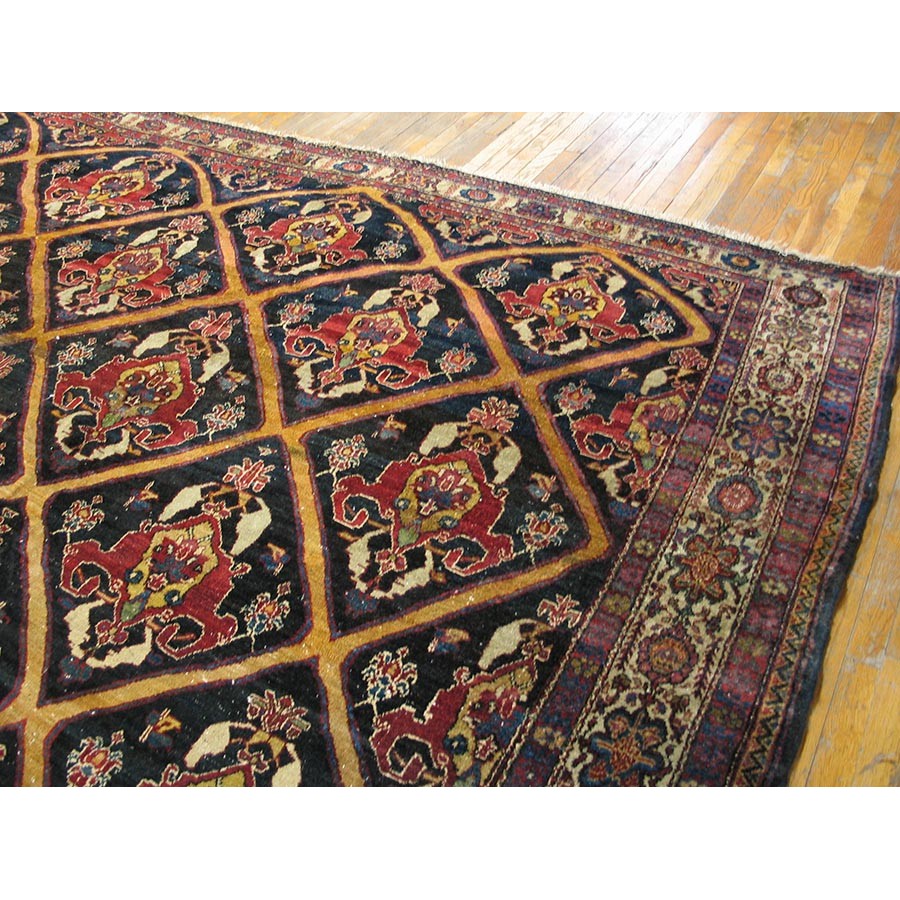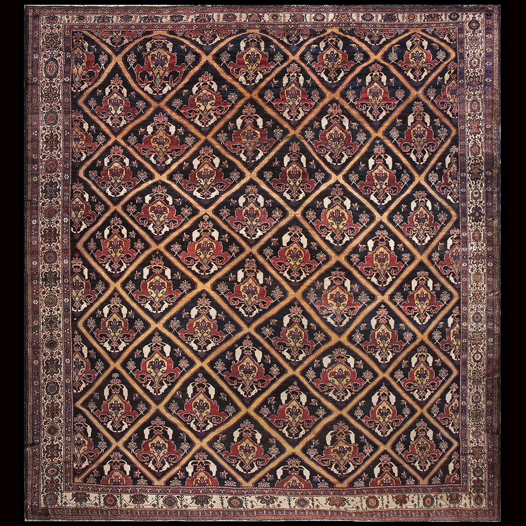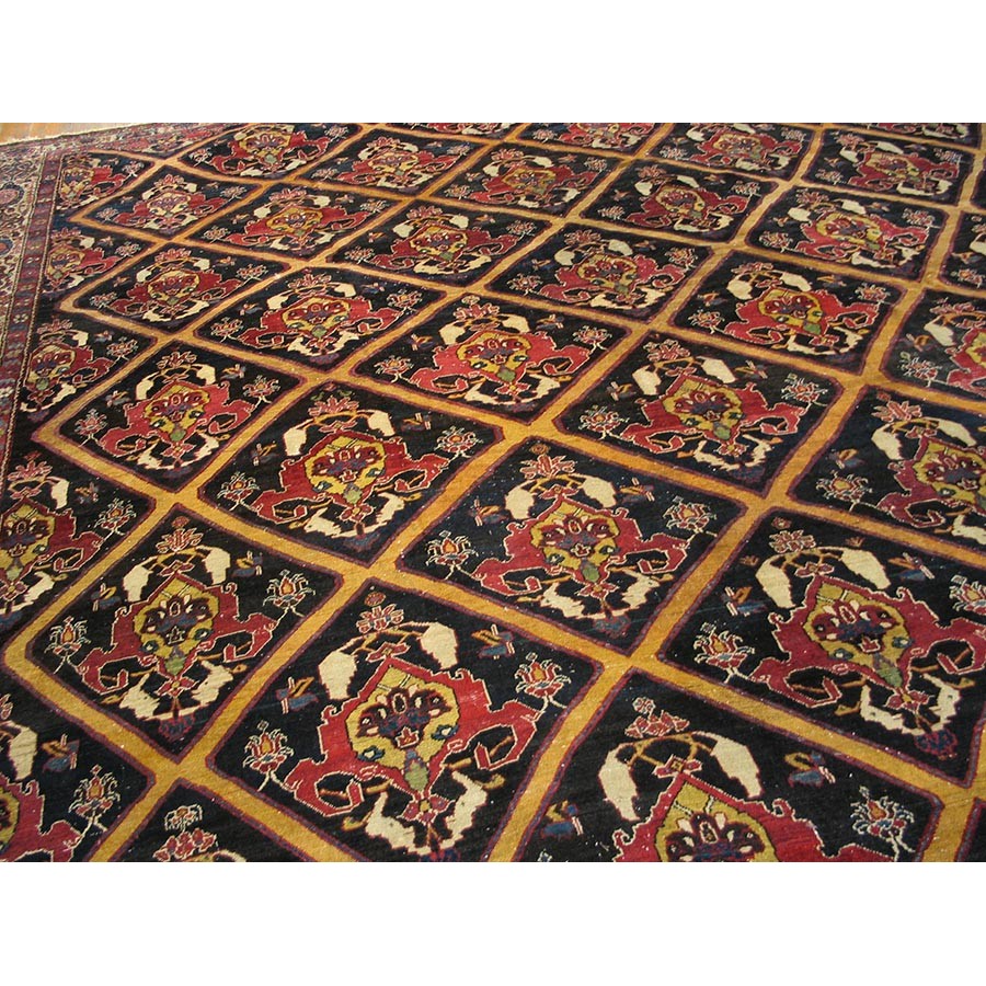 DescriptionBakhtiariThese carpets are made in the Chahar Mahal (Four Places) are of southwest Iran by sedentary villagers, some Armenian, rather than by the nomadic Bakhtiari tribespeoples. They tend to large, square sizes, often over 20 feet in length. Designs are frequently a panel pattern derived from garden carpets, but also lozenge lattices or angular medallions also appear. Colors are bright and the weave is robust. A small group of rugs was made for the Bakhtiari Khans (tribal leaders) early in the 20th century. They are often inscribed and are of very fine workmanship. The more frequently encountered pieces are moderately priced and often in excellent condition. | |