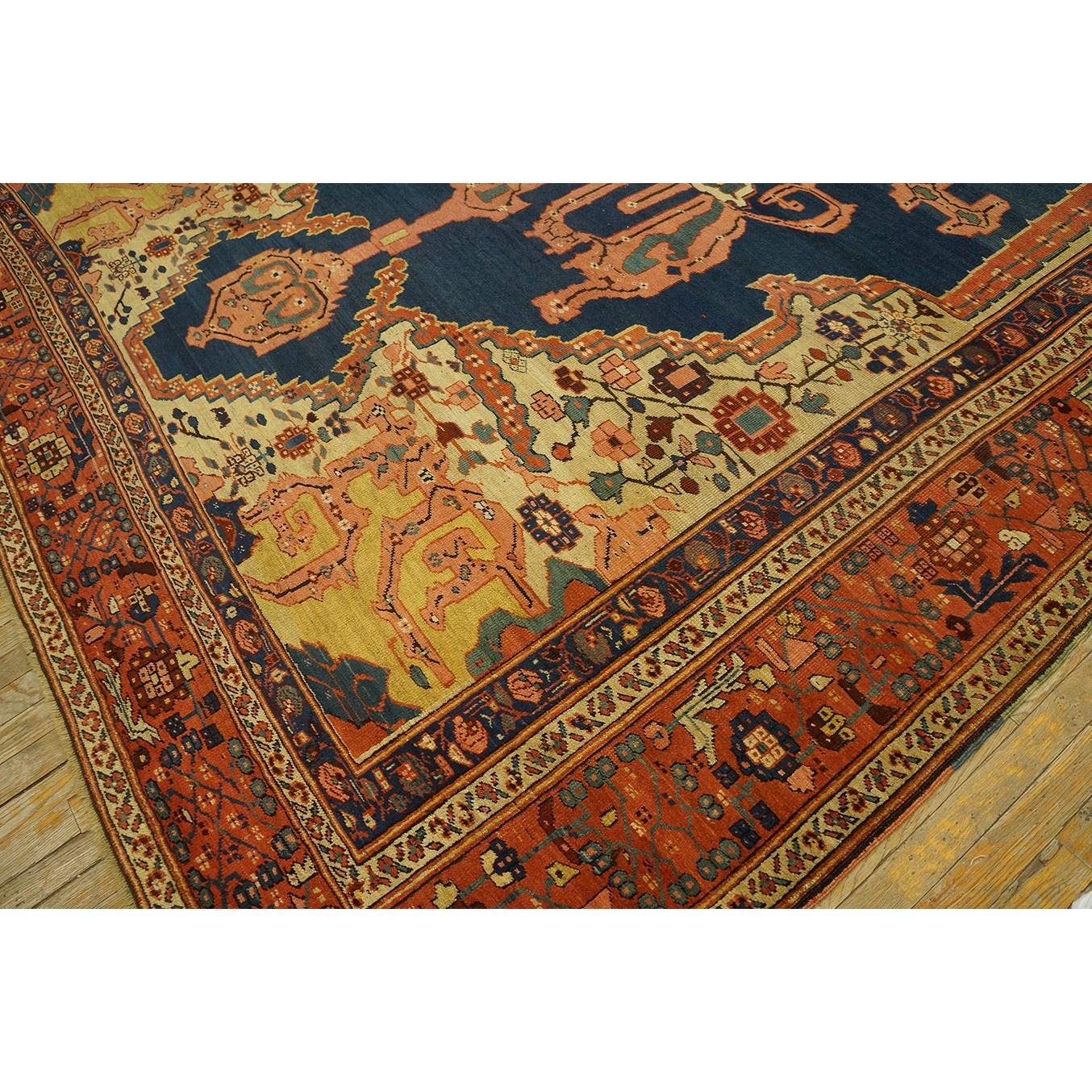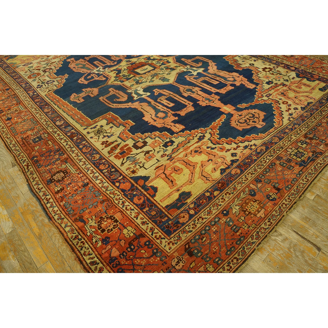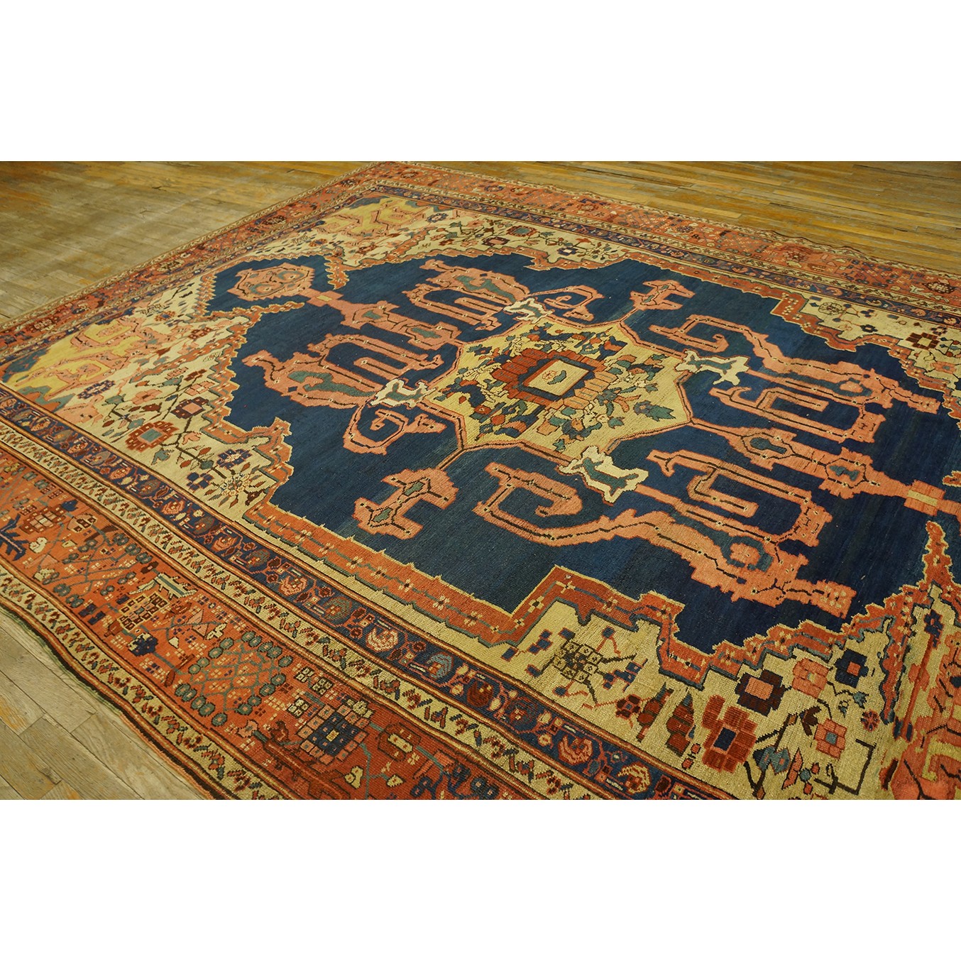 The sand field is filled with small flowers and shows straw projecting volute corners, while supporting an attractively abrashed royal blue “animal pelt” sub-field which, in turn, encloses a central straw octogramme sprouting powerful volute arabesque corner extensions. Ivory central square with surrounding rust “finger” fringe. Rust main border with square rosettes, dark blue barbed leaves and arrays of little geometric flowers (Karaja style). Solid weave. Good condition.