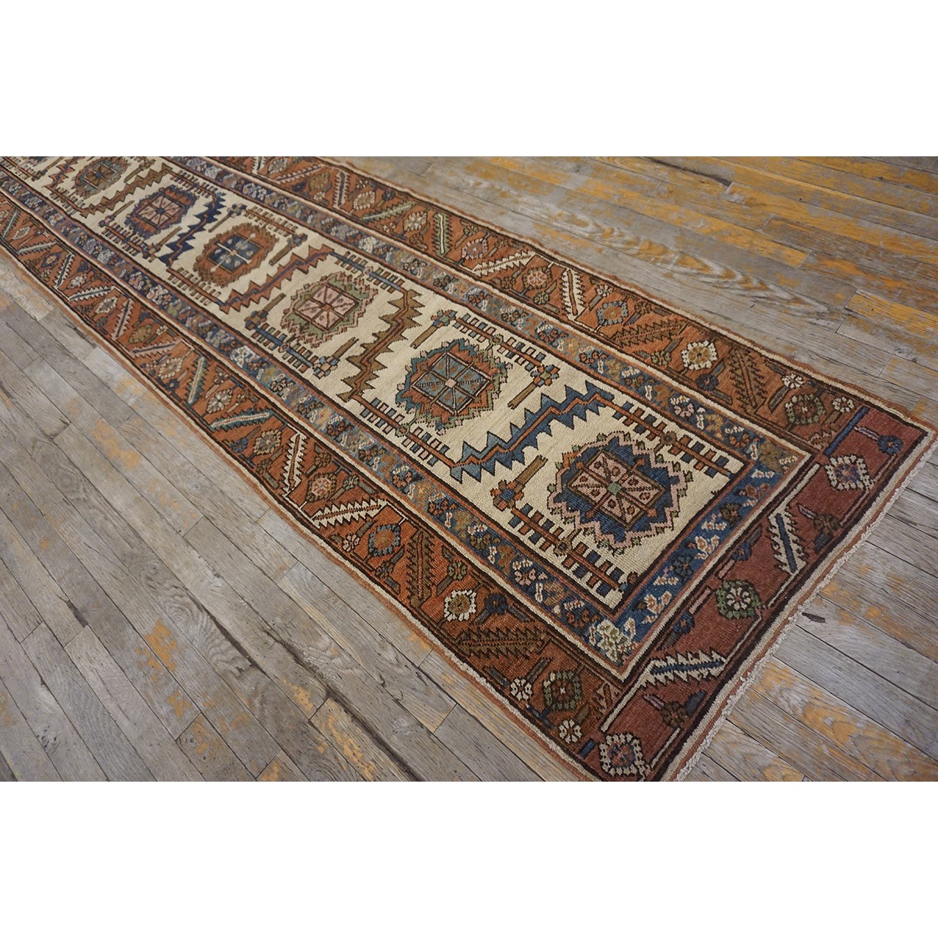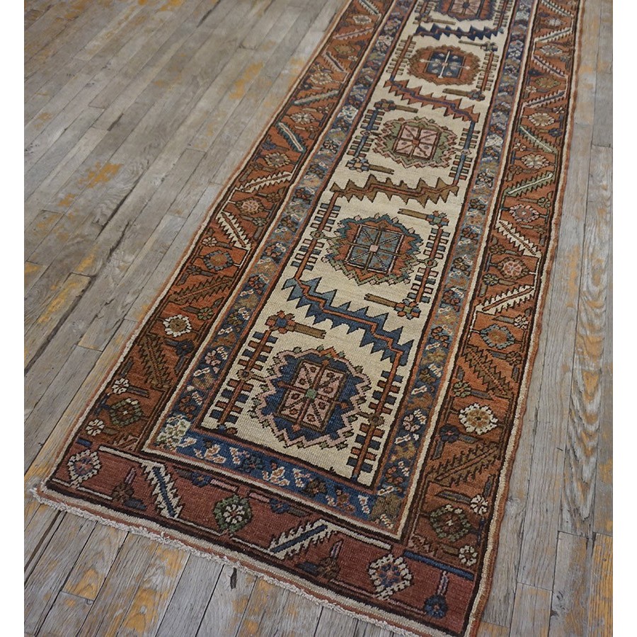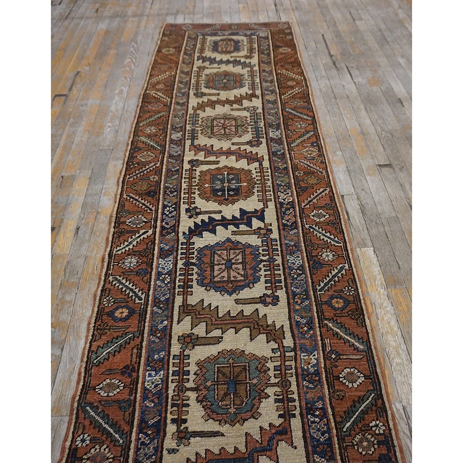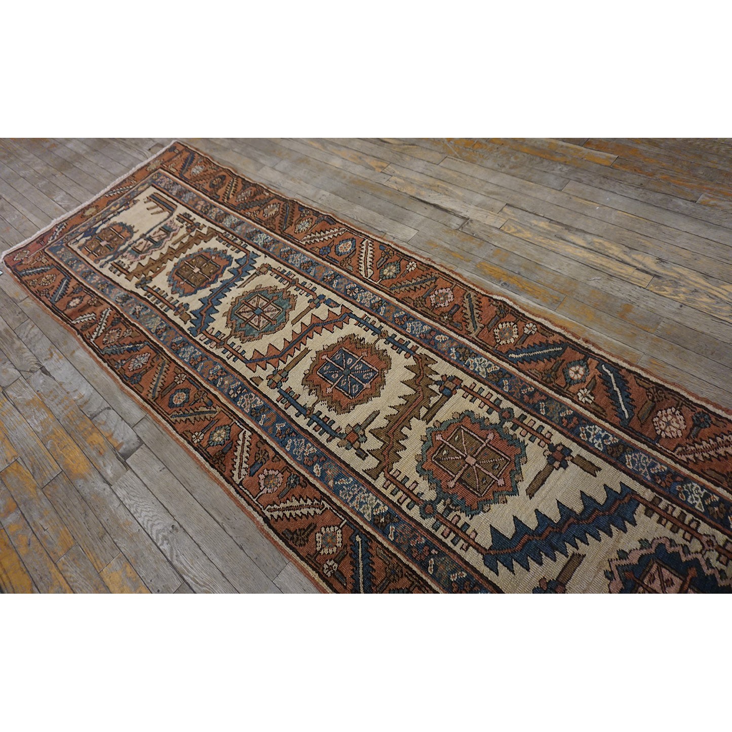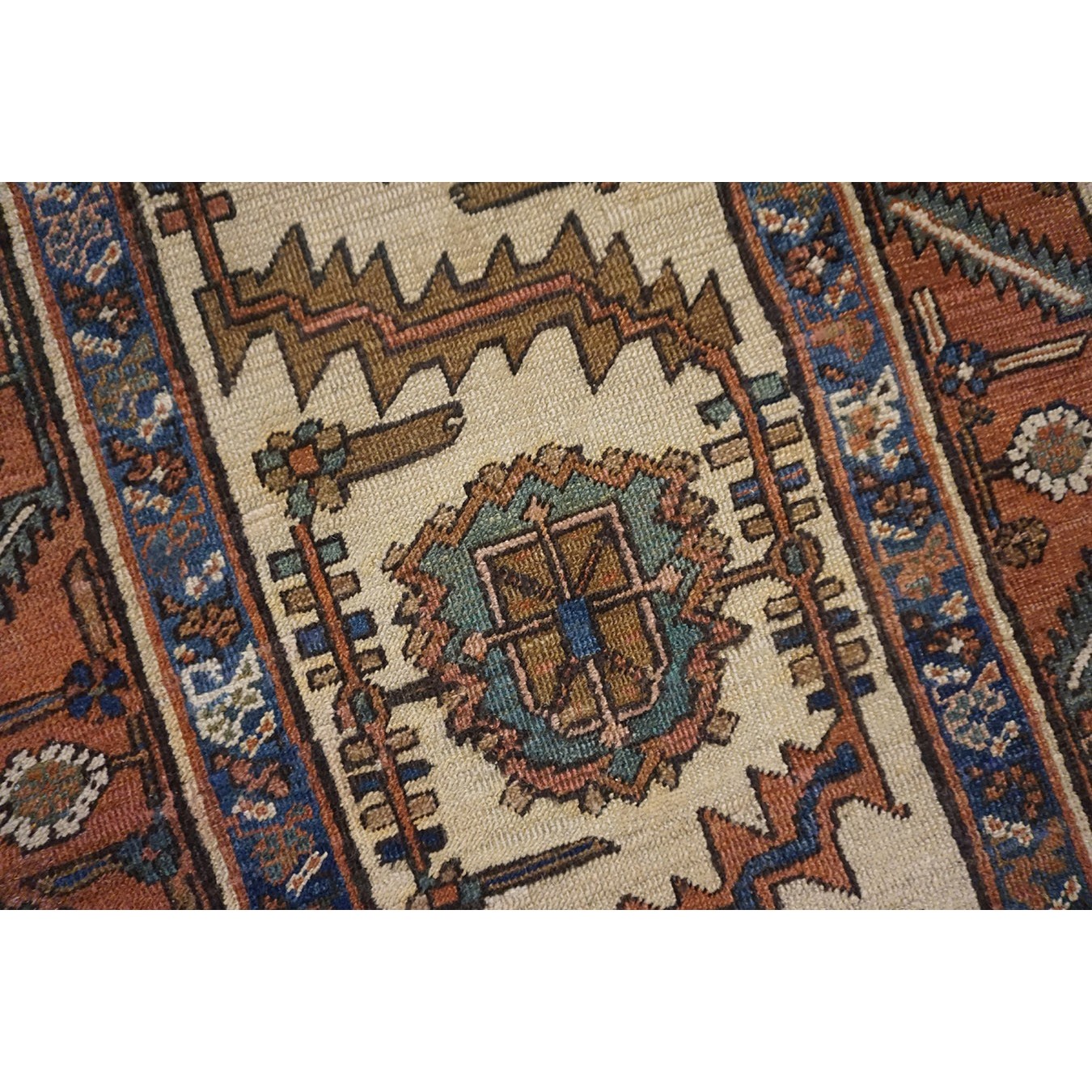 The ivory beige field shows a bracketed rosette and doubly bent leaf border pattern, with flanking red minors in the rosette and slanted, serrated leaf repeat. Exceptionally narrow and versatile. Good condition.