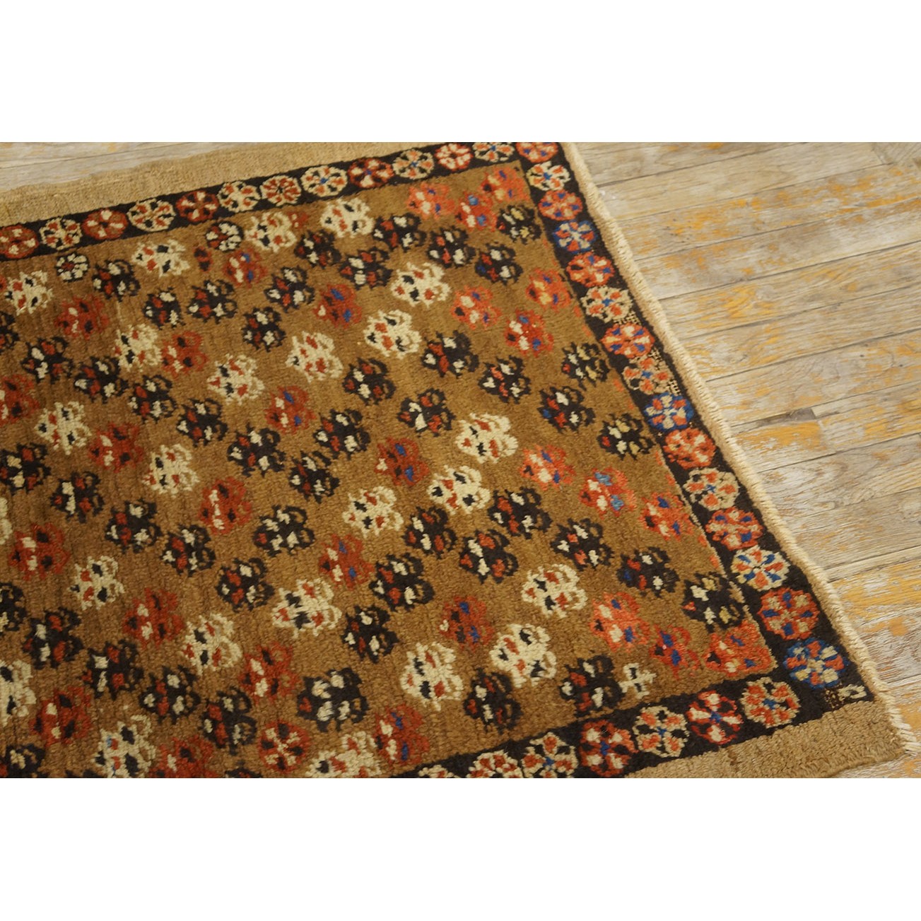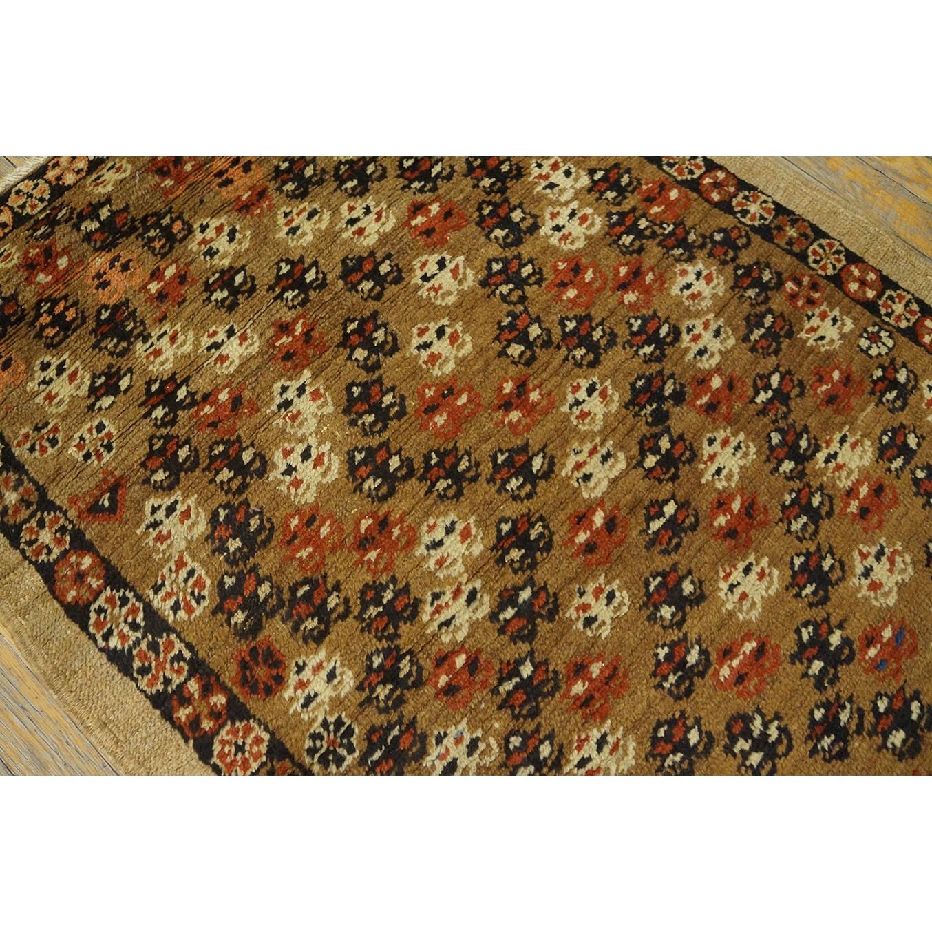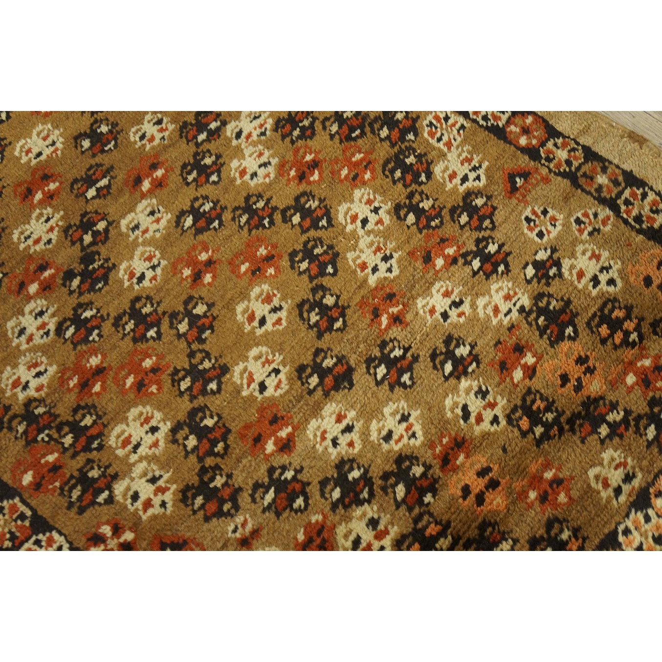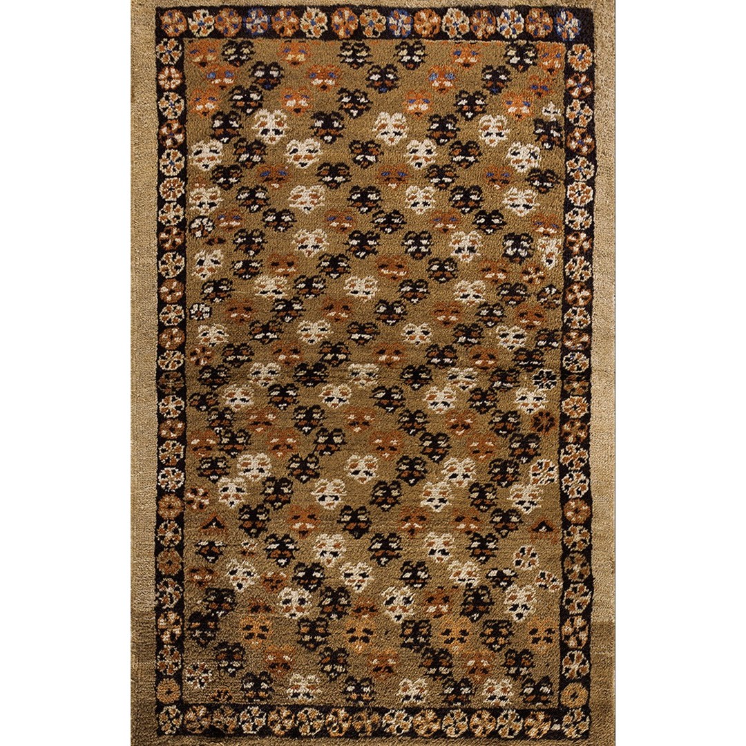 The light brown field features a fairly close scatter of uniform, little flowers accented in ivory, navy and red. Plain tan outer border and narrow dark brown rosette patterned inner.