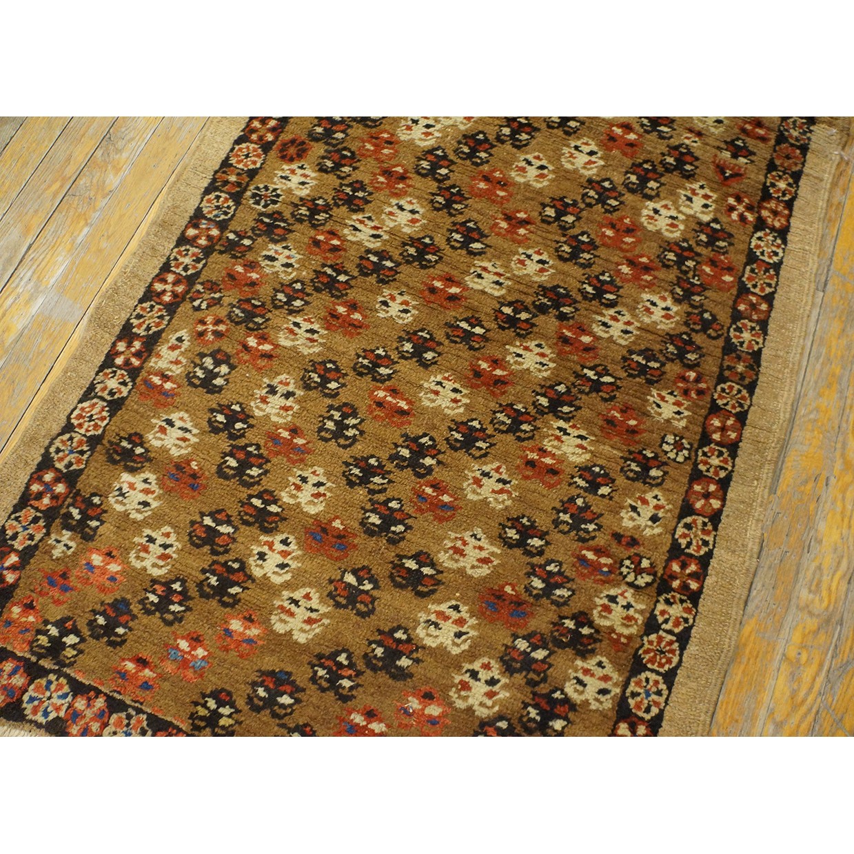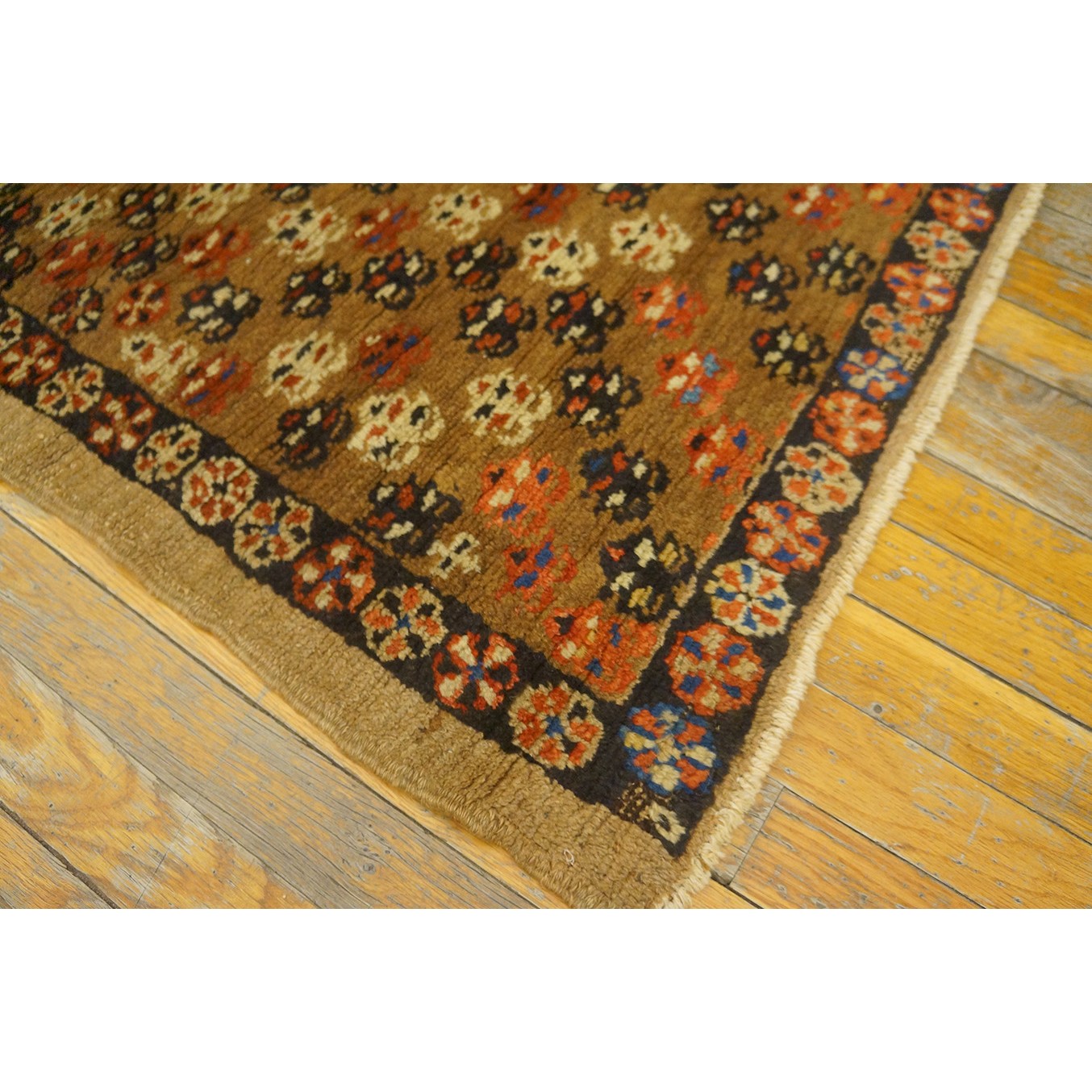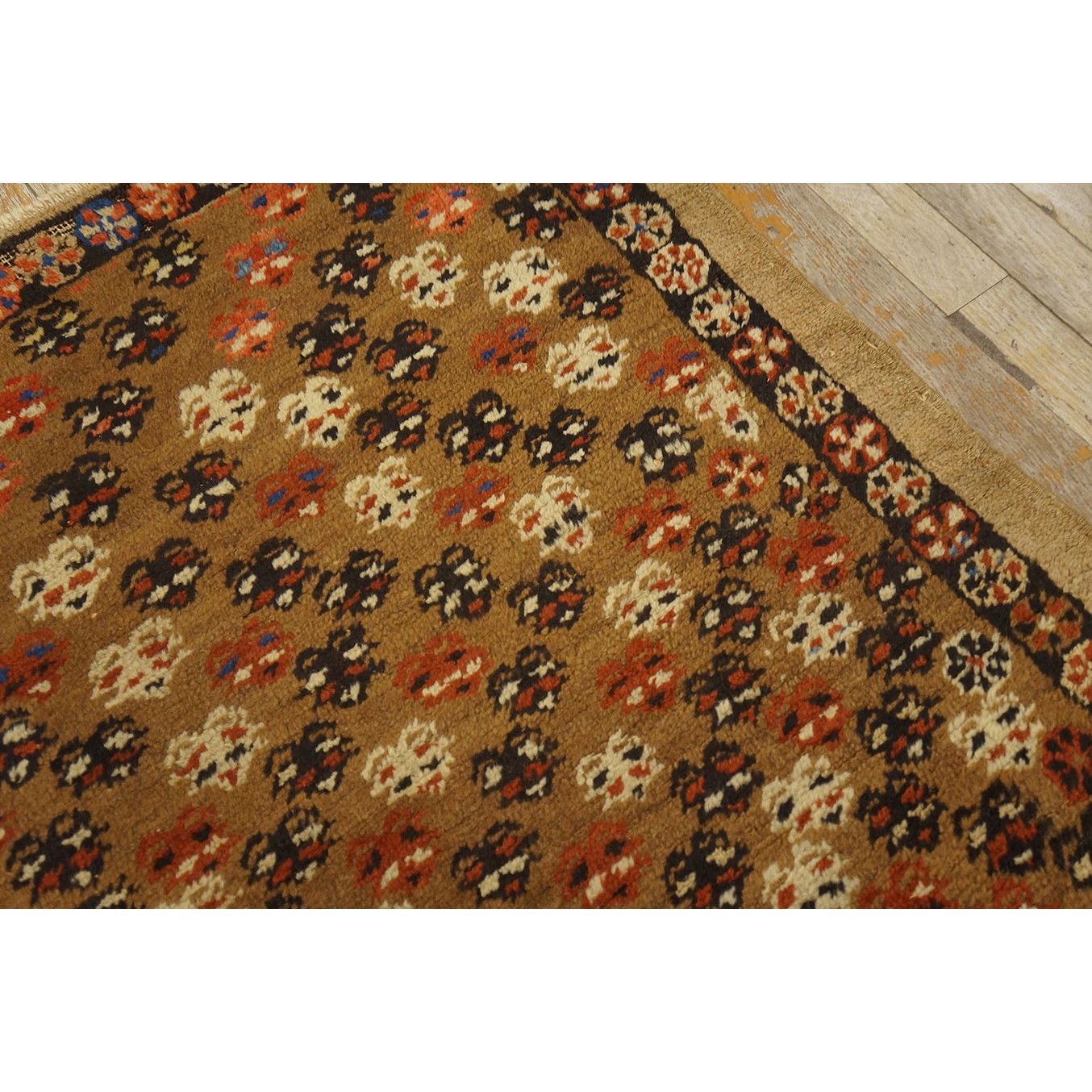 The light brown field features a fairly close scatter of uniform, little flowers accented in ivory, navy and red. Plain tan outer border and narrow dark brown rosette patterned inner.