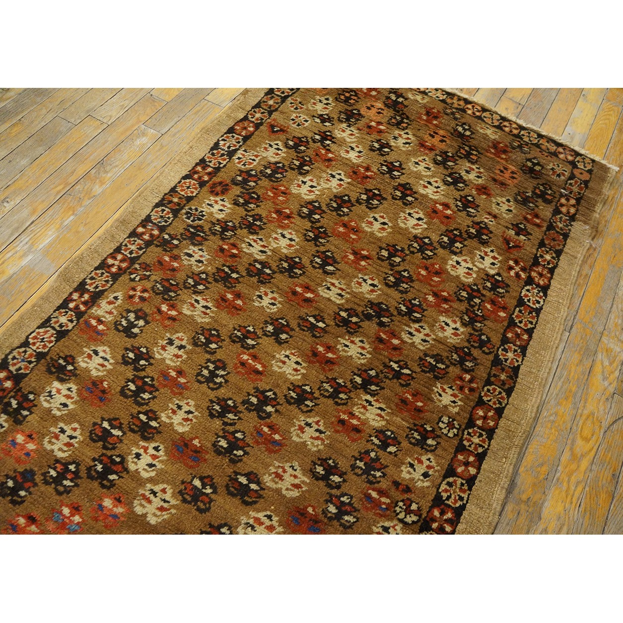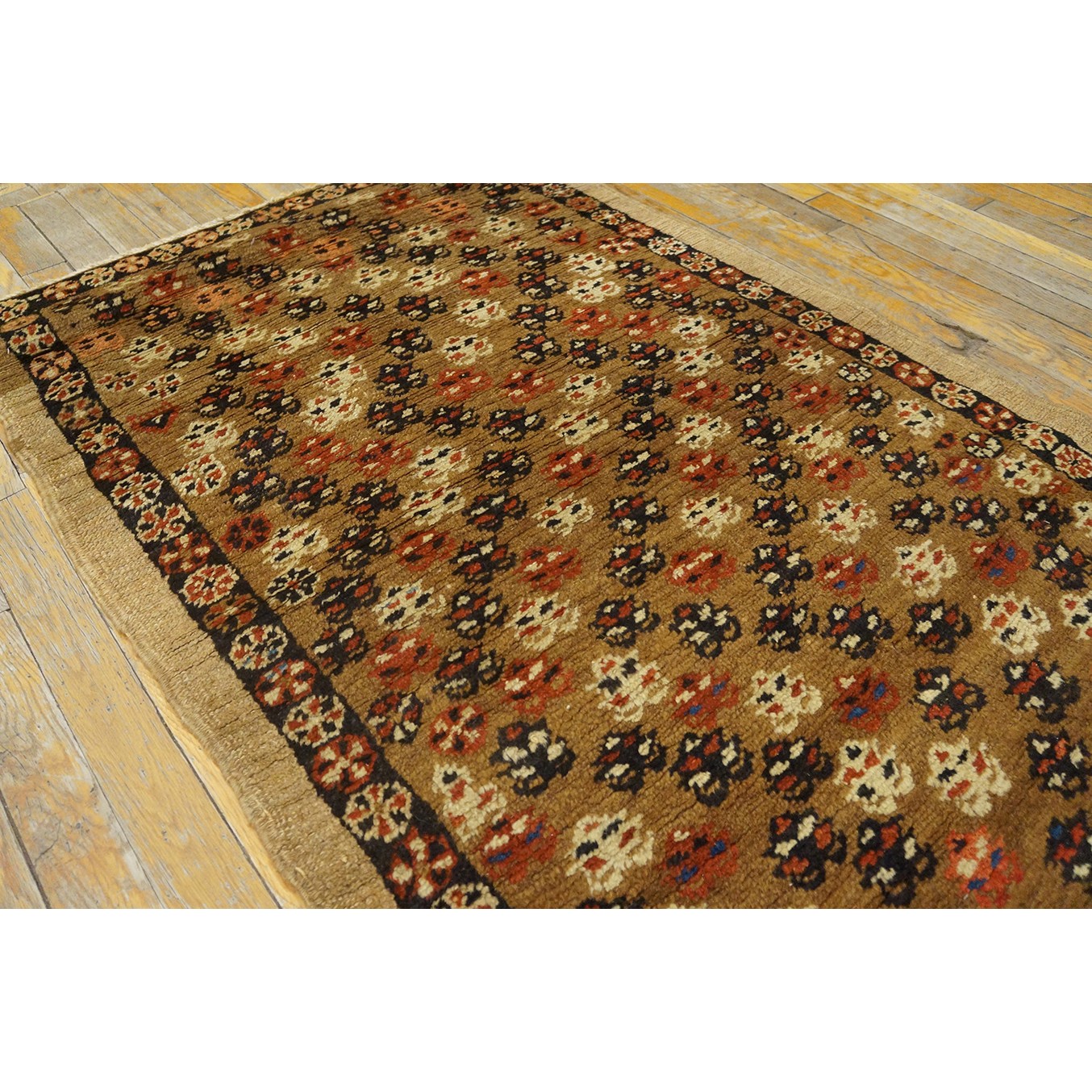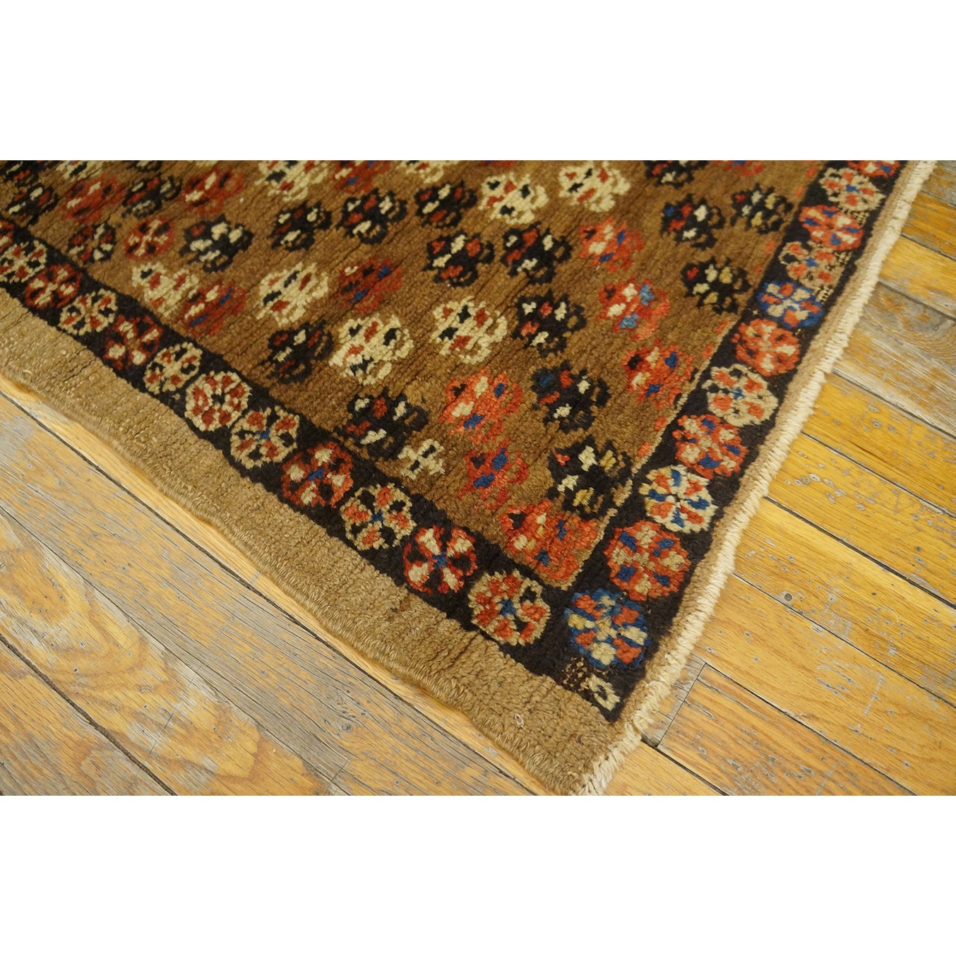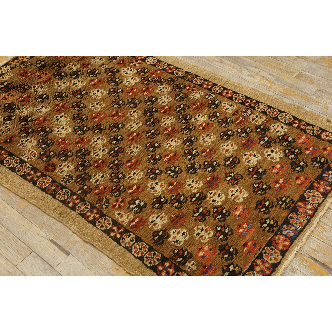 The light brown field features a fairly close scatter of uniform, little flowers accented in ivory, navy and red. Plain tan outer border and narrow dark brown rosette patterned inner.