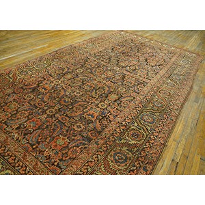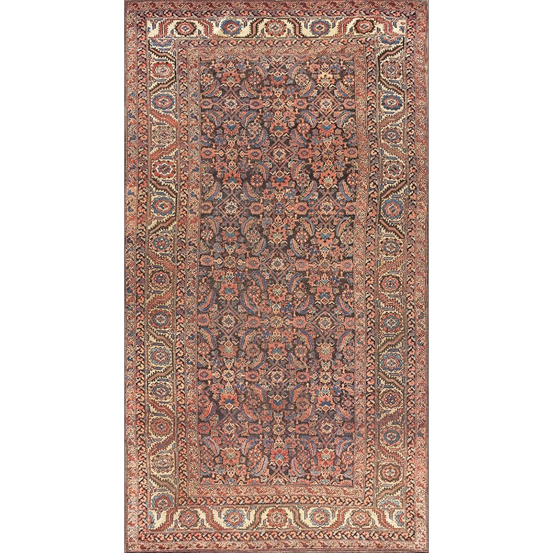 “Heriz” is a rather generic name applicable to rugs and carpets from the general area around the rustic town of Heriz and includes, as here, “Bakhshaish”, “Serapi”, “Goravan”, Bilverdi , Ahar, and various other grades, types, periods and trade appellations. This wool foundation, symmetric (Turkish) knotted long carpet from the pre-export 1860 to 1880 period shows a corroded chocolate brown field with an allover Herati design. When viewed from a distance, there is a tall, lozenge lattice over-pattern. Often the field will be dark blue with an identical pattern.