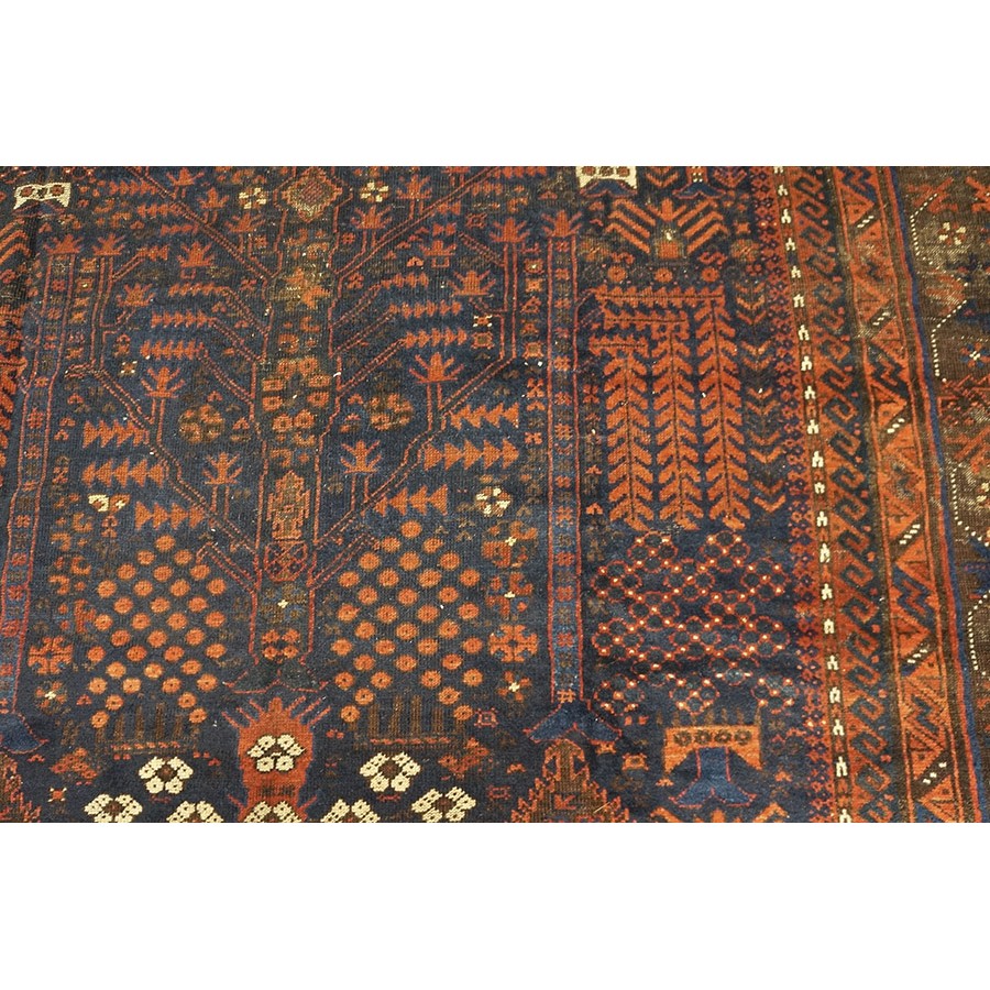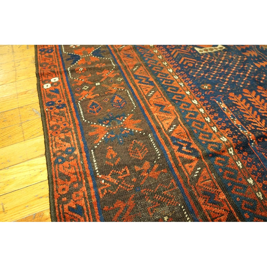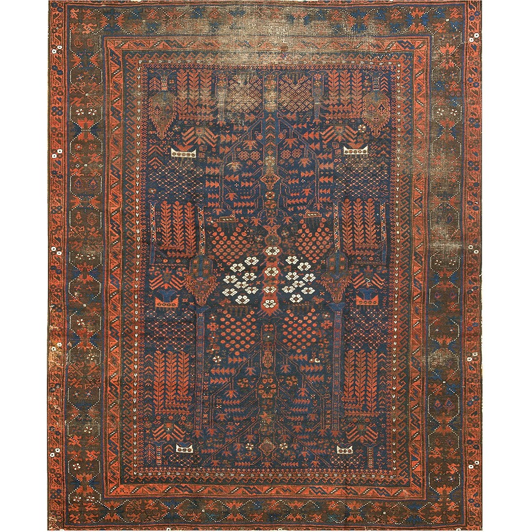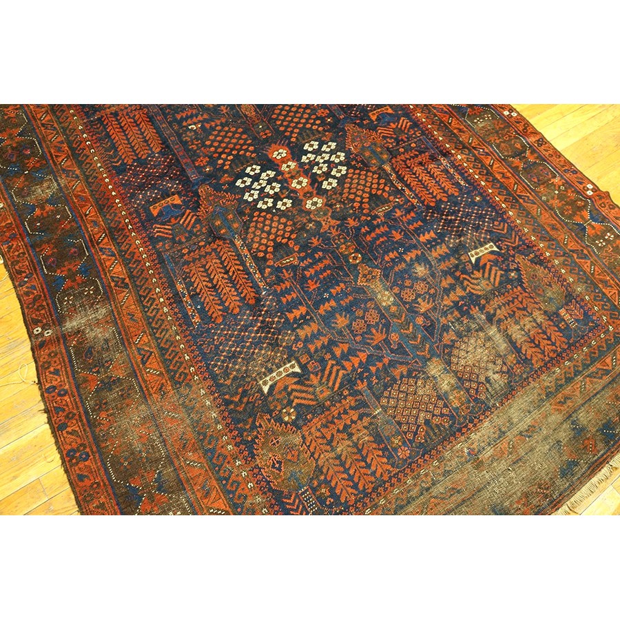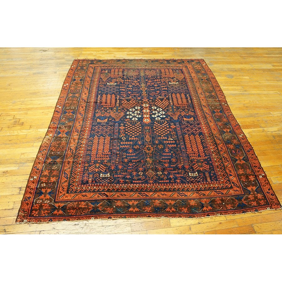 DescriptionBaluchA name given to (mostly) pile rugs woven by Indo-European Tribal groups in Easter Iran (Khorossana nd Sistan Provinces) and Northwest Afghanistan (Herat Prov.). The true Baluch tribes of Baluchistan do not weave pile rugs of excellent wool, the sizes tend to be small, up to 5 x 7, with a few older large carpets. The tones are dark blues, camel, reds and purples with white accents. In older pieces the colors are jewel-like and the texture is velvety. The tribes dwell in black goat-hair tents and migrate seasonally. Saddlebags, pillows, animal trappings and other small items are woven. Camelfield player rugs are particularly characteristic and desirable. Most examples are inexpensive, but a serious collector market exists for the best. | |