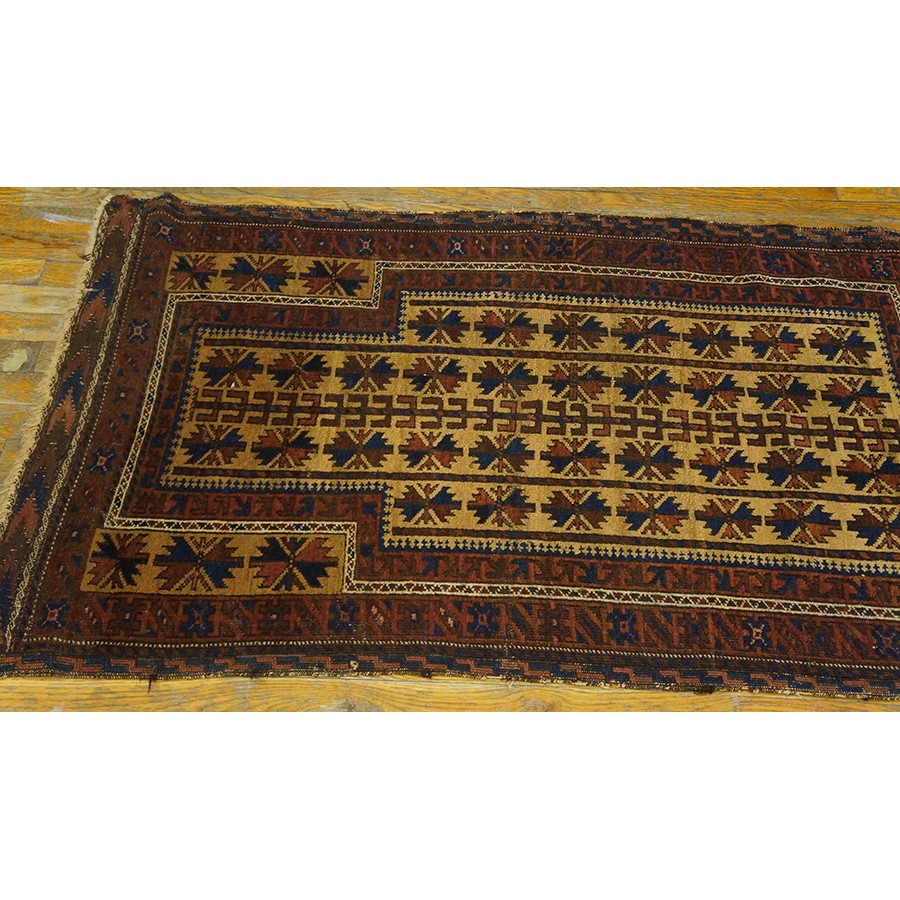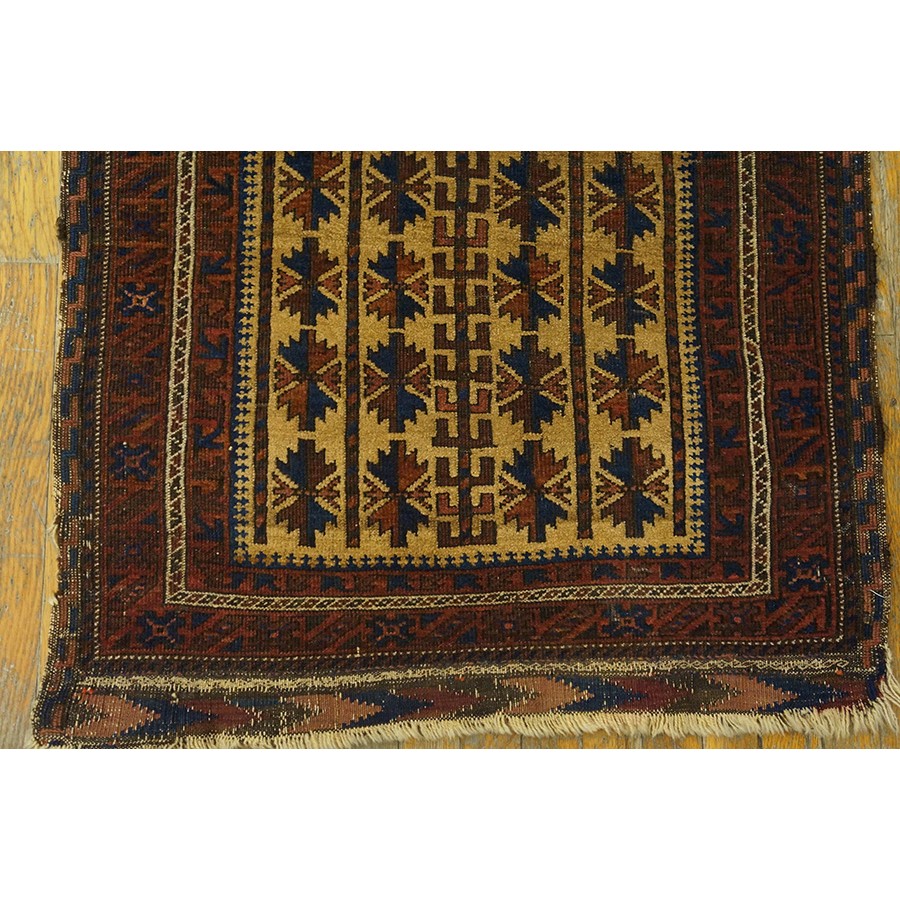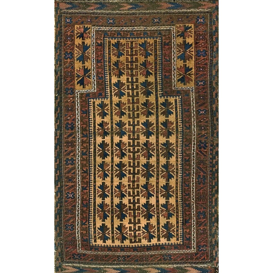 DescriptionBaluchA name given to (mostly) pile rugs woven by Indo-European Tribal groups in Easter Iran (Khorossana nd Sistan Provinces) and Northwest Afghanistan (Herat Prov.). The true Baluch tribes of Baluchistan do not weave pile rugs of excellent wool, the sizes tend to be small, up to 5 x 7, with a few older large carpets. The tones are dark blues, camel, reds and purples with white accents. In older pieces the colors are jewel-like and the texture is velvety. The tribes dwell in black goat-hair tents and migrate seasonally. Saddlebags, pillows, animal trappings and other small items are woven. Camelfield player rugs are particularly characteristic and desirable. Most examples are inexpensive, but a serious collector market exists for the best. | |