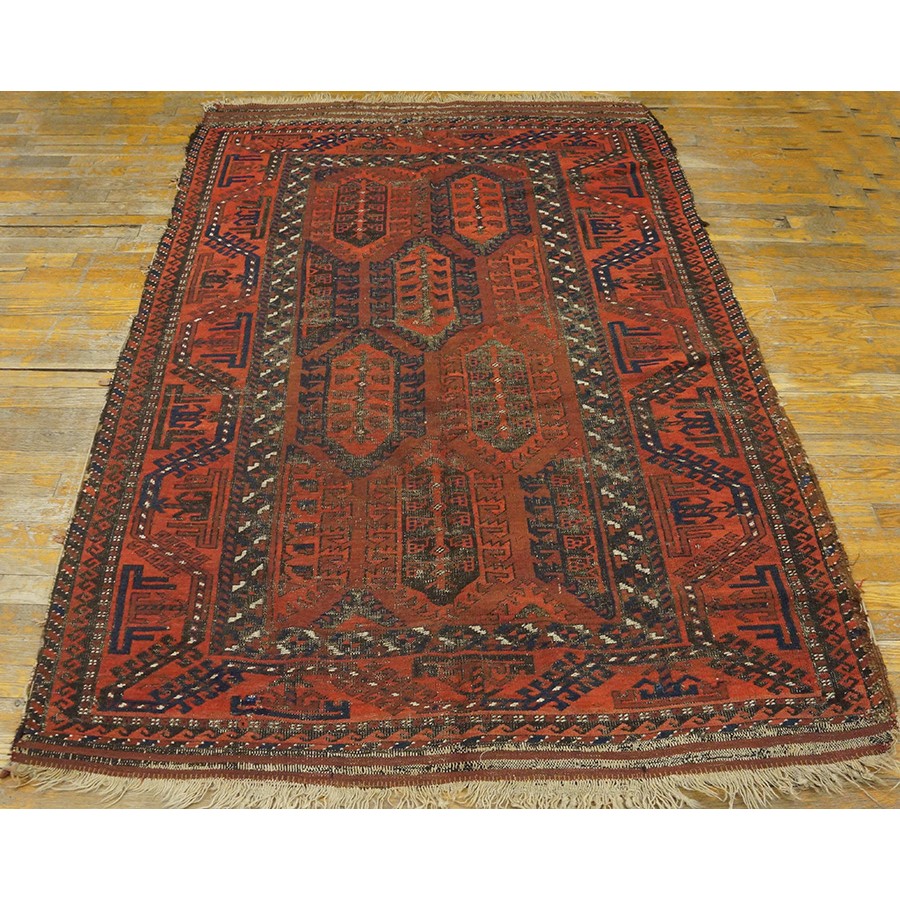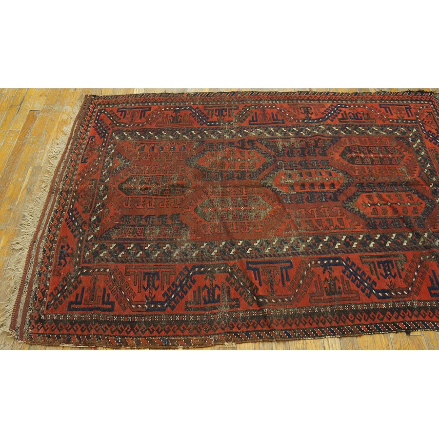 DescriptionBaluchA name given to (mostly) pile rugs woven by Indo-European Tribal groups in Easter Iran (Khorossana nd Sistan Provinces) and Northwest Afghanistan (Herat Prov.). The true Baluch tribes of Baluchistan do not weave pile rugs of excellent wool, the sizes tend to be small, up to 5 x 7, with a few older large carpets. The tones are dark blues, camel, reds and purples with white accents. In older pieces the colors are jewel-like and the texture is velvety. The tribes dwell in black goat-hair tents and migrate seasonally. Saddlebags, pillows, animal trappings and other small items are woven. Camelfield player rugs are particularly characteristic and desirable. Most examples are inexpensive, but a serious collector market exists for the best. | |