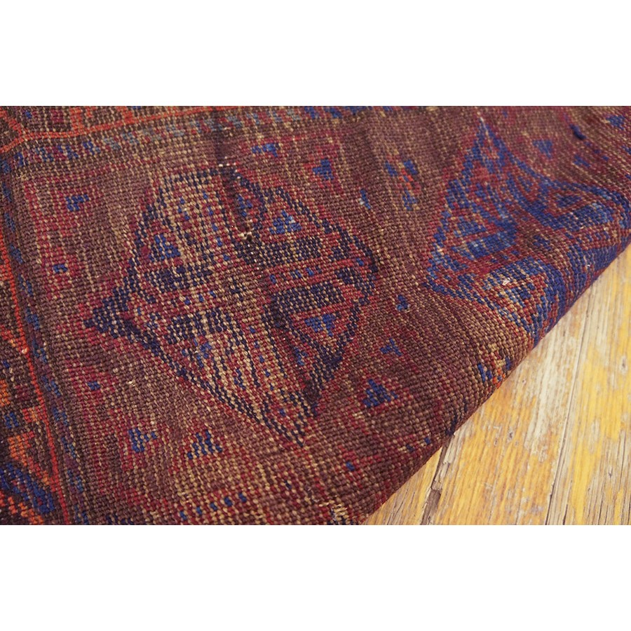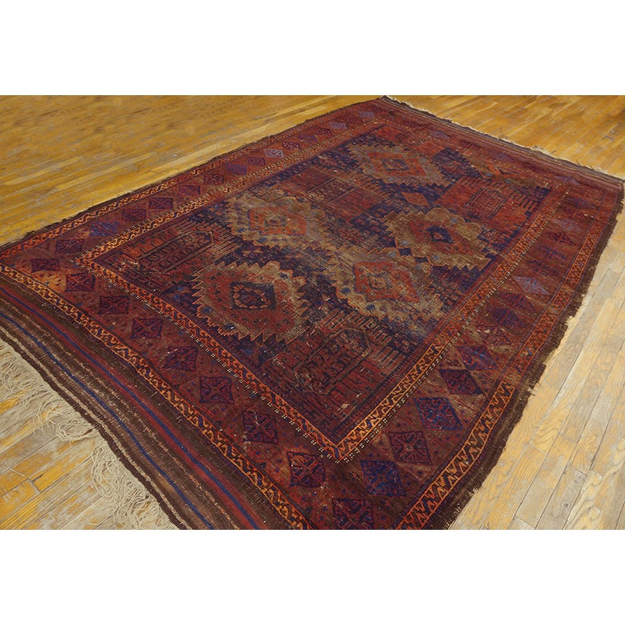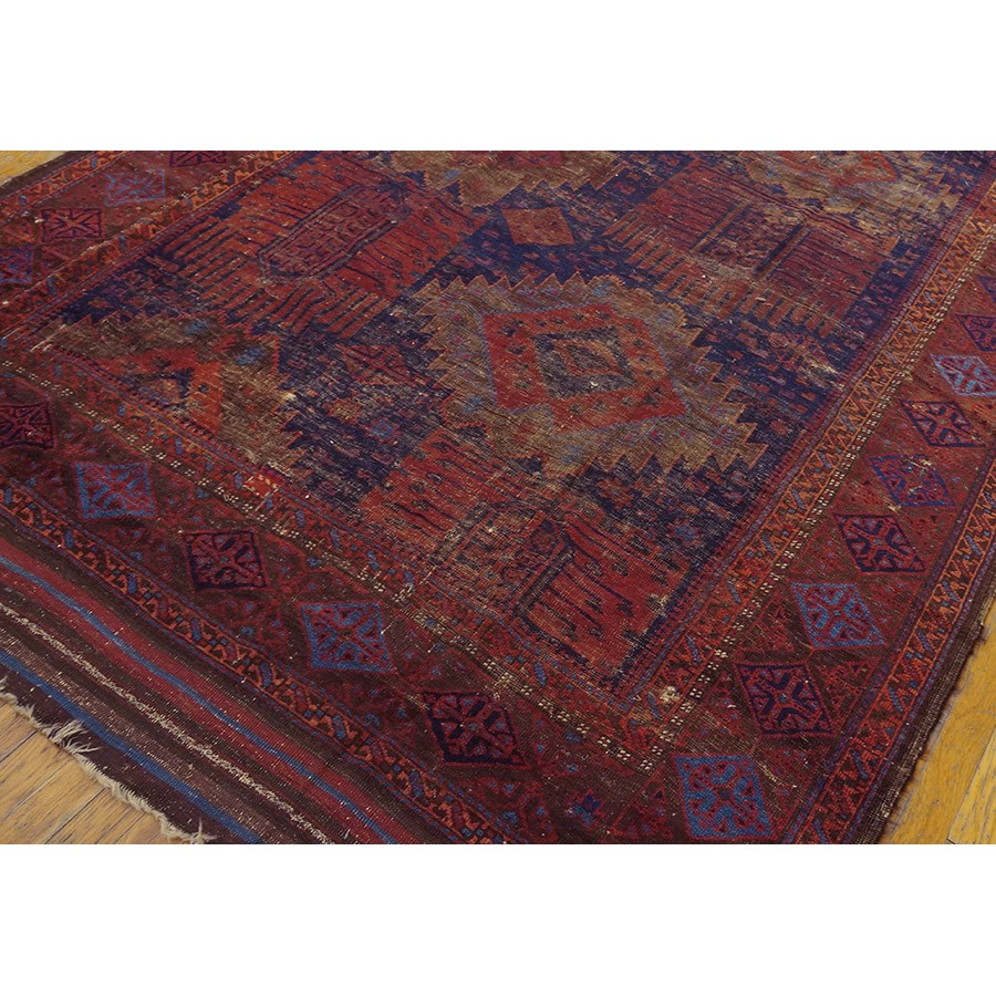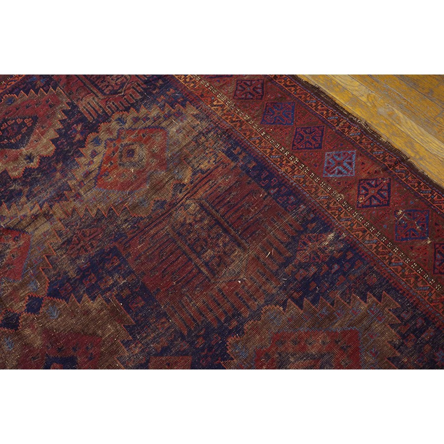 DescriptionBaluchA name given to (mostly) pile rugs woven by Indo-European Tribal groups in Easter Iran (Khorossana nd Sistan Provinces) and Northwest Afghanistan (Herat Prov.). The true Baluch tribes of Baluchistan do not weave pile rugs of excellent wool, the sizes tend to be small, up to 5 x 7, with a few older large carpets. The tones are dark blues, camel, reds and purples with white accents. In older pieces the colors are jewel-like and the texture is velvety. The tribes dwell in black goat-hair tents and migrate seasonally. Saddlebags, pillows, animal trappings and other small items are woven. Camelfield player rugs are particularly characteristic and desirable. Most examples are inexpensive, but a serious collector market exists for the best. | |