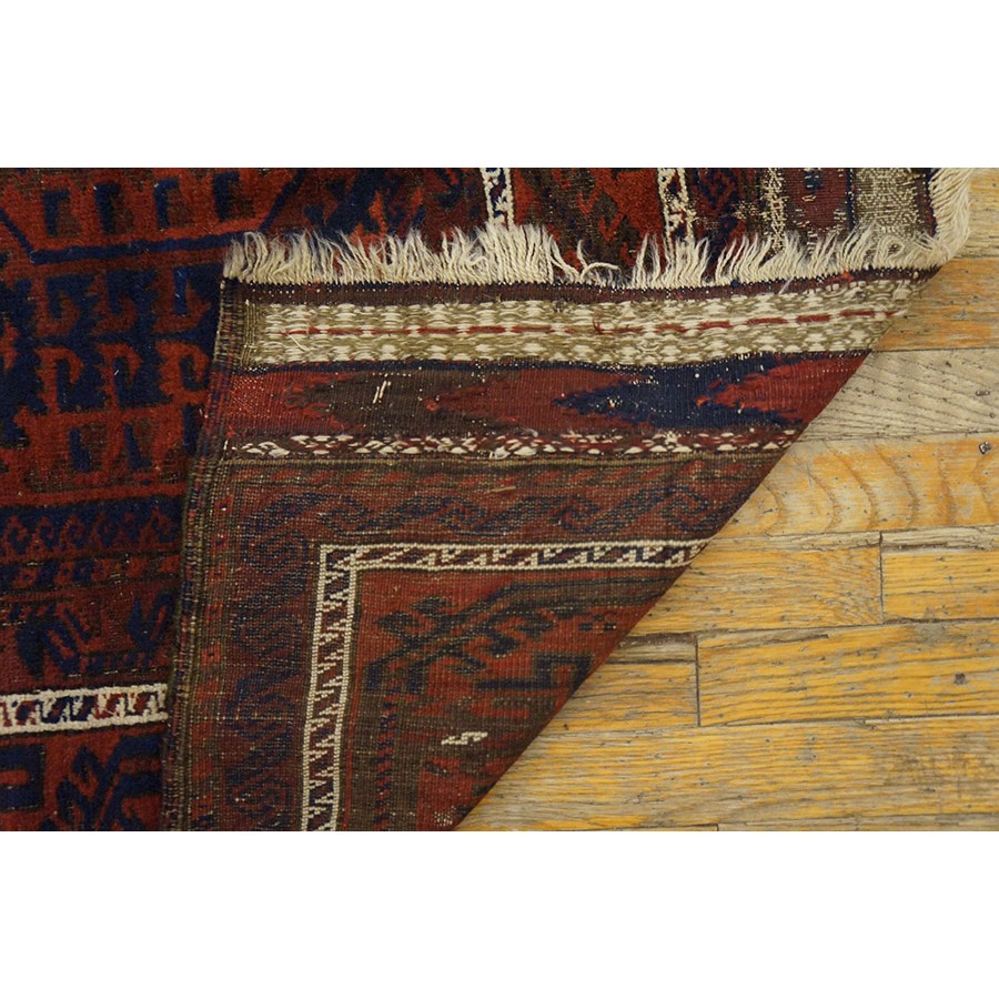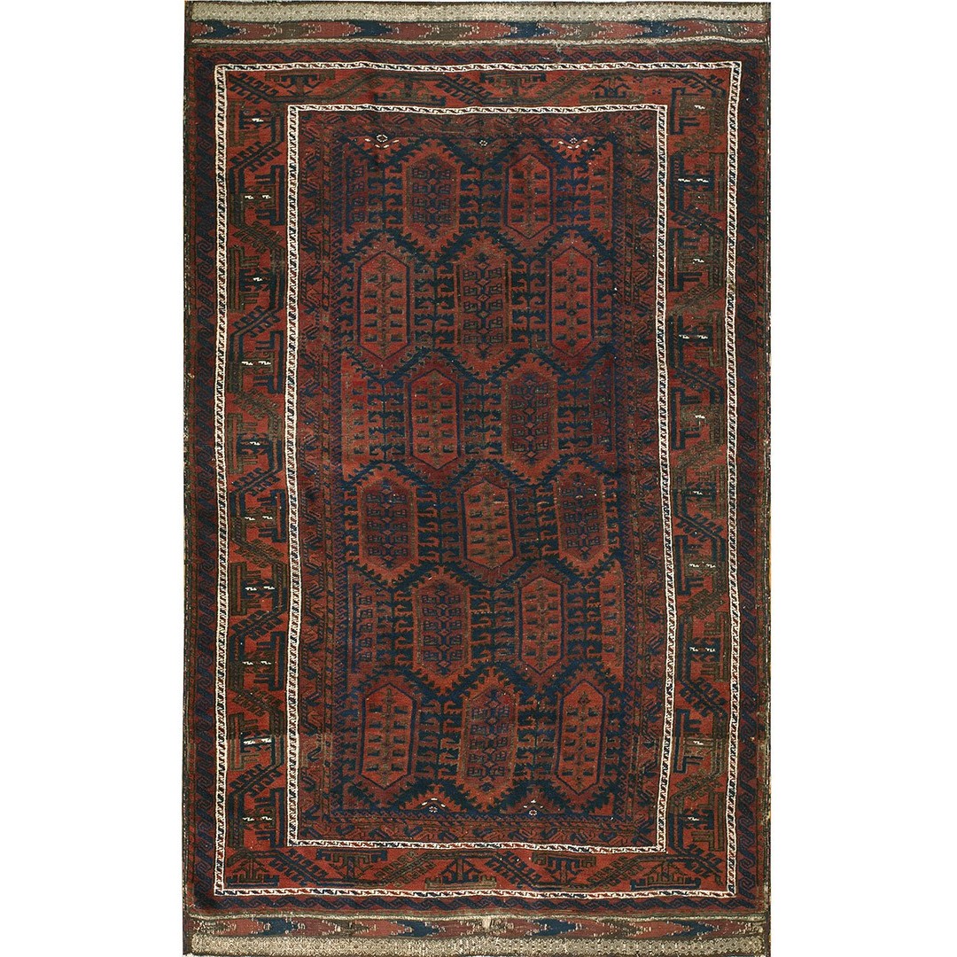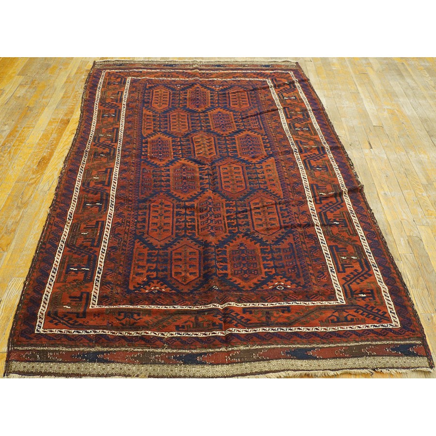 DescriptionBaluchA name given to (mostly) pile rugs woven by Indo-European Tribal groups in Easter Iran (Khorossana nd Sistan Provinces) and Northwest Afghanistan (Herat Prov.). The true Baluch tribes of Baluchistan do not weave pile rugs of excellent wool, the sizes tend to be small, up to 5 x 7, with a few older large carpets. The tones are dark blues, camel, reds and purples with white accents. In older pieces the colors are jewel-like and the texture is velvety. The tribes dwell in black goat-hair tents and migrate seasonally. Saddlebags, pillows, animal trappings and other small items are woven. Camelfield player rugs are particularly characteristic and desirable. Most examples are inexpensive, but a serious collector market exists for the best. | |