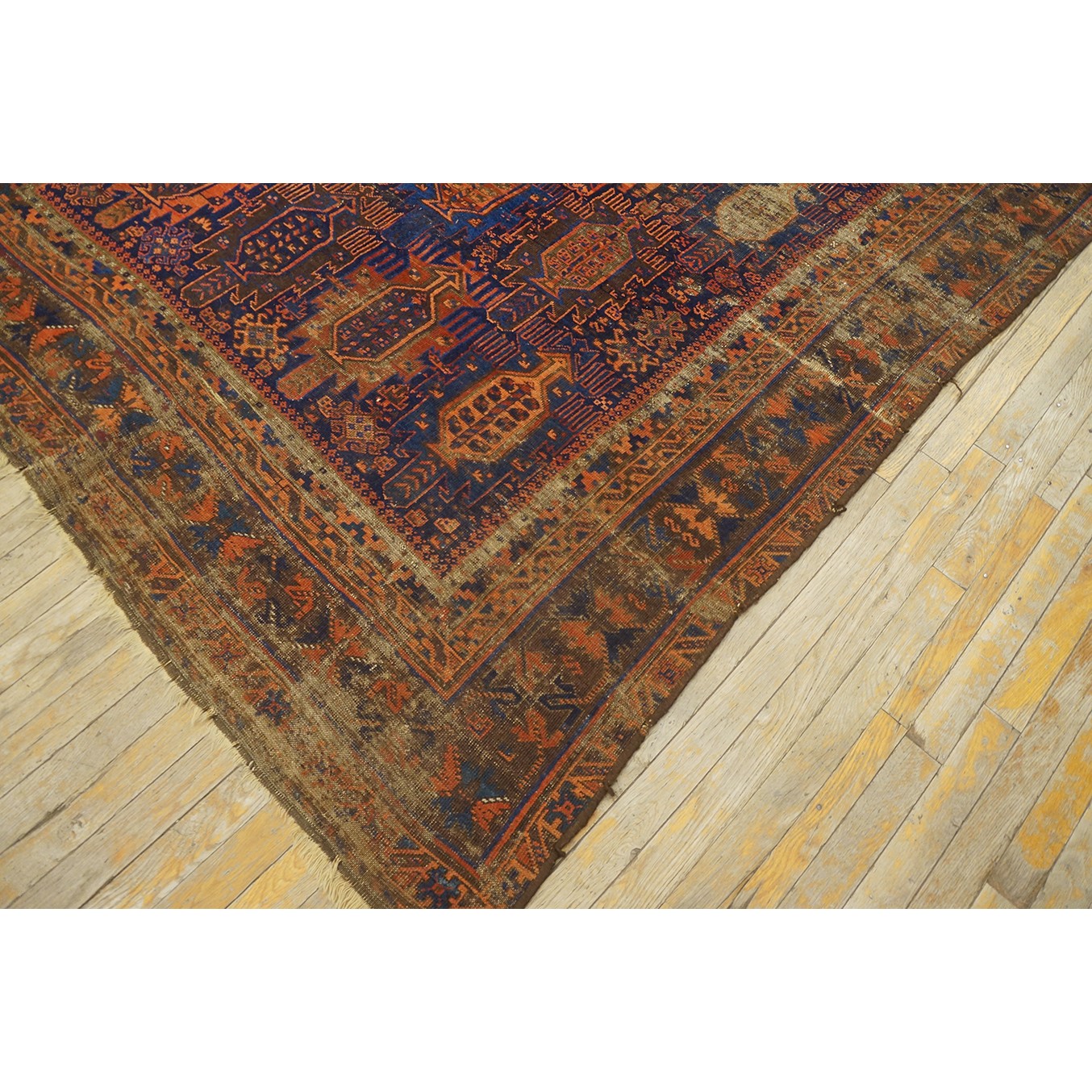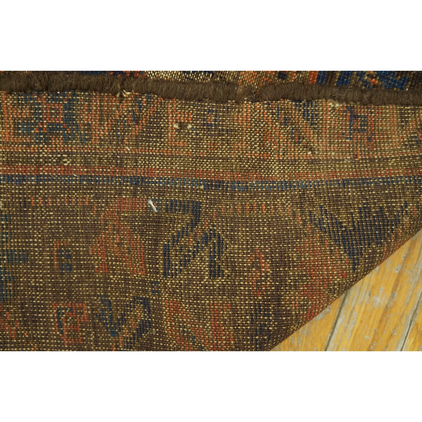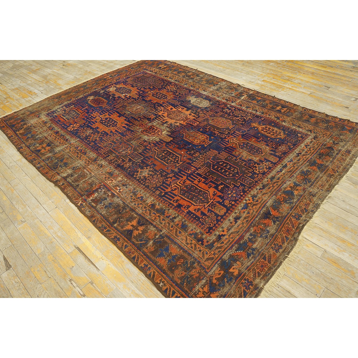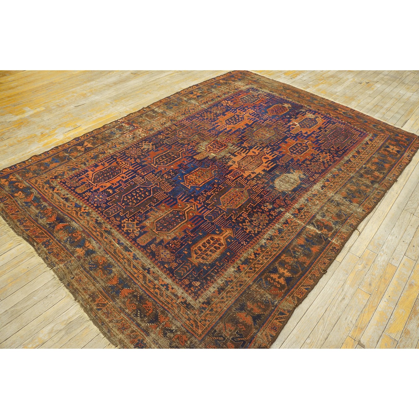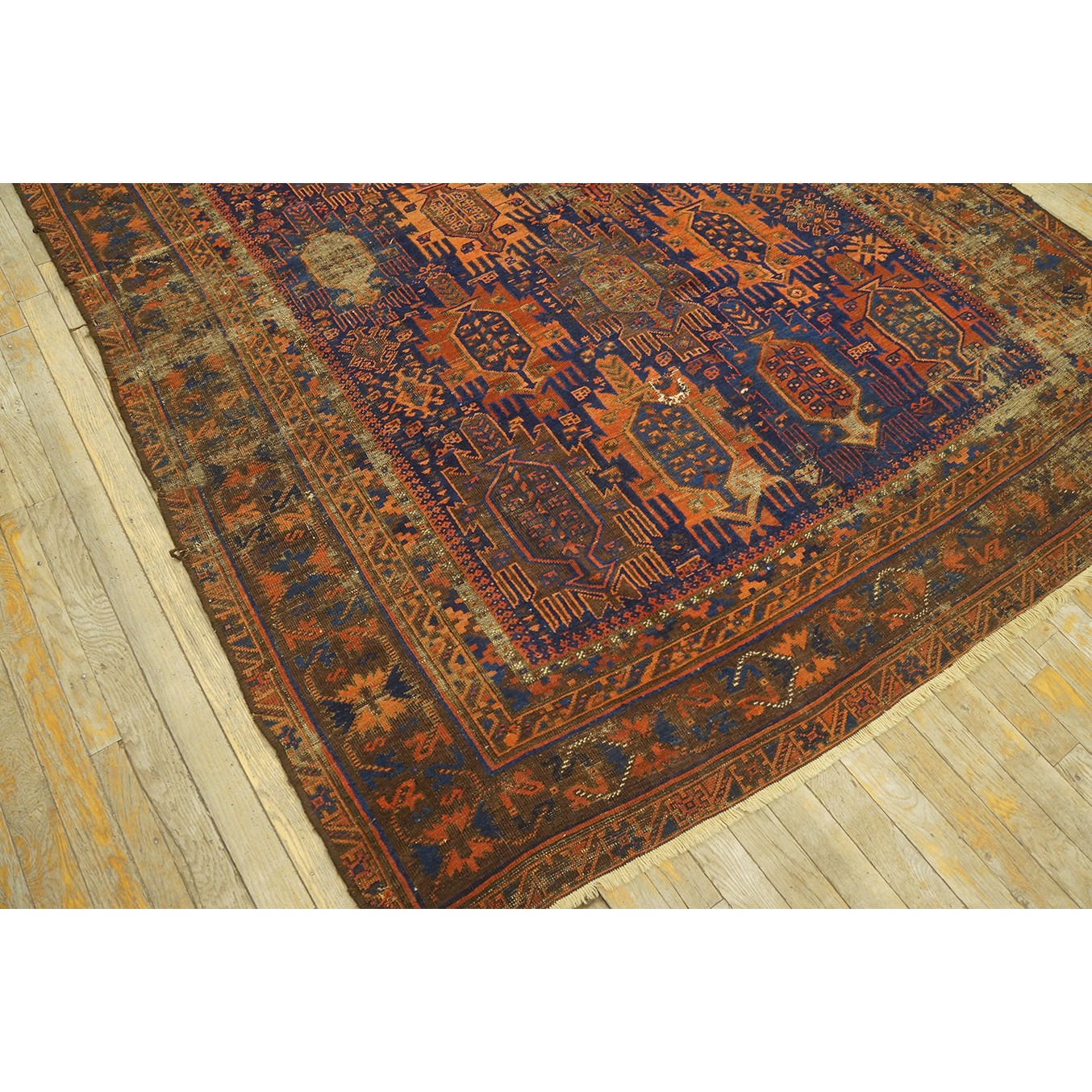 DescriptionBaluchA name given to (mostly) pile rugs woven by Indo-European Tribal groups in Easter Iran (Khorossana nd Sistan Provinces) and Northwest Afghanistan (Herat Prov.). The true Baluch tribes of Baluchistan do not weave pile rugs of excellent wool, the sizes tend to be small, up to 5 x 7, with a few older large carpets. The tones are dark blues, camel, reds and purples with white accents. In older pieces the colors are jewel-like and the texture is velvety. The tribes dwell in black goat-hair tents and migrate seasonally. Saddlebags, pillows, animal trappings and other small items are woven. Camelfield player rugs are particularly characteristic and desirable. Most examples are inexpensive, but a serious collector market exists for the best. | |