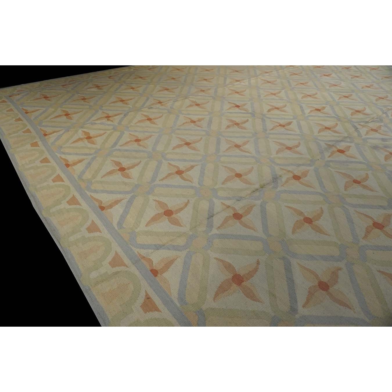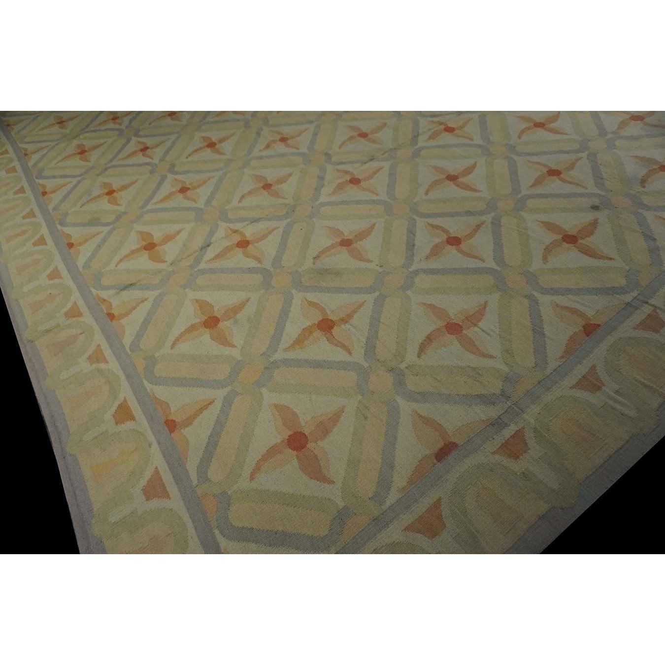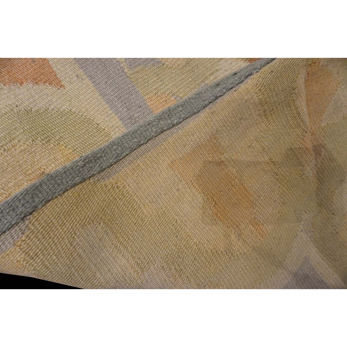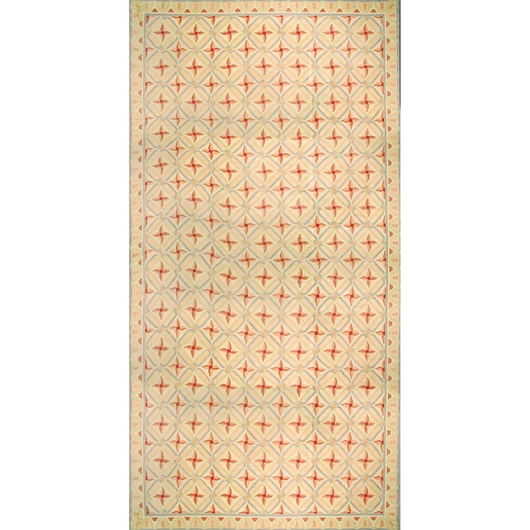 This enormous antique Moldovan carpet is a stuffy in the artistic use of yellow: as a field tone in an all-over diamond lattice, each unit enclosing a two-tone pinwheel cross; in a narrow border with triangles and pale blue arches. The pattern disappears under the border, giving it a sense of infinite expanse and making an already enormous carpet appear even larger.