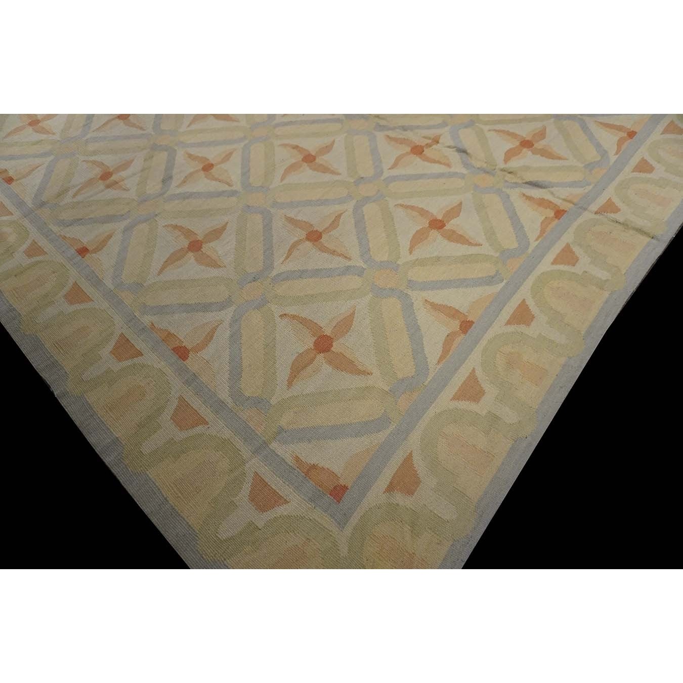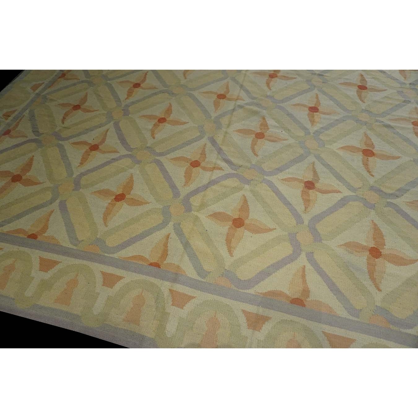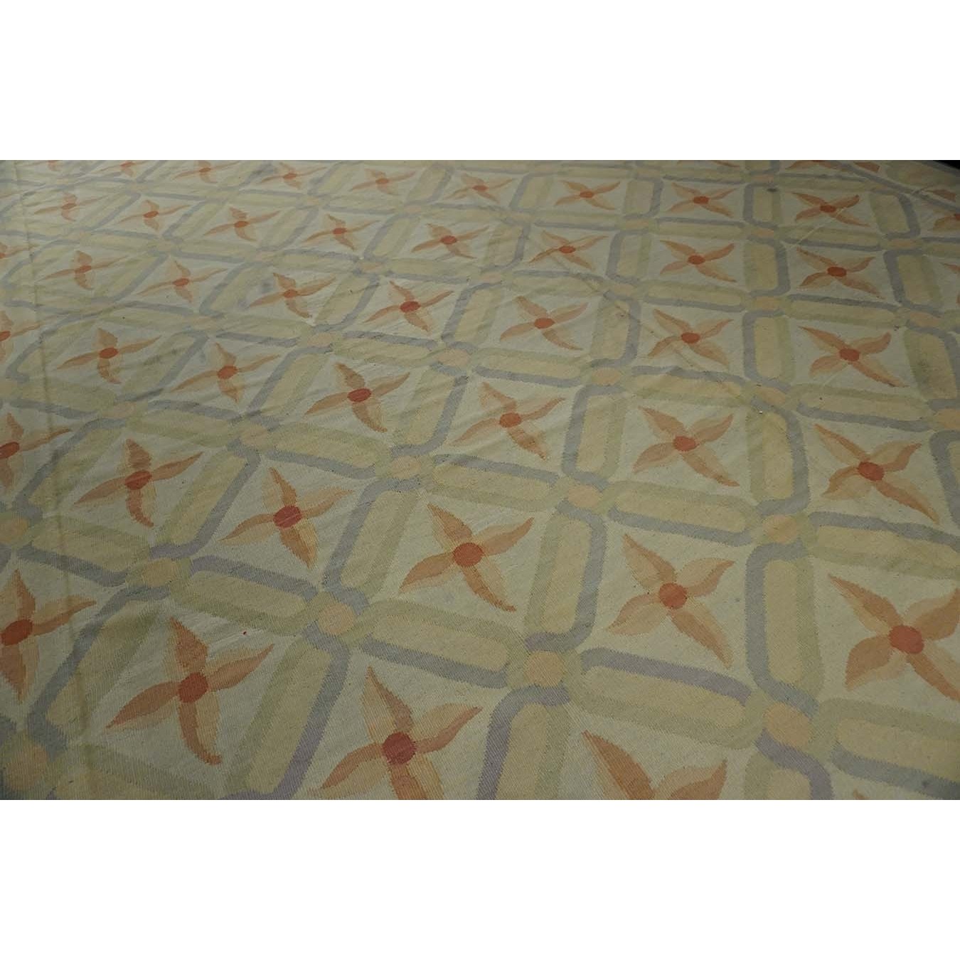 This enormous antique Moldovan carpet is a stuffy in the artistic use of yellow: as a field tone in an all-over diamond lattice, each unit enclosing a two-tone pinwheel cross; in a narrow border with triangles and pale blue arches. The pattern disappears under the border, giving it a sense of infinite expanse and making an already enormous carpet appear even larger.